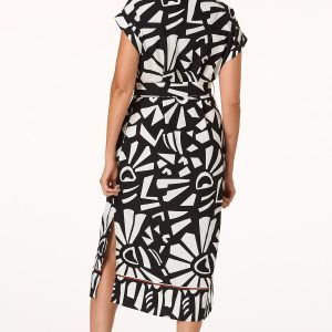 Step into style with this black and white geometric midi dress, featuring a partial button-down front, side seam pockets, and a removable tie belt that defines your waist.