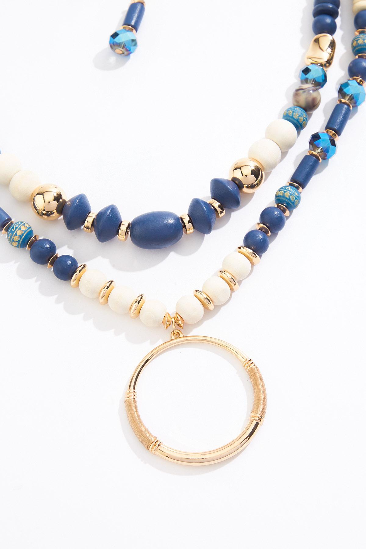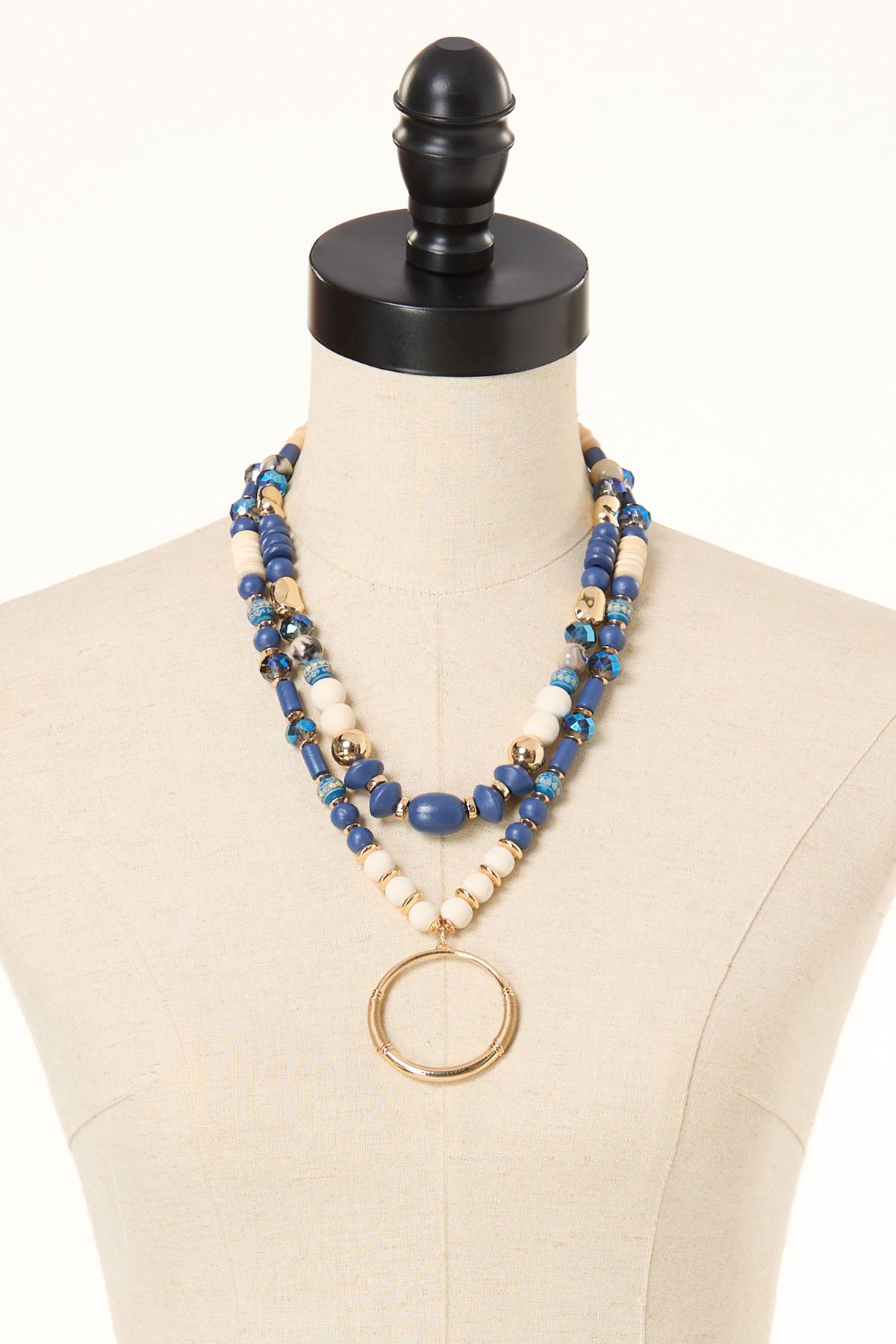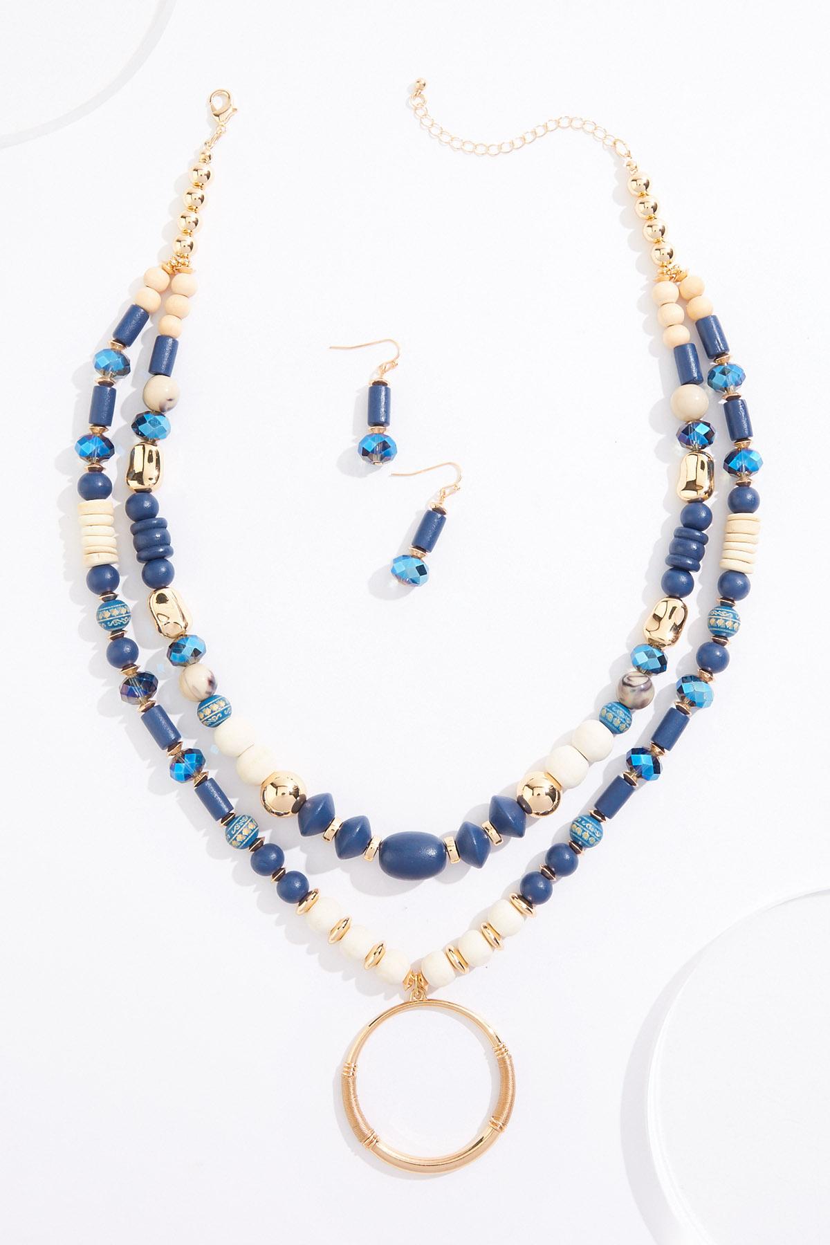 Blue Wood Ring Pendant Necklace Set
