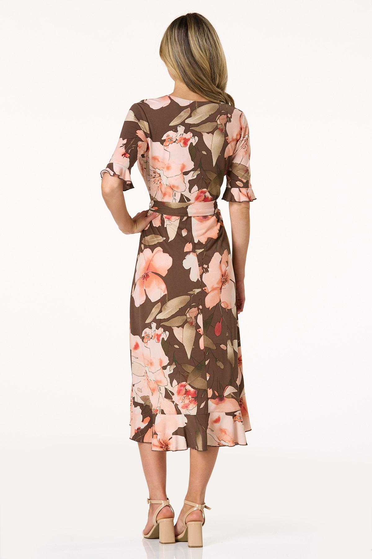 Elegant and the total package, this dress is exactly what your wardrobe needs for a work to out-of-work vibe that’s truly breathtaking. A surplice, v-neckline, belted-tie waist, ruffled sleeves and shades of blush and beige are the reasons this one will leave you smitten with this flattering-stretch style.