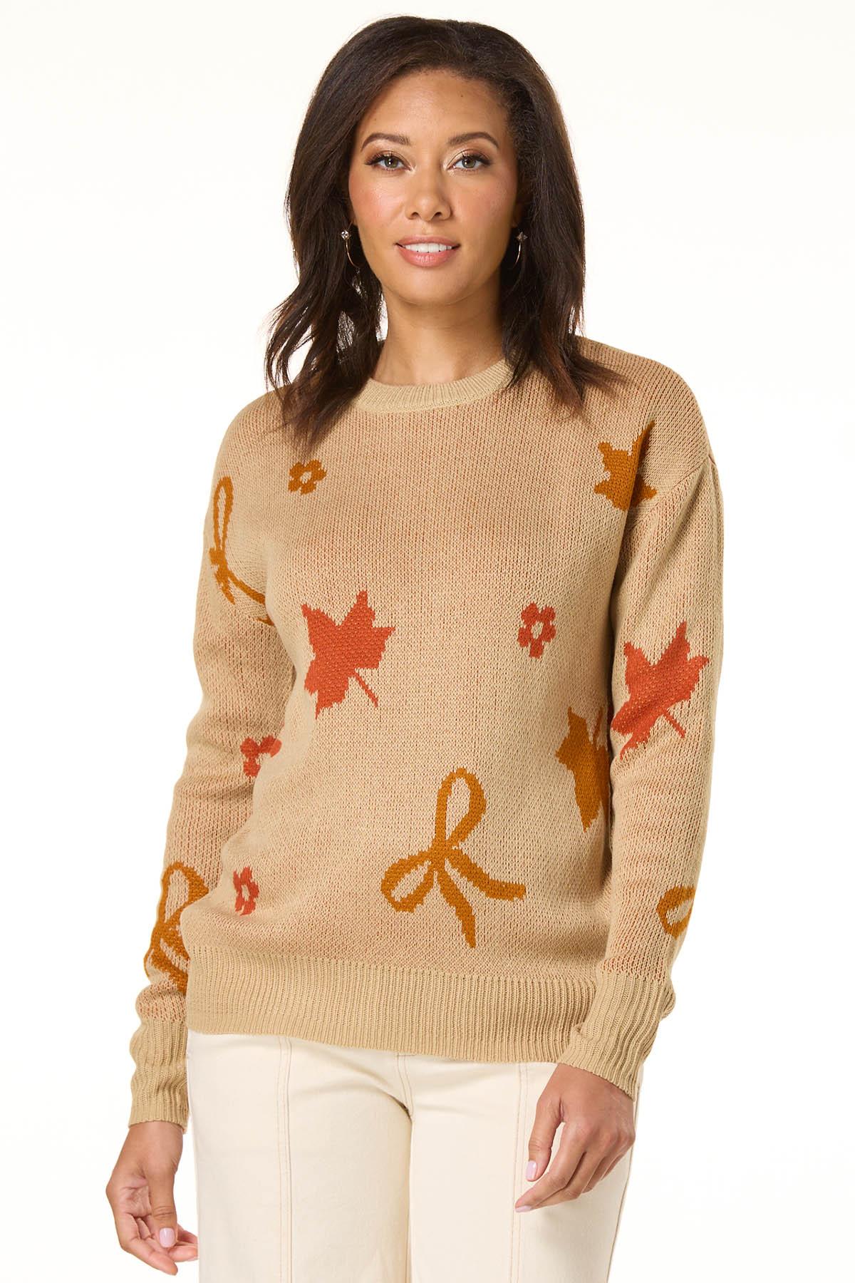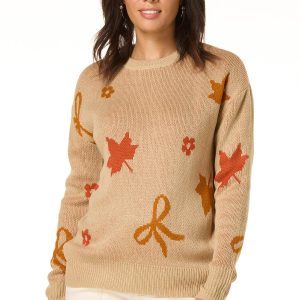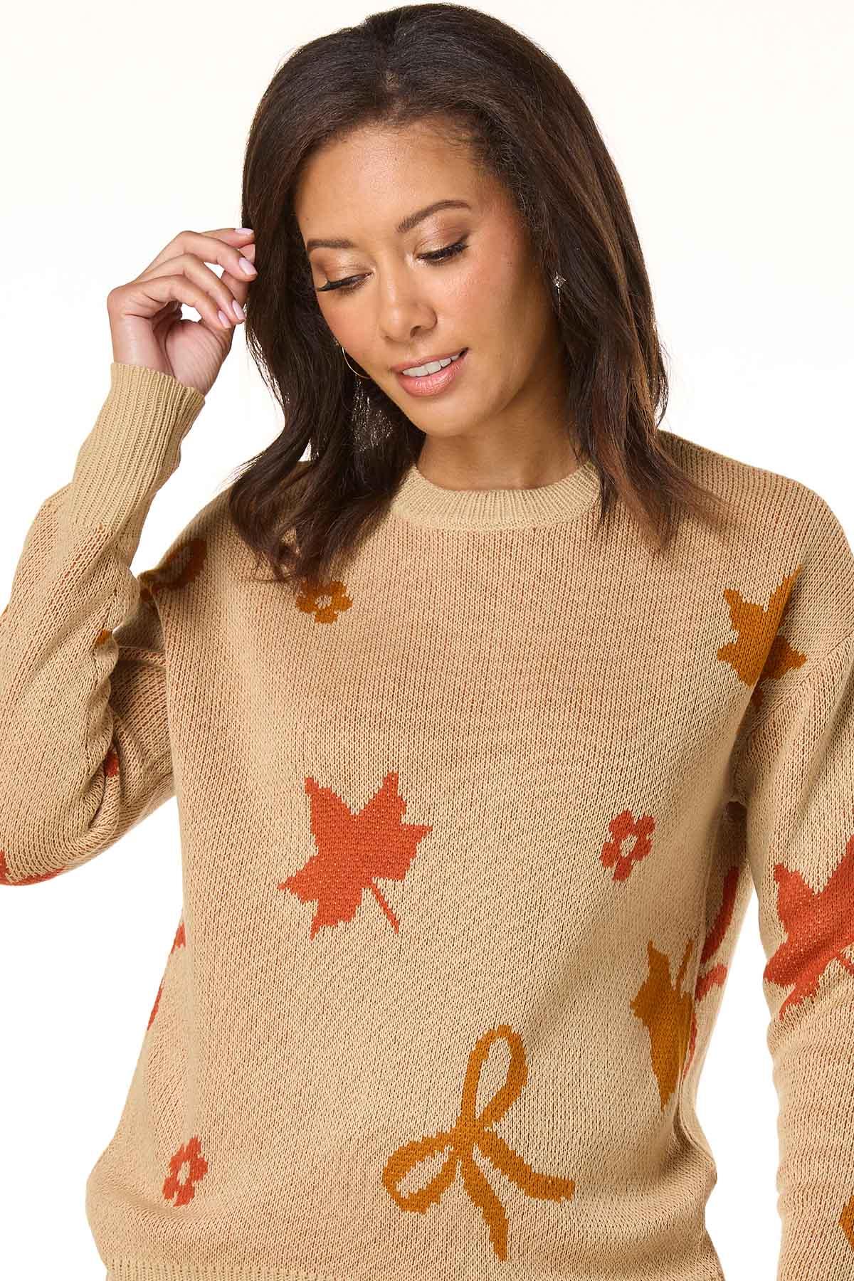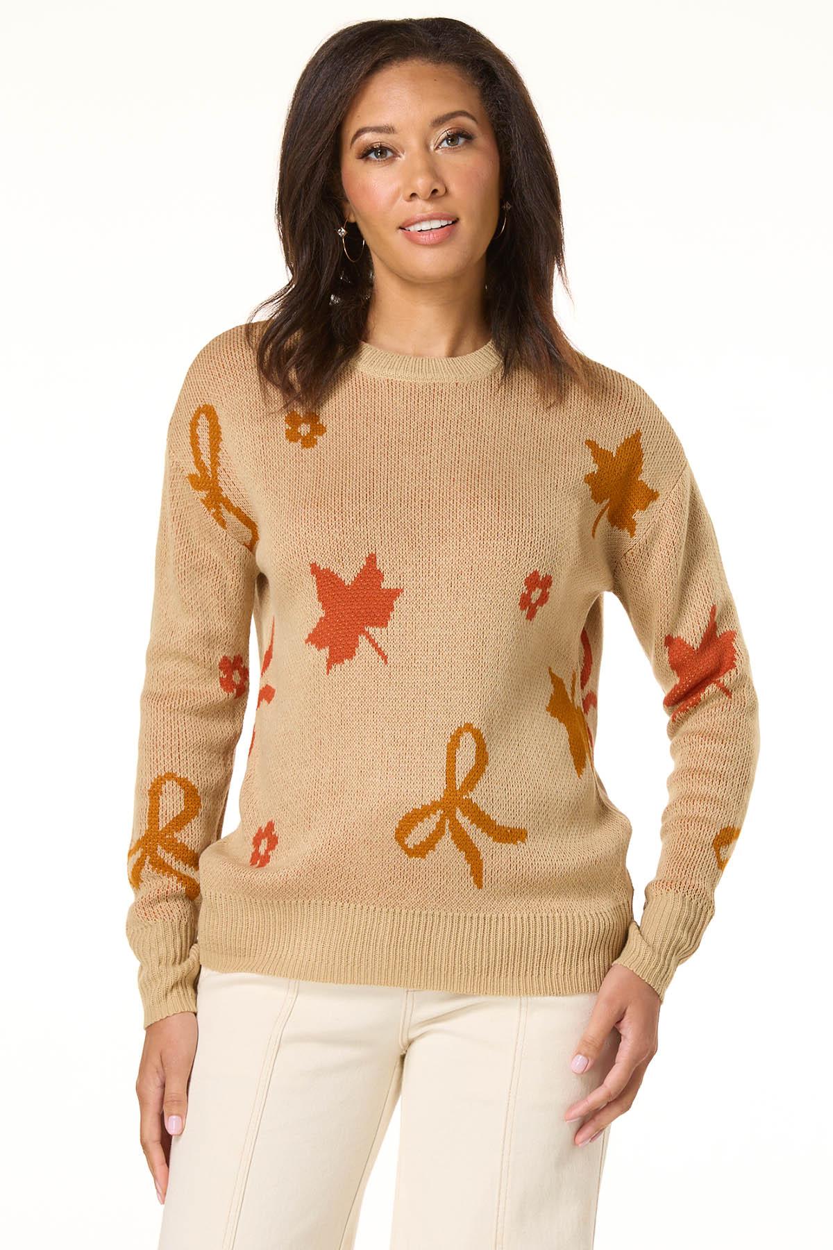 Cozy up in this charming sweater featuring falling autumn leaves and sweet bows – the perfect blend of seasonal style and playful detail.