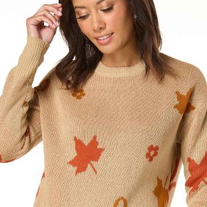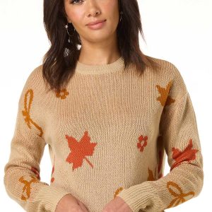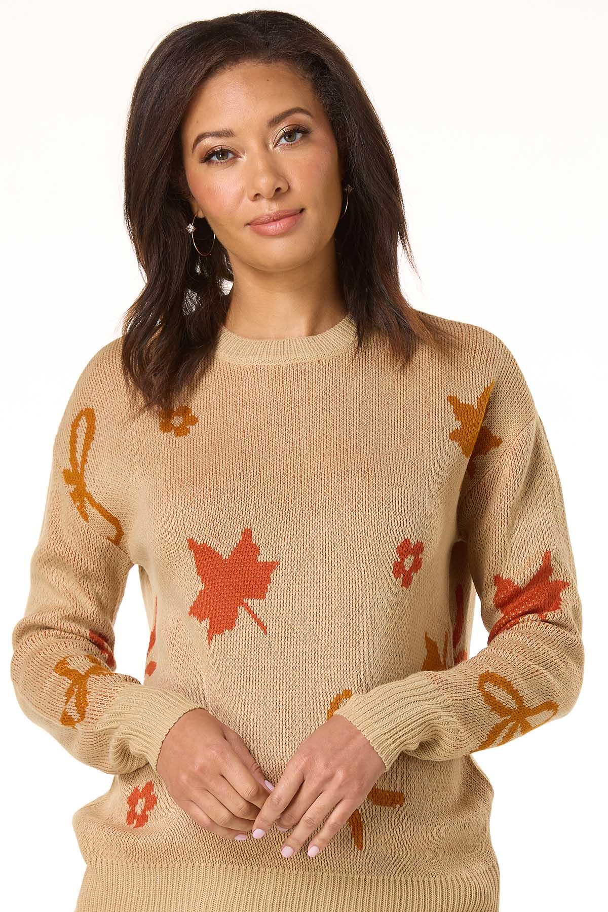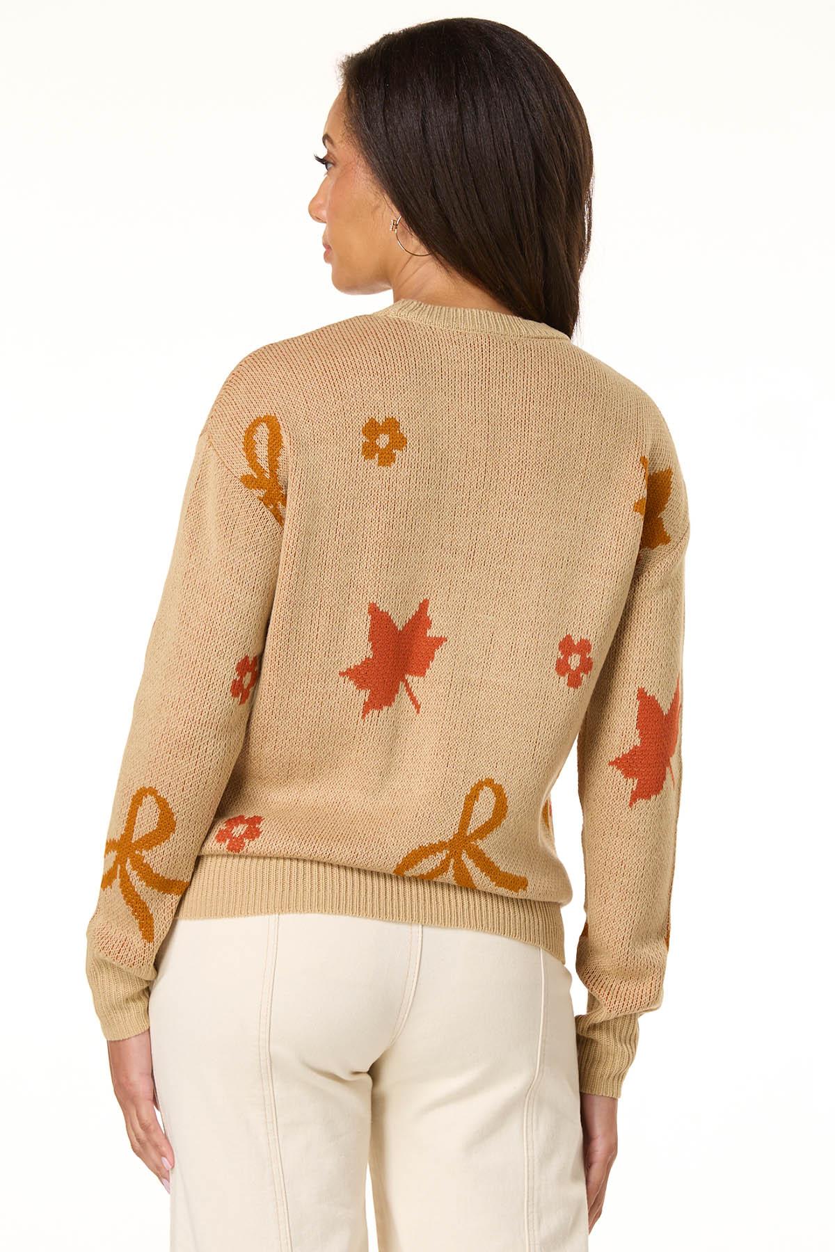 Cozy up in this charming sweater featuring falling autumn leaves and sweet bows – the perfect blend of seasonal style and playful detail.