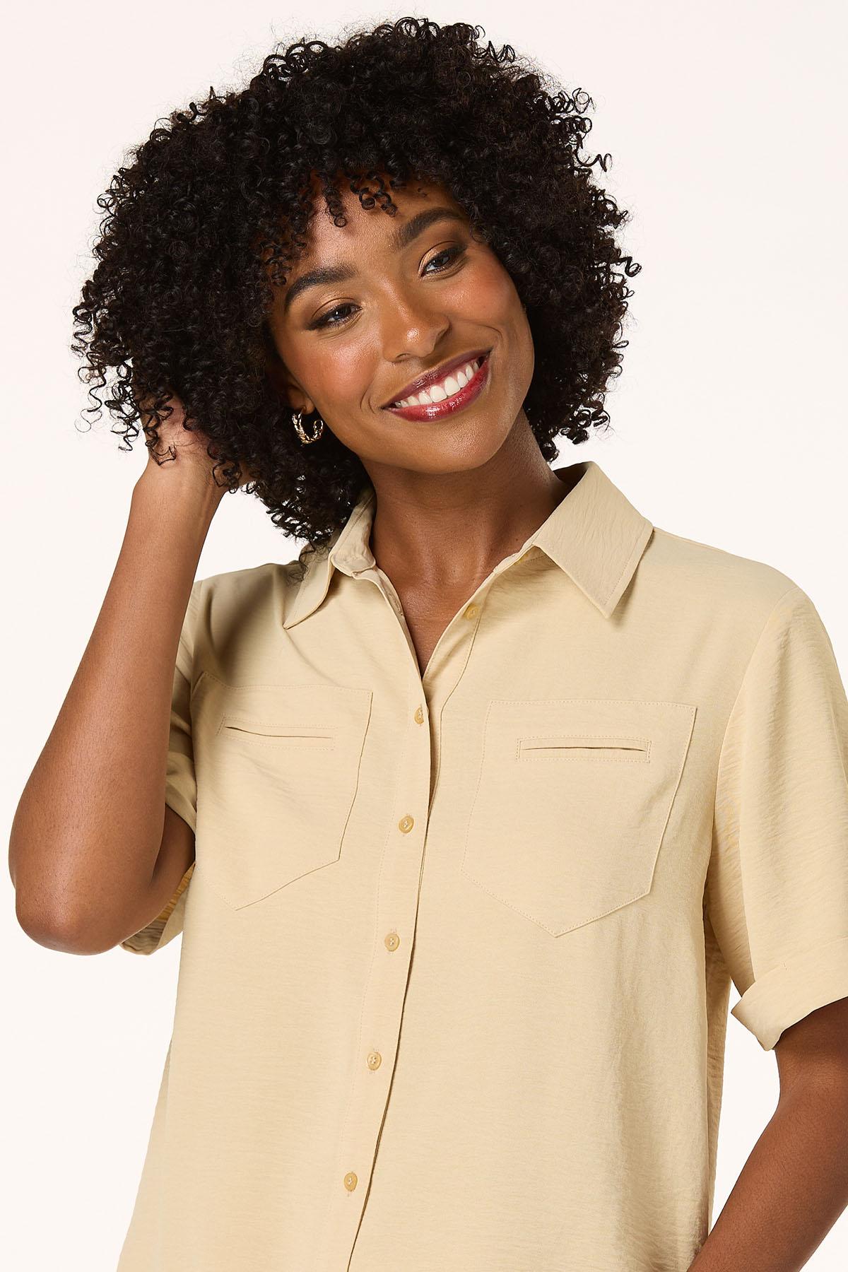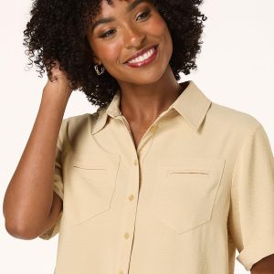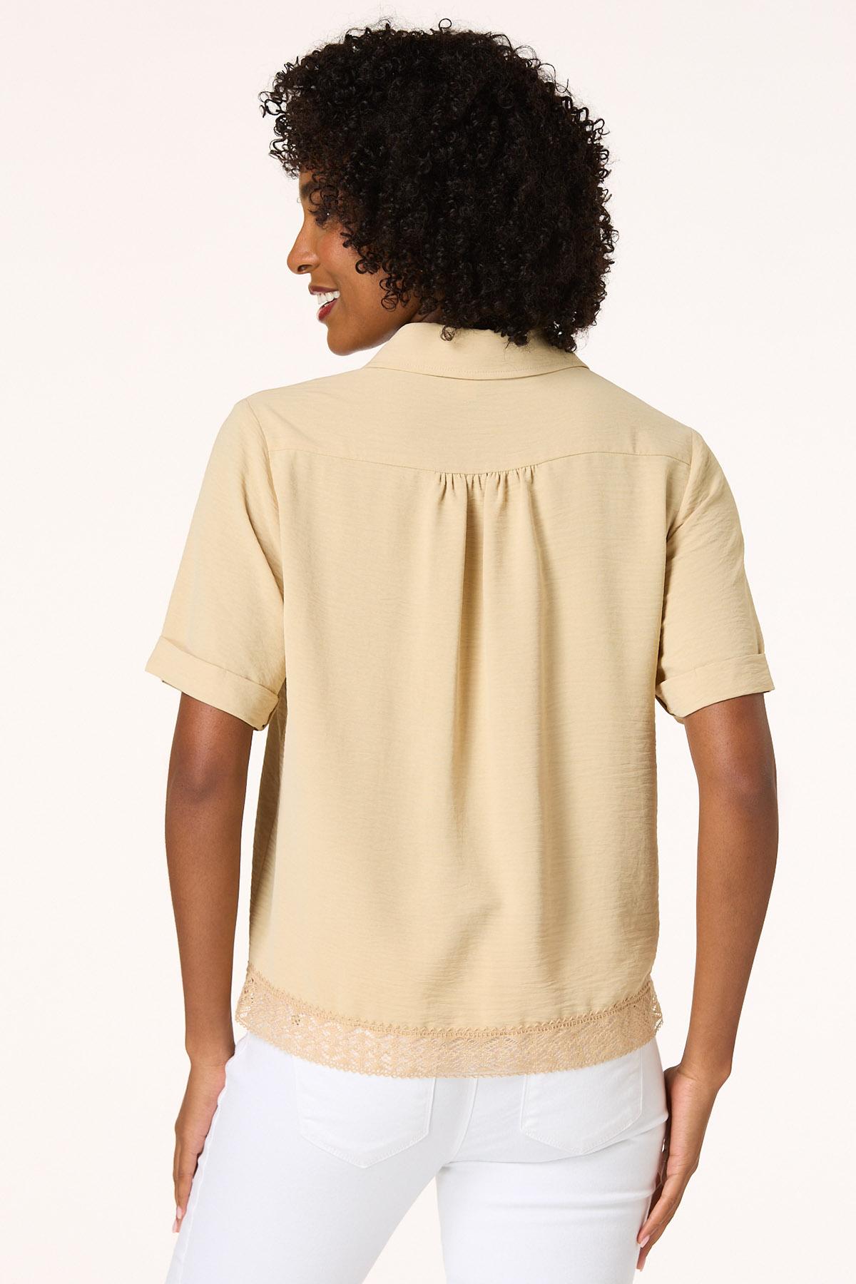 A classic button down look gets a delicate upgrade with this sweet style, featuring a collared neckline, button down front, natural hue and lace trime for a charming finish.
