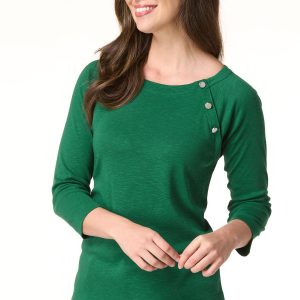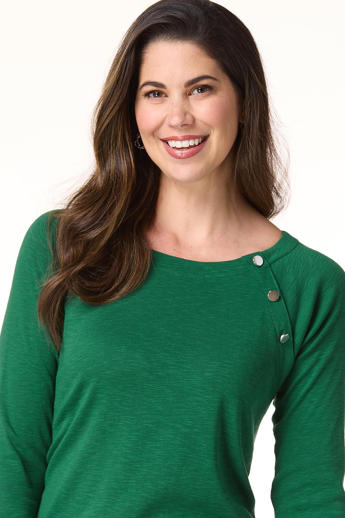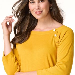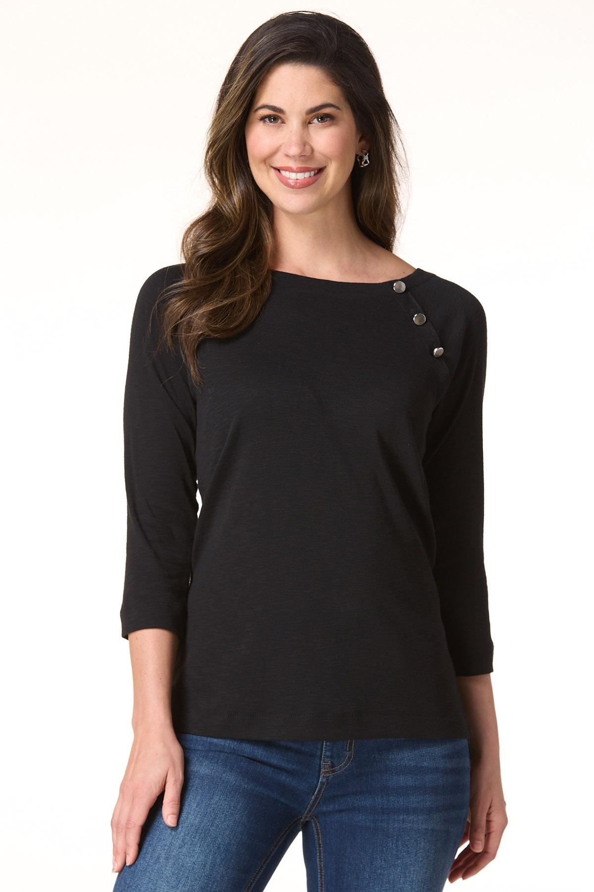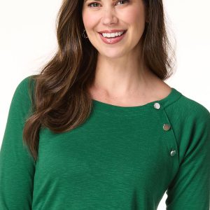 Whether plans include cubicle conversations or lunch dates with friends, you’ll be fitting right in to whatever the day has to offer with this pullover style, featuring a boat neckline, shiny-button detail and a soft feel topping a relaxed fit.
