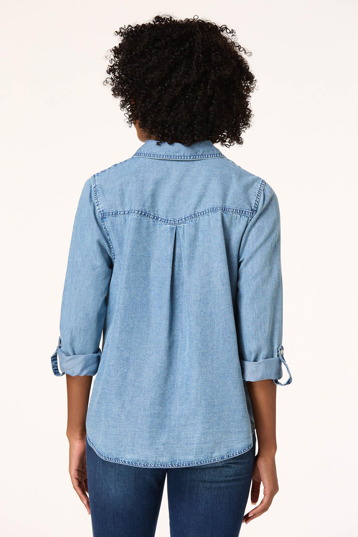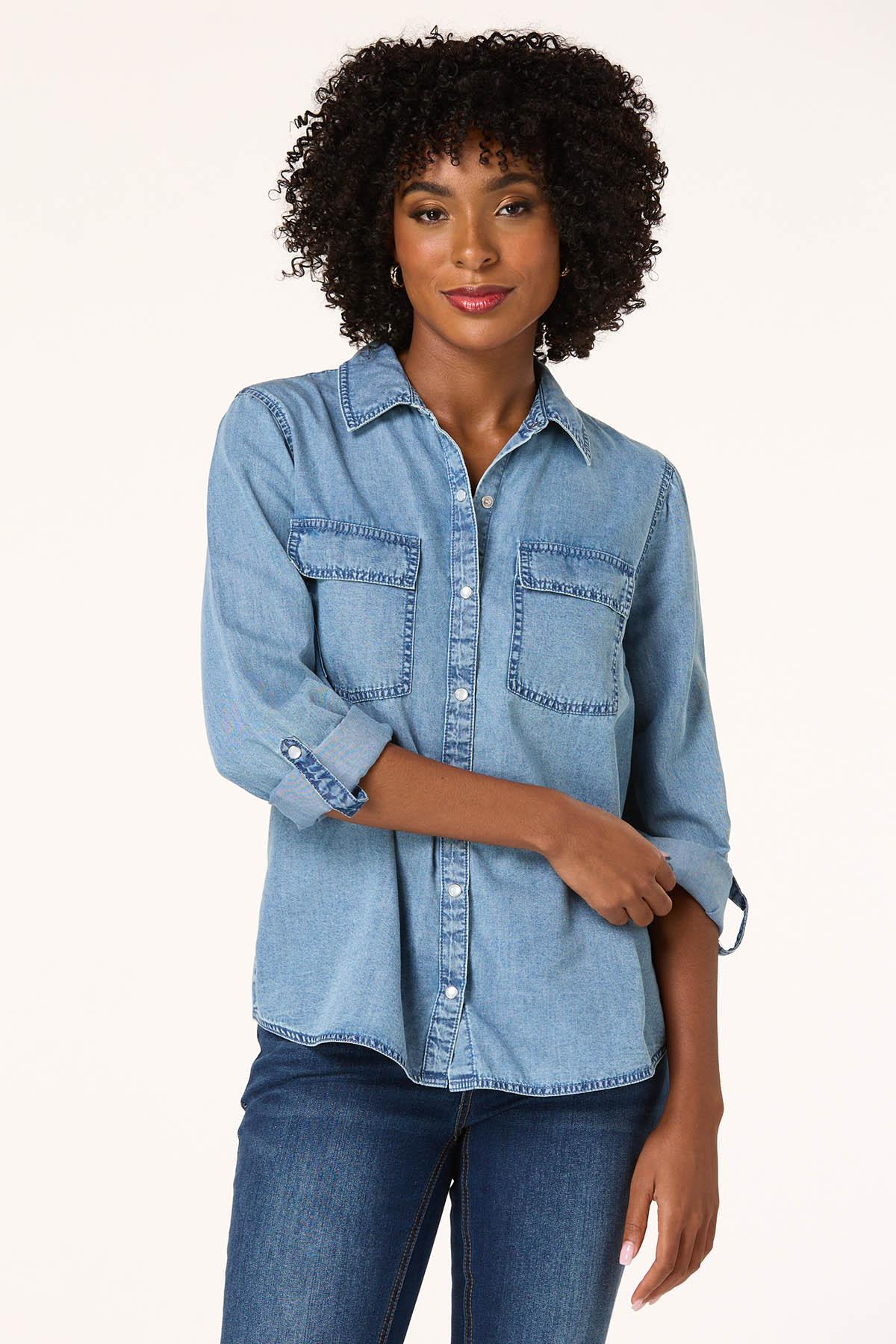 Welcome low-key days and nights with this cool, chambray shirt. Starting with a classic-collared neckline and continuing with a snap down front, double pockets and roll tab sleeves, there are so many ways to style this one. Wear open with a simple tank and jeans or keep it comfy with leggings and sneakers.