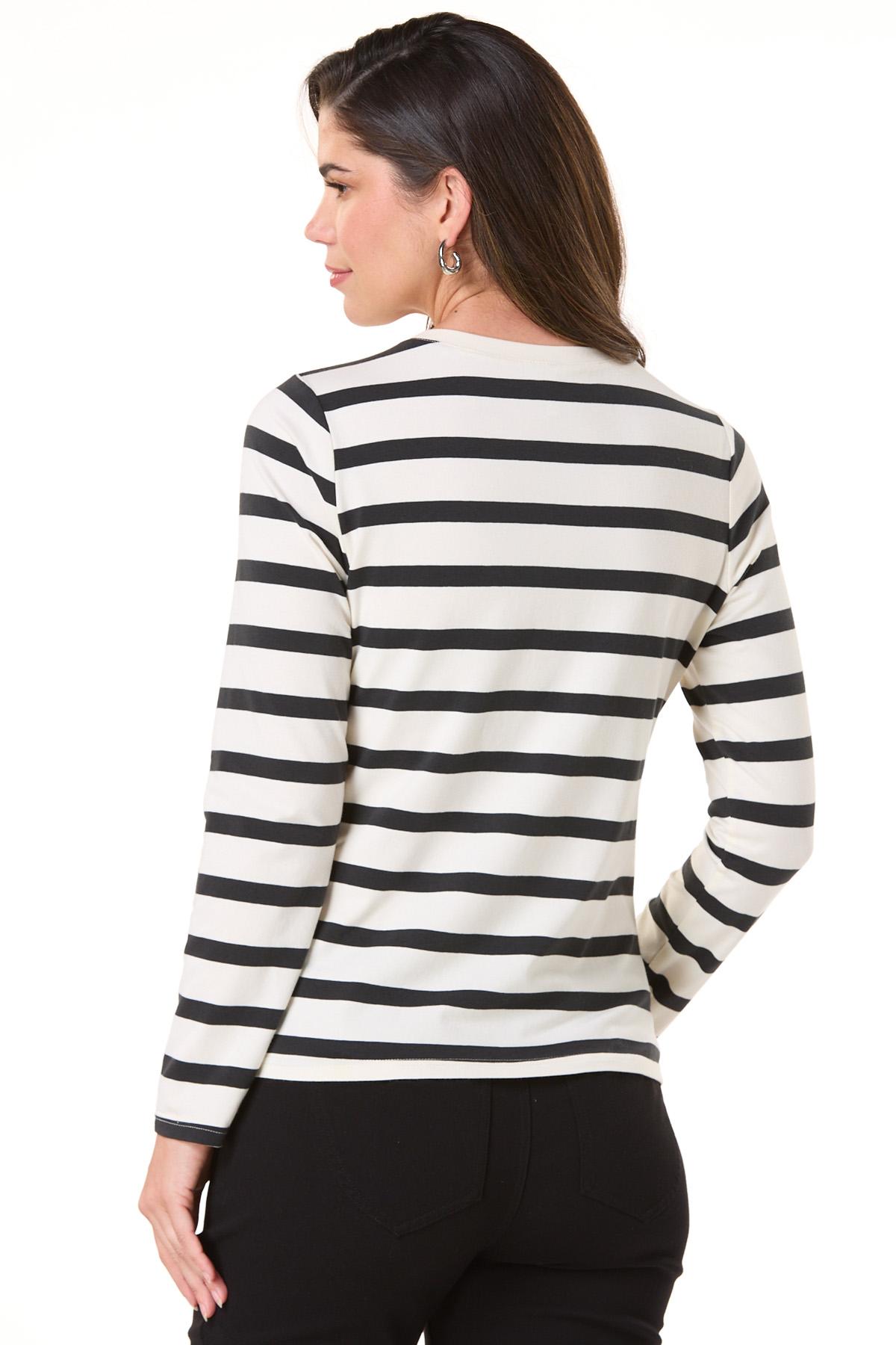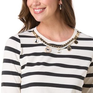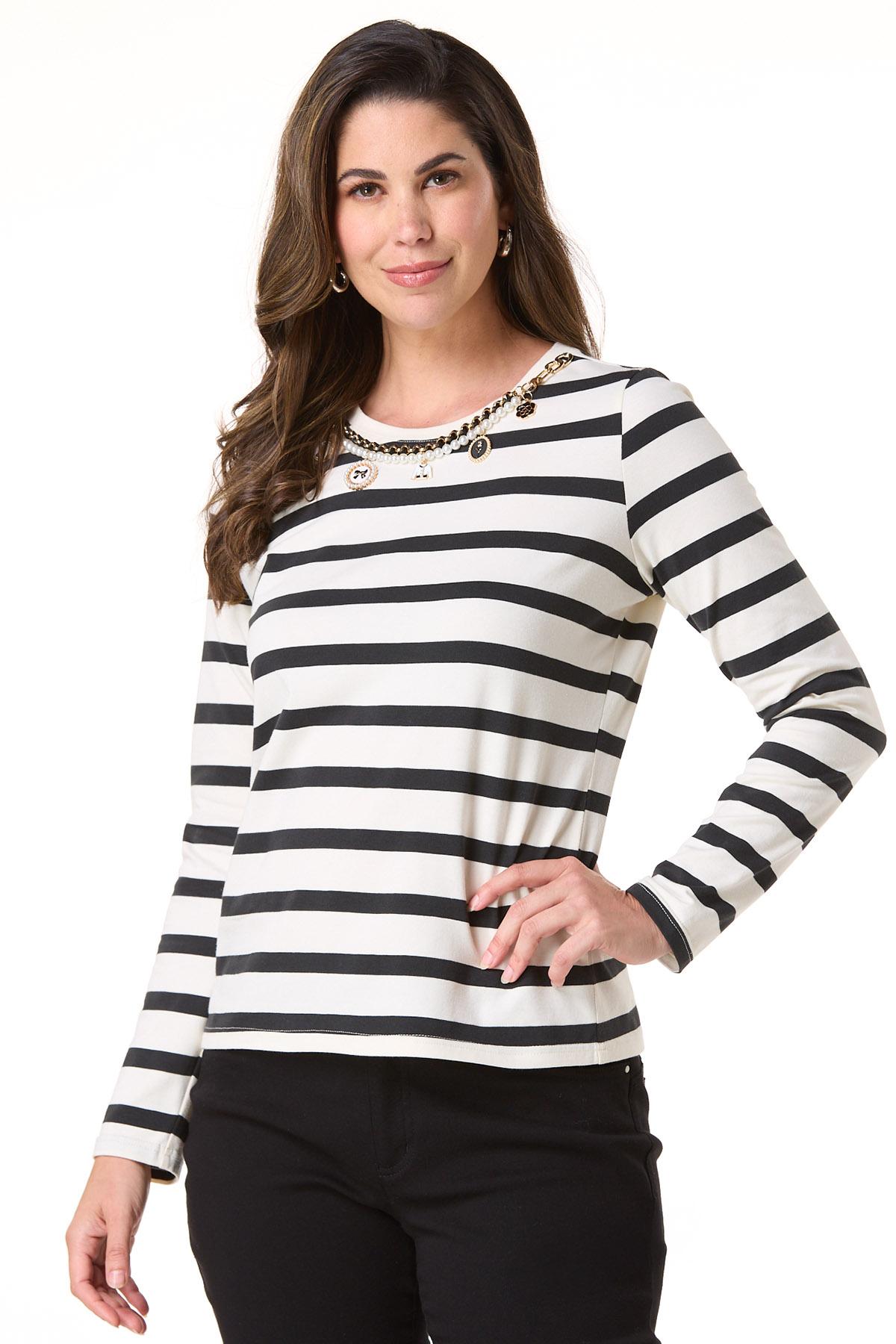 Turn heads in this standout ivory and black striped knit top, elevated with an attached chain-link pearl necklace adorned with delicate, feminine-inspired charms. Effortlessly chic with built-in statement style.