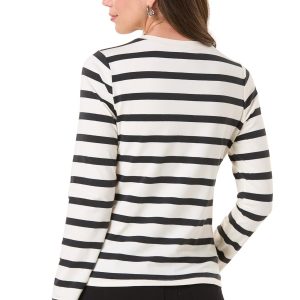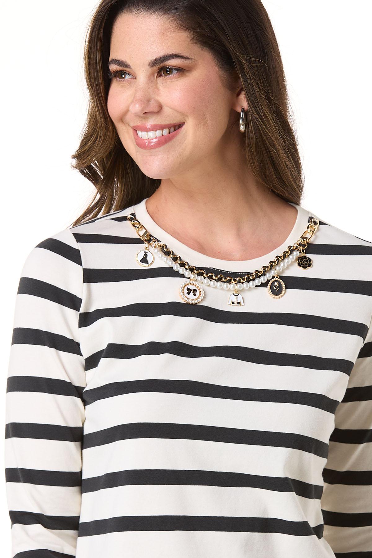 Turn heads in this standout ivory and black striped knit top, elevated with an attached chain-link pearl necklace adorned with delicate, feminine-inspired charms. Effortlessly chic with built-in statement style.