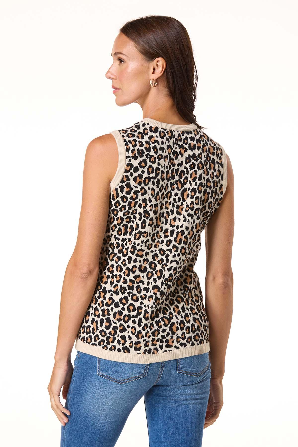 Add a touch of wild to your wardrobe with this sweater vest, featuring a bold cheetah print, gold button-down closure, split front hem, and a soft, cozy feel – perfect for chilly days and layered looks.