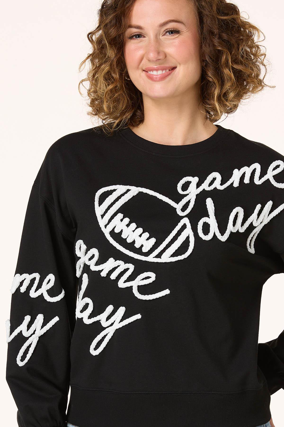 Get field-ready in this classic black sweatshirt, featuring a soft chenille football and “game day” verbiage that brings the spirit. Ribbed trim at the cuffs and hem keeps it cozy and snug! Perfect for cool nights under the lights or cheering from the sidelines.