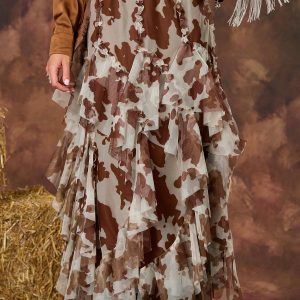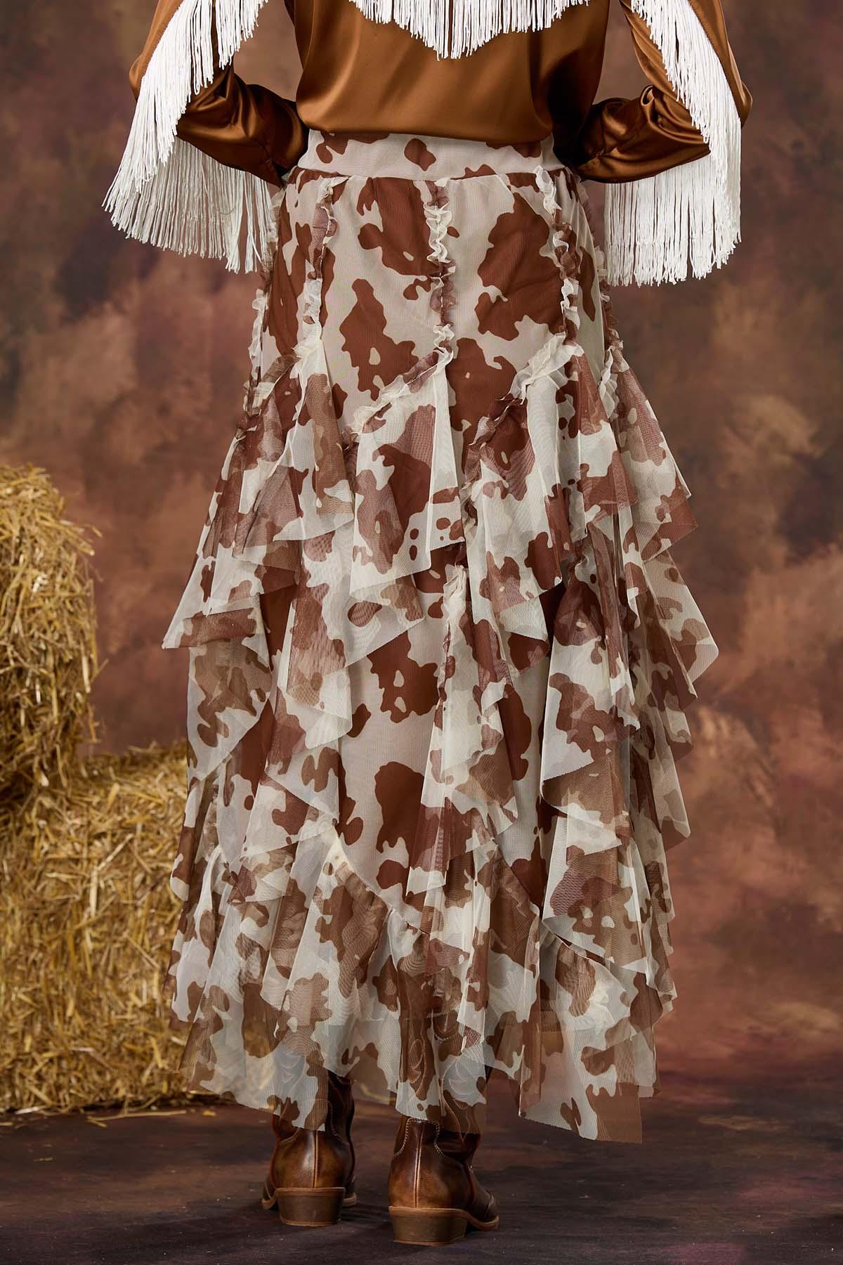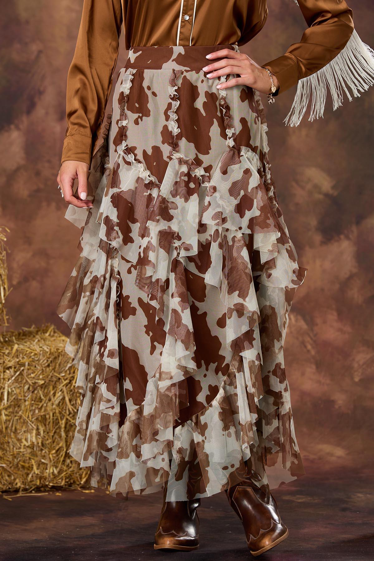 Saddle up in style with this cow print mesh skirt, featuring a head-turning piece that brings rodeo vibes to the runway. This flowing stunner features an easy, pull-on elastic waist for all-day comfort and wear, making it the ultimate partner for your western-inspired fits.