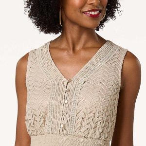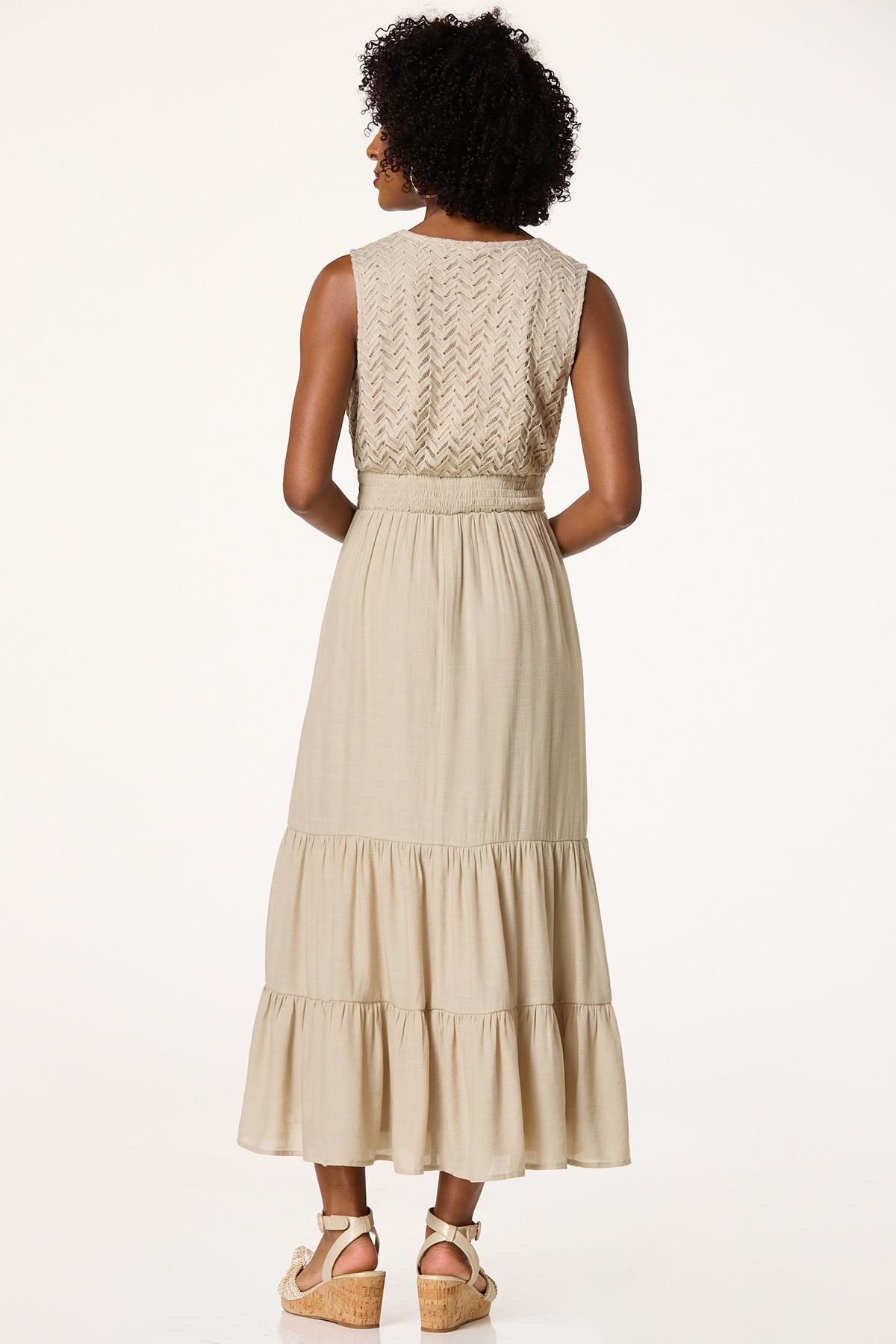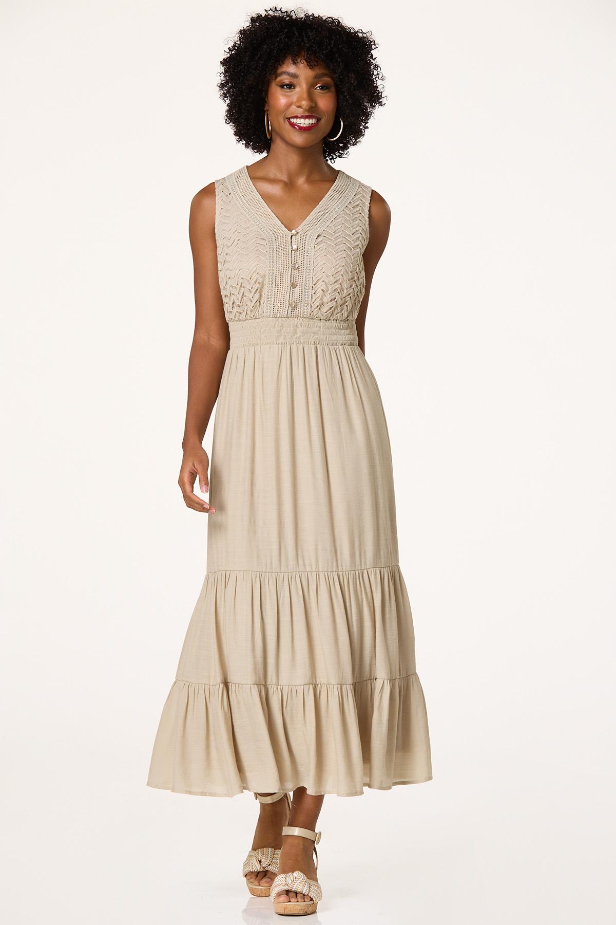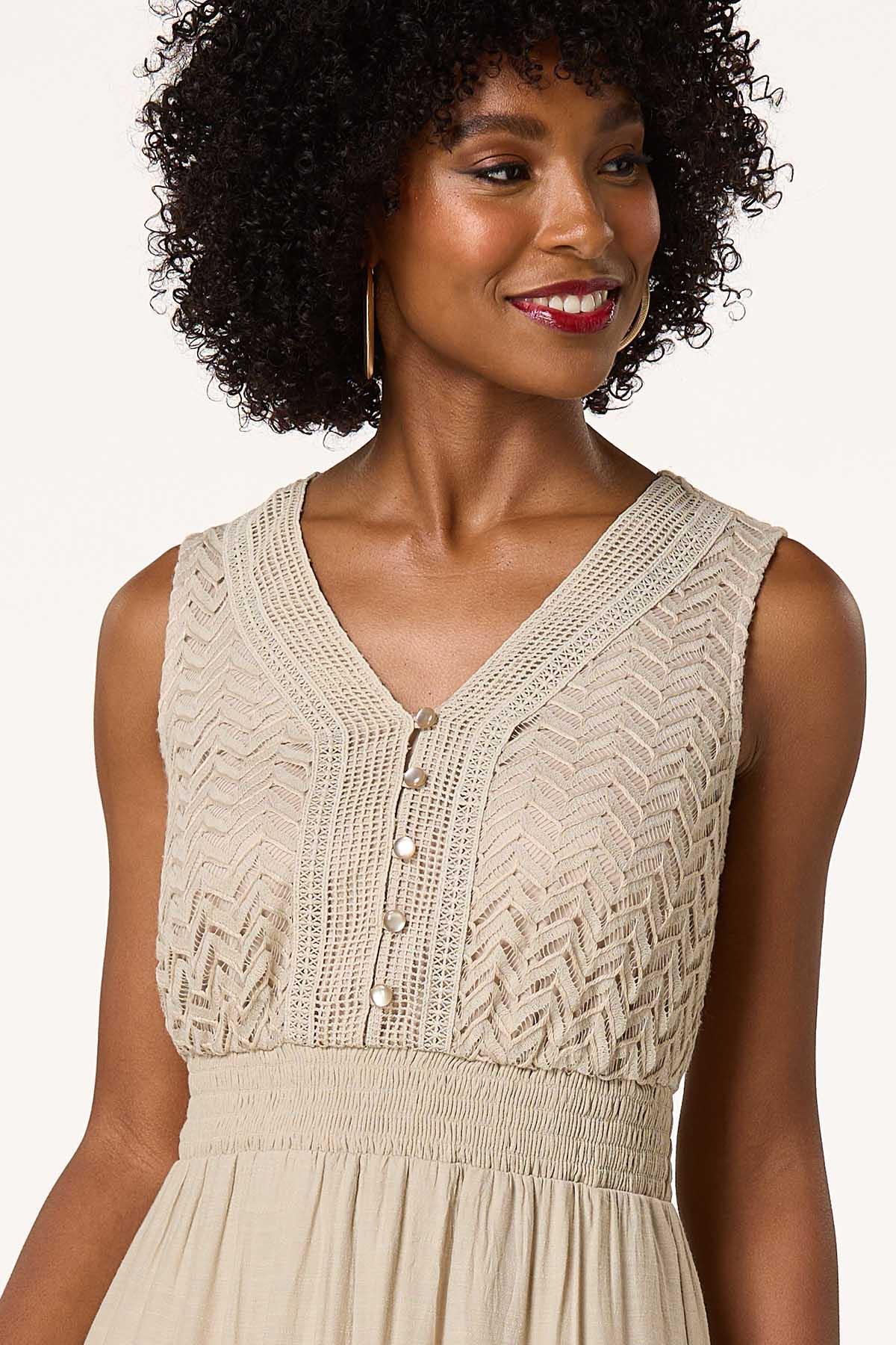 This neutral maxi dress blends texture and flow with a crochet bodice, smocked waist, and tiered silhouette. Five buttons trace the v-neckline, adding a touch of vintage charm to this free-spirited essential.