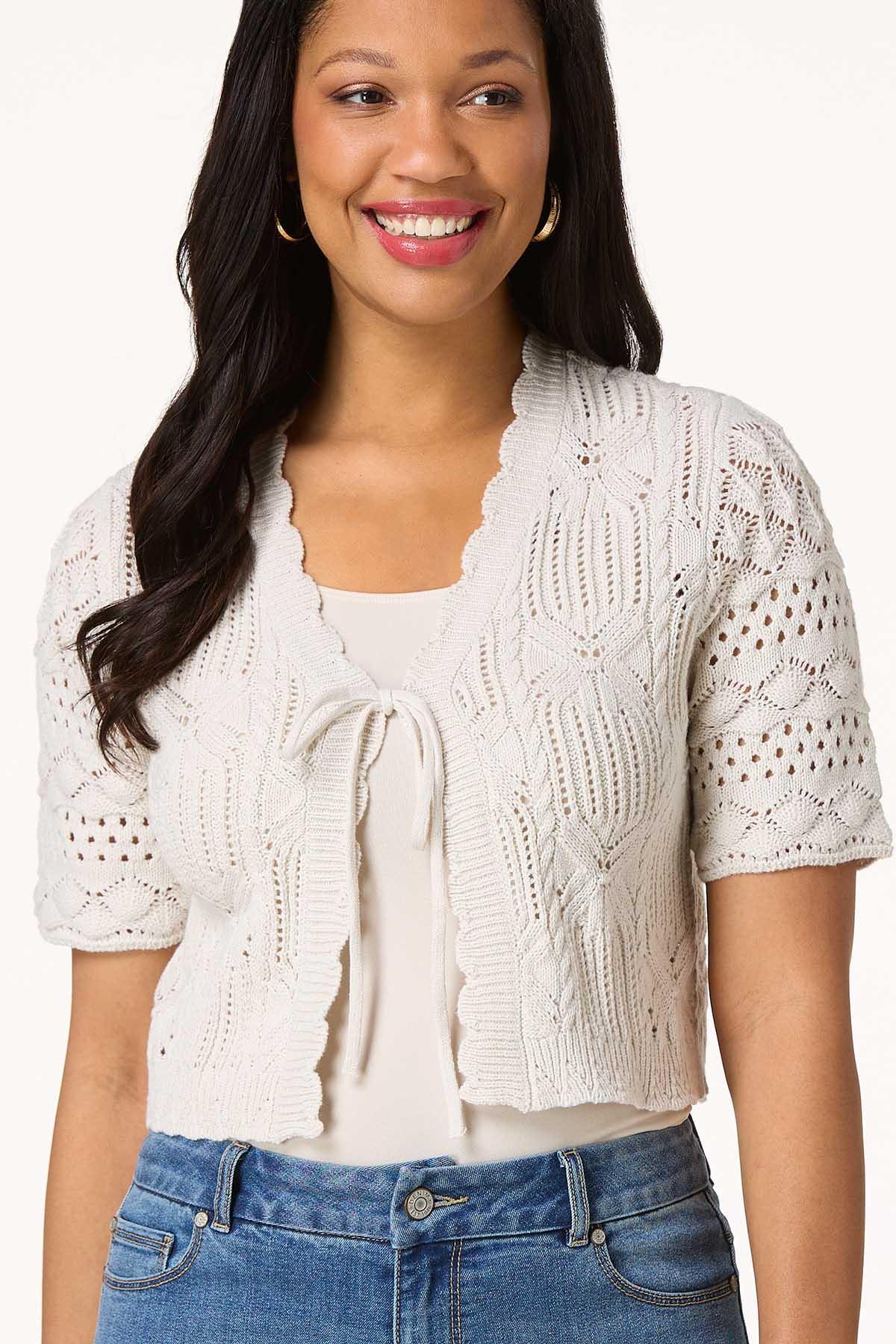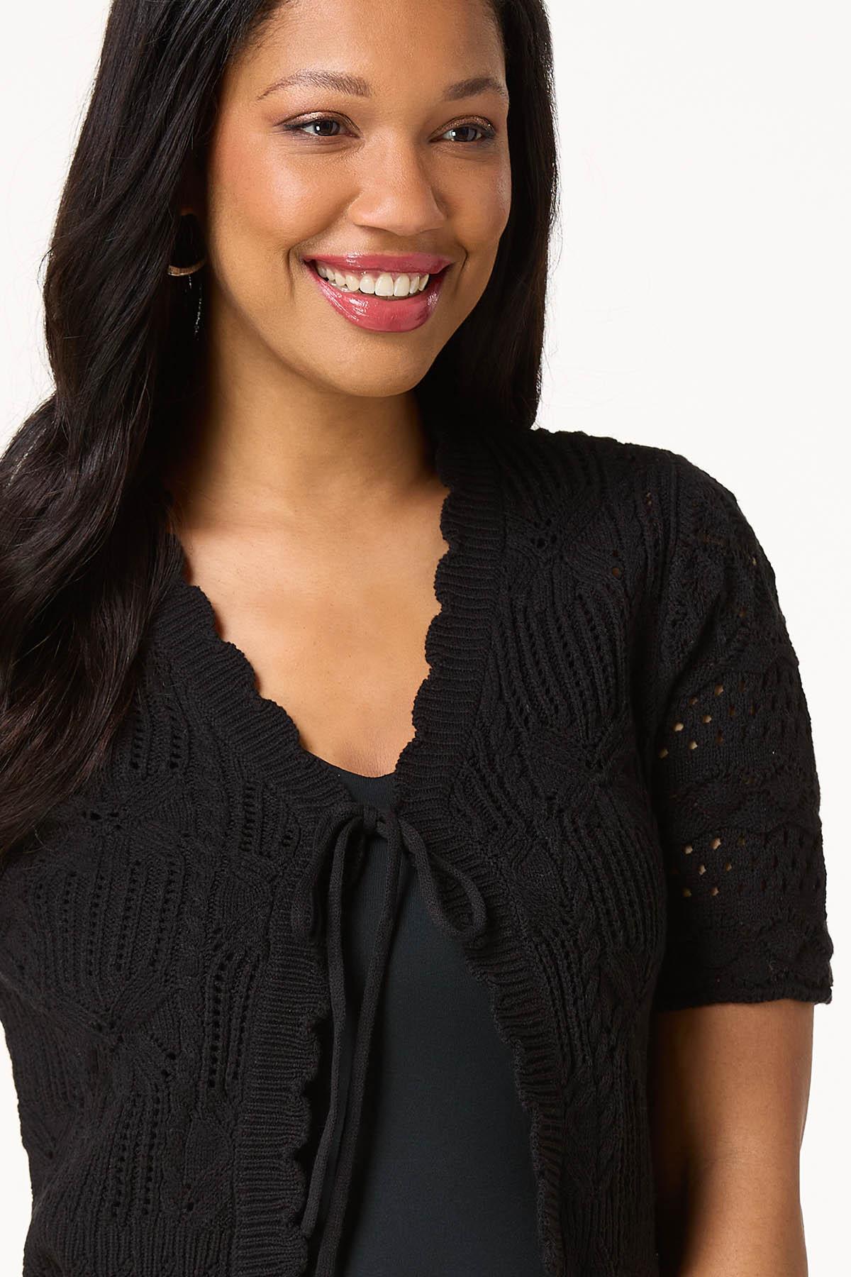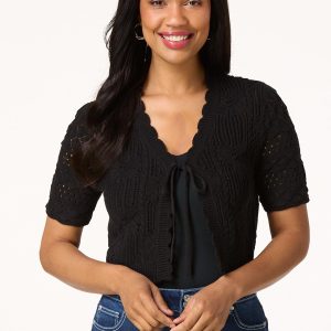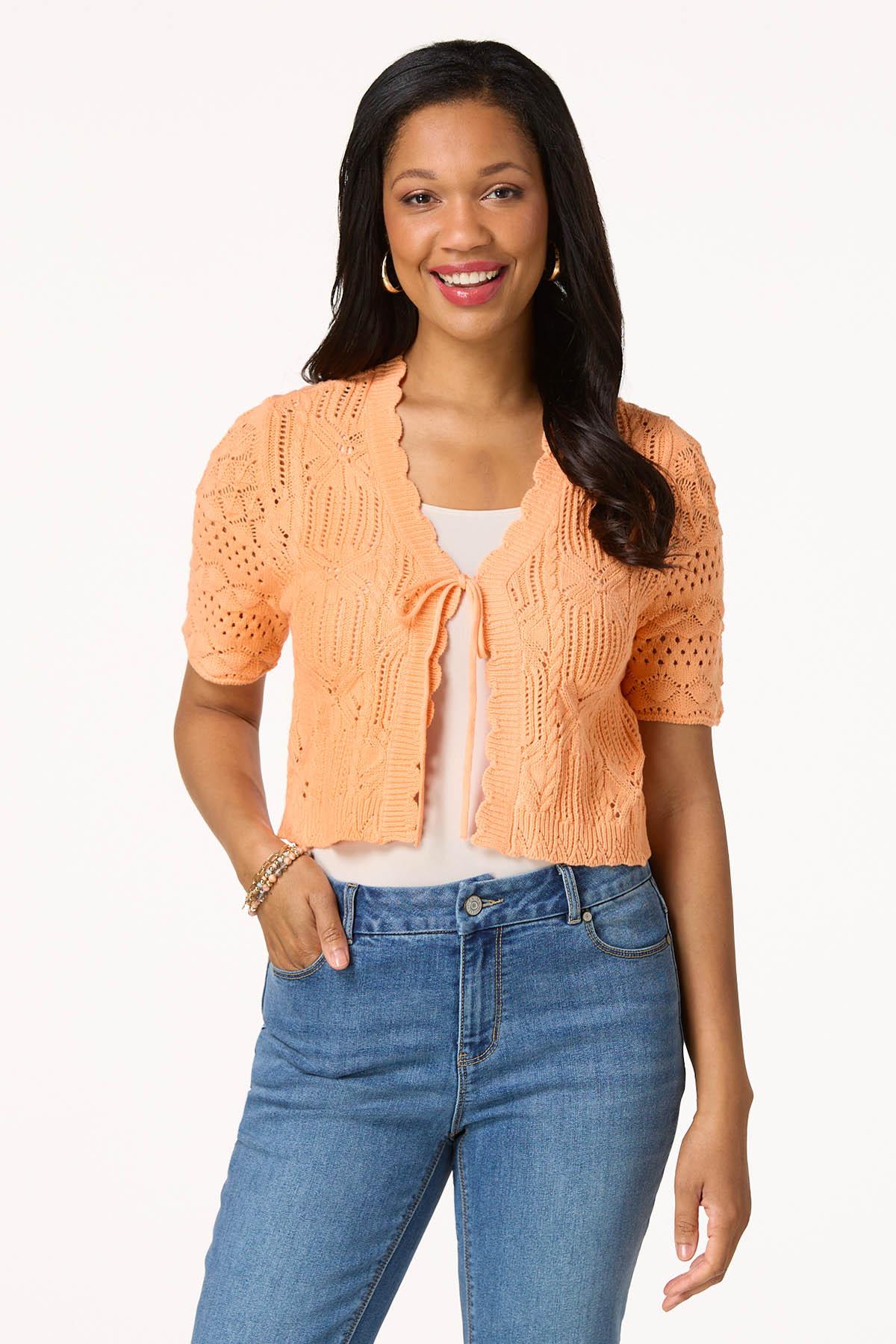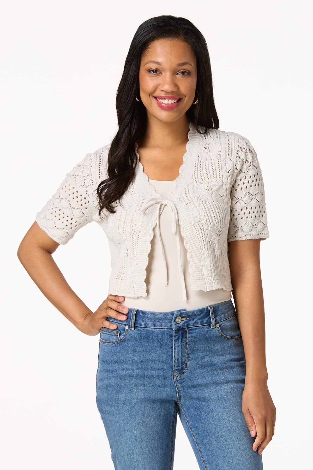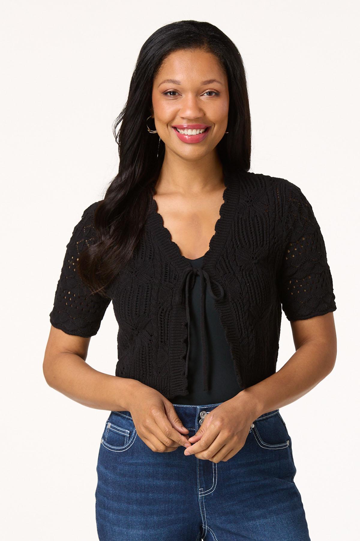 A sweet addition to add to those beautiful sleeveless styles, this crochet cardi is going to make your day. An allover crochet design, scalloped trim and tie front closure are the details that make this one you’ll love to layer with.
