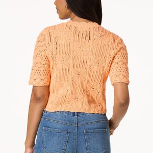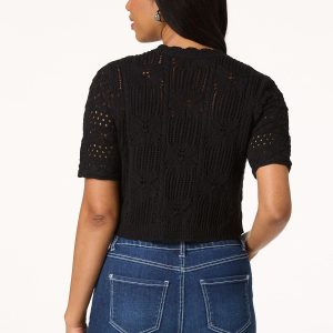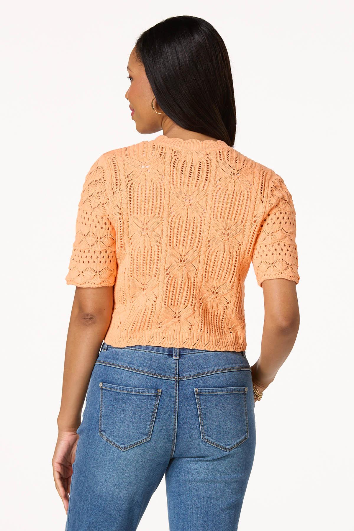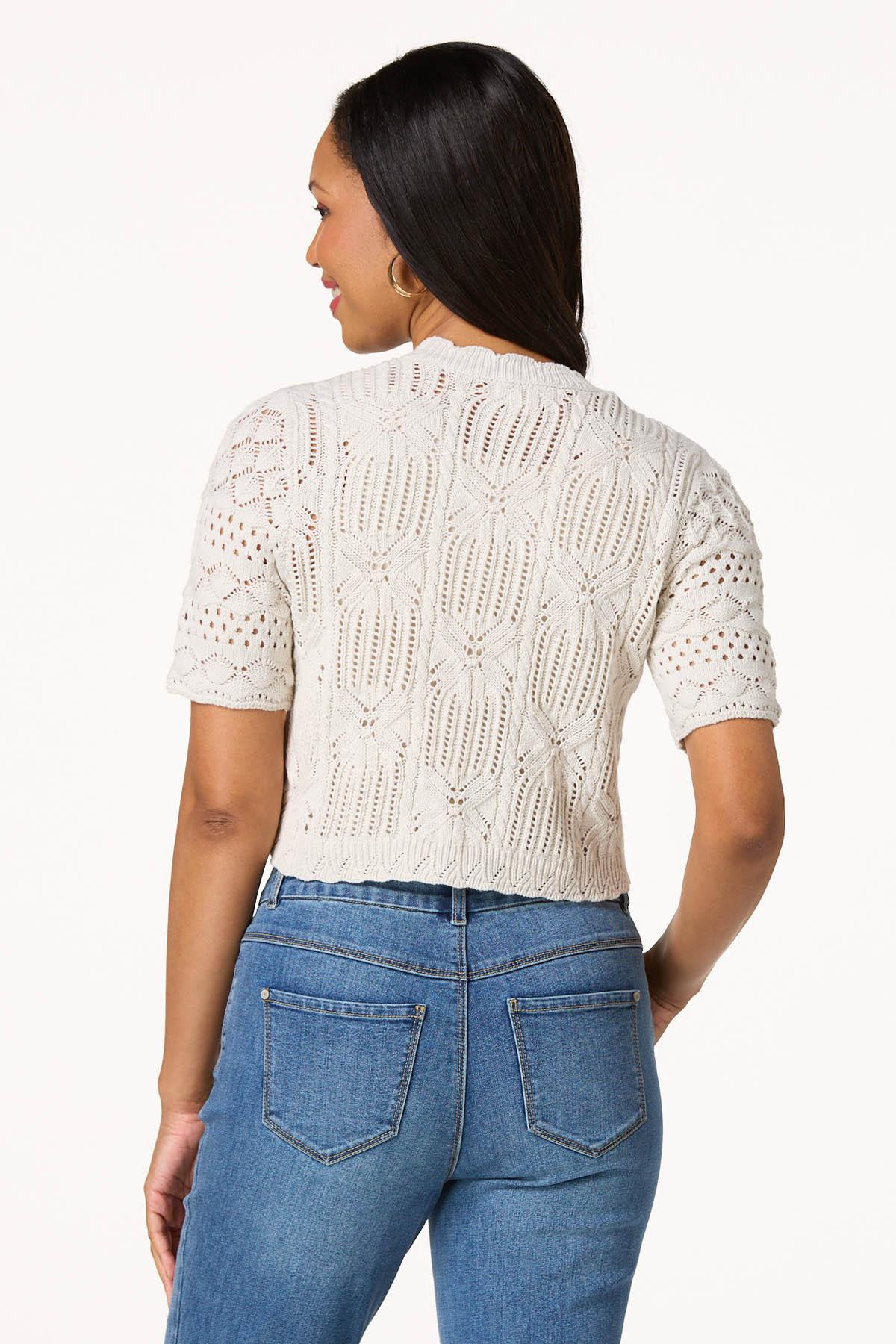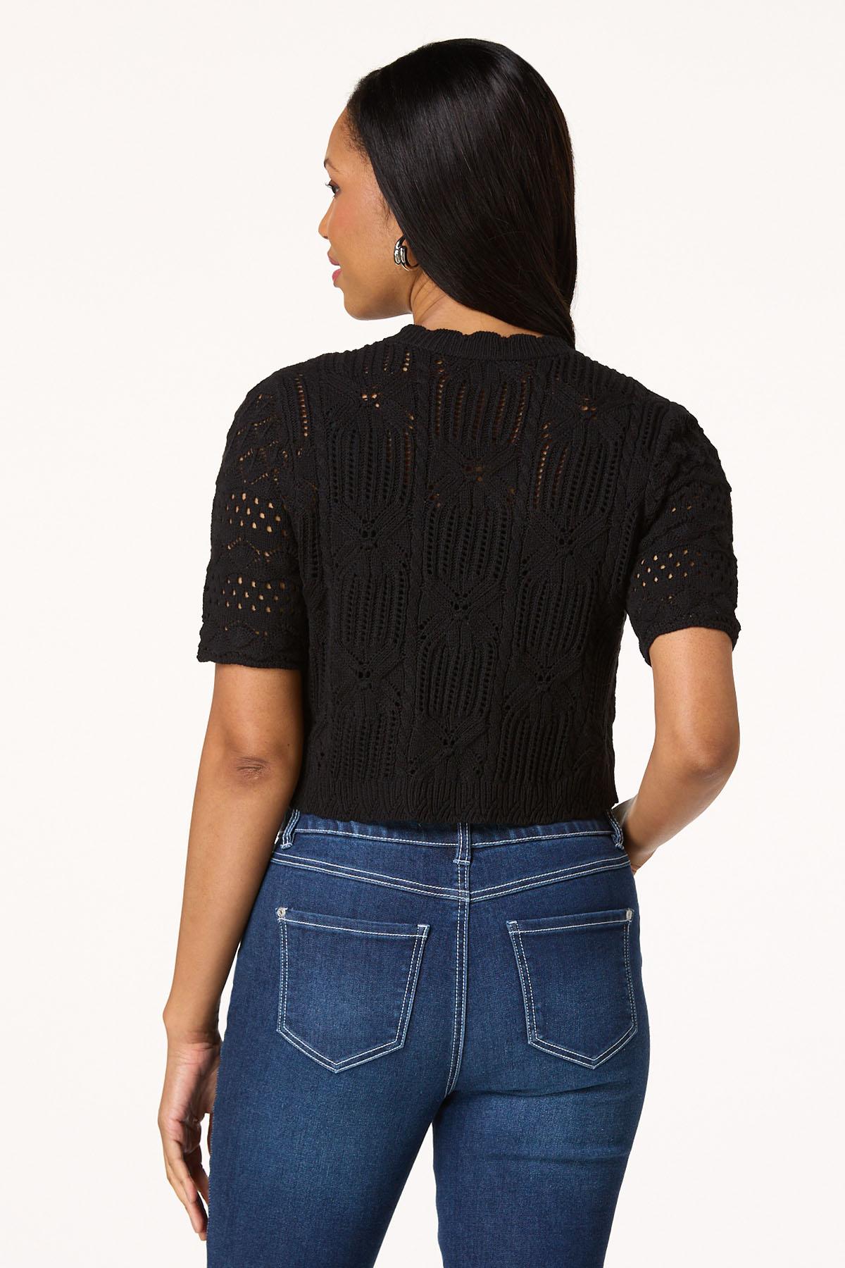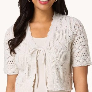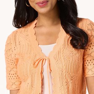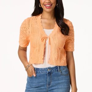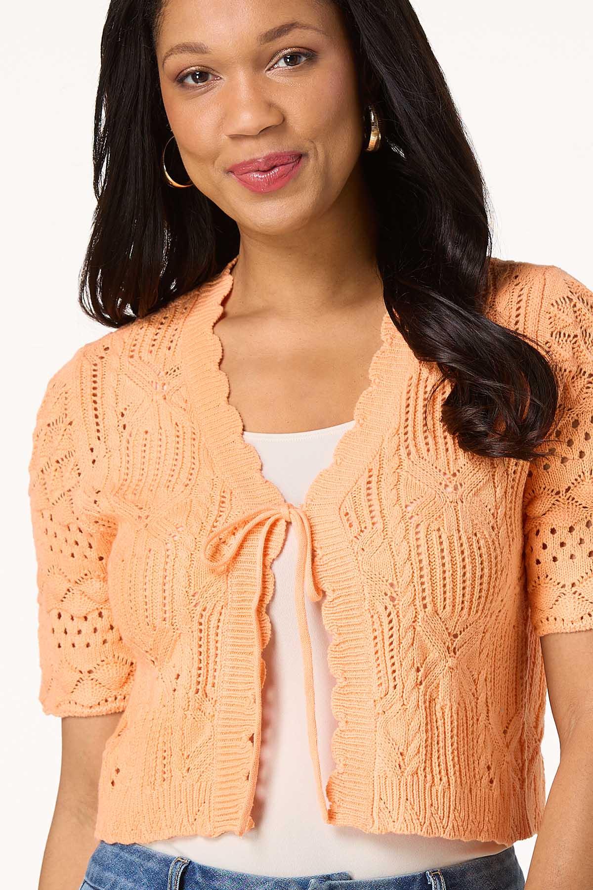 A sweet addition to add to those beautiful sleeveless styles, this crochet cardi is going to make your day. An allover crochet design, scalloped trim and tie front closure are the details that make this one you’ll love to layer with.