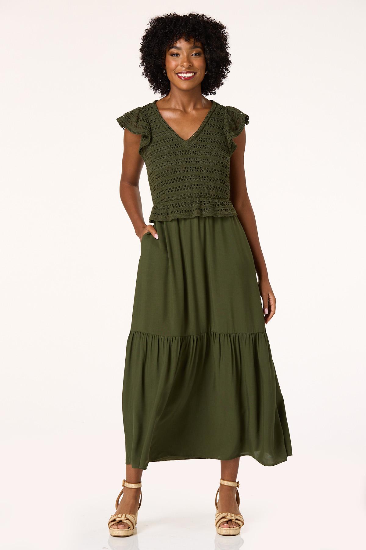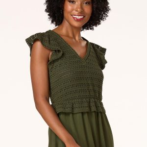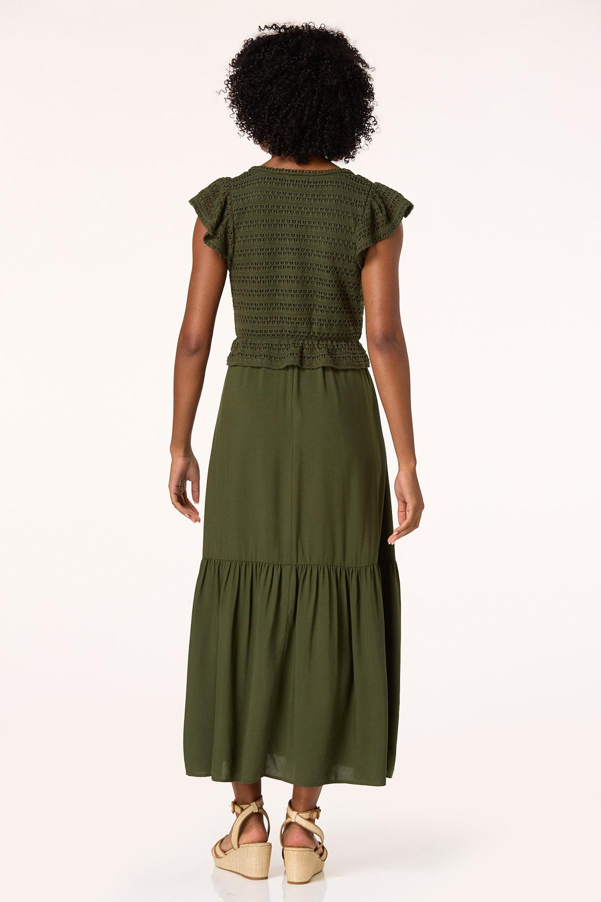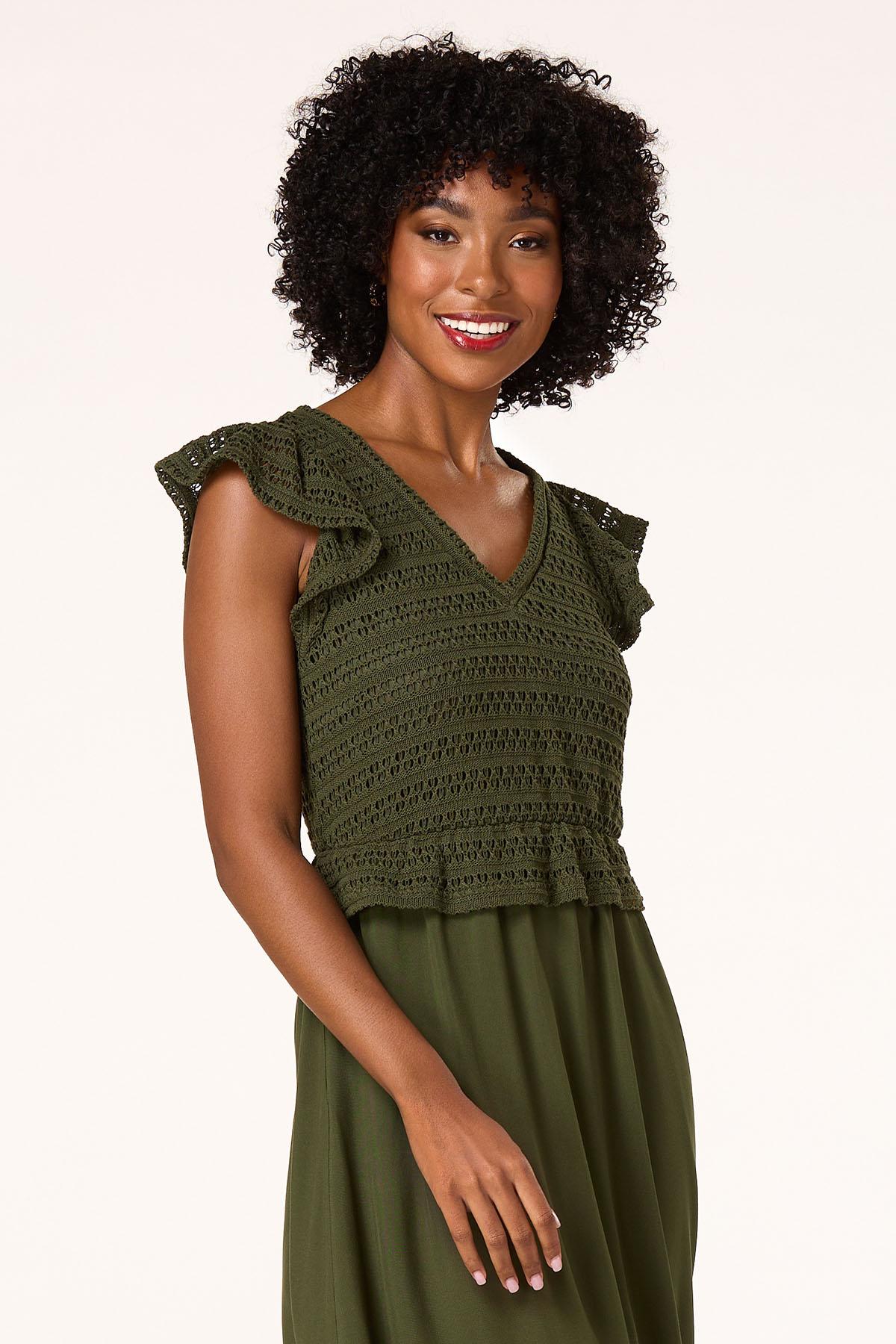 You’ll love the chic, trending look of this two-in-one style, featuring a crochet bodice, v-neckline, flutter sleeves and flowy, tiered design, topping a gorgeous-green hue. Ready for endless compliments – lucky you, with this lovely look they are certainly in store for you.