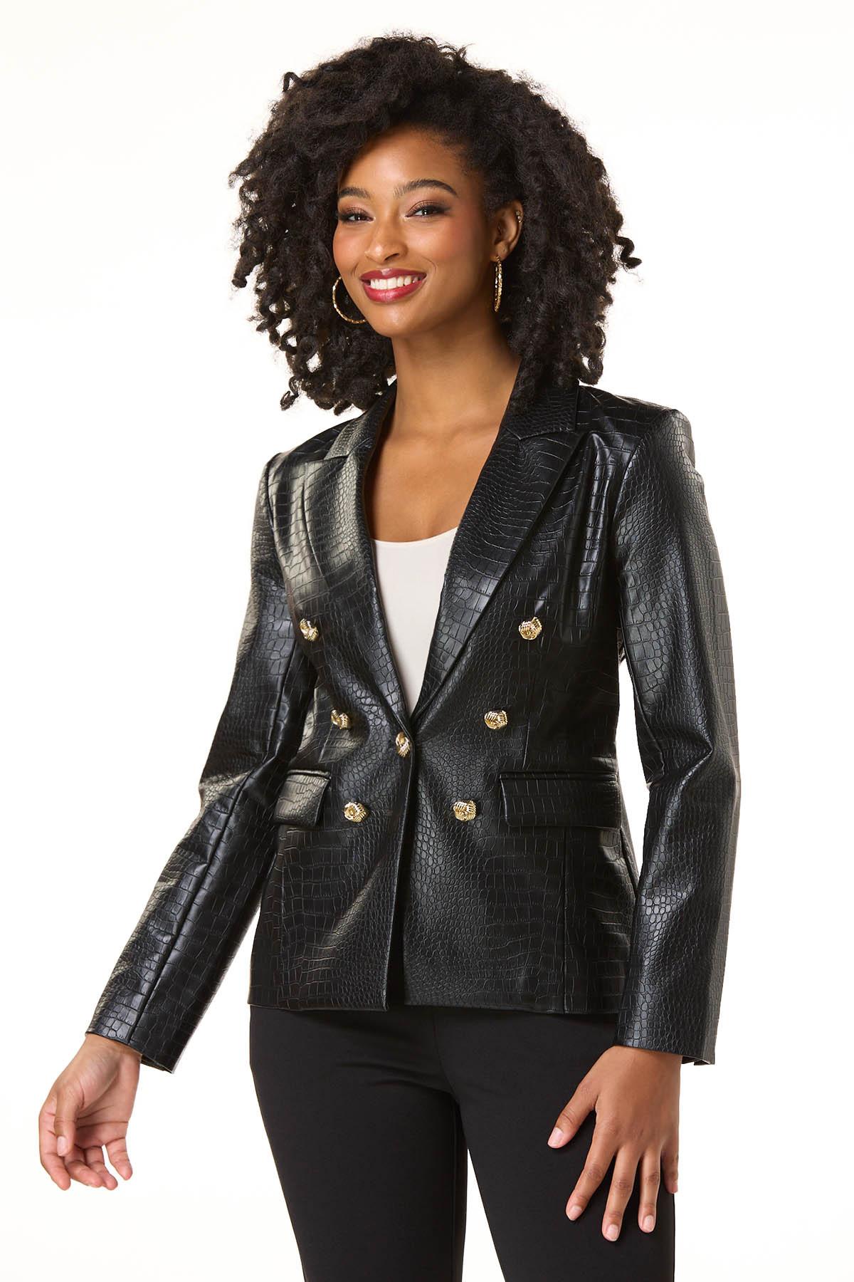 Elevate your day or night with this chic, limited edition style, featuring a shiny-croco texture, front pocket detail, lightly-padded shoulders, leopard print lining and gold button detail for a contemporary, made-you-look finish.