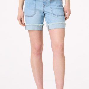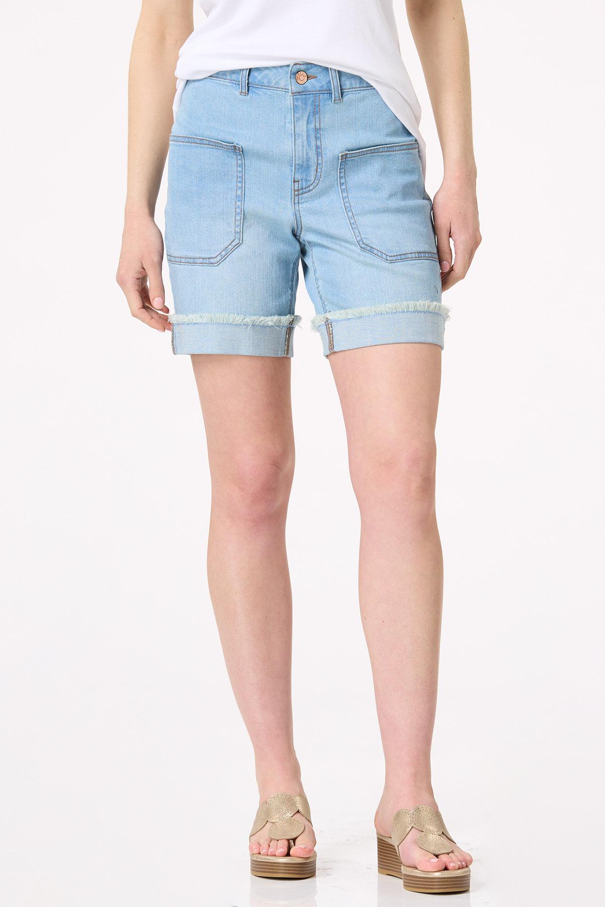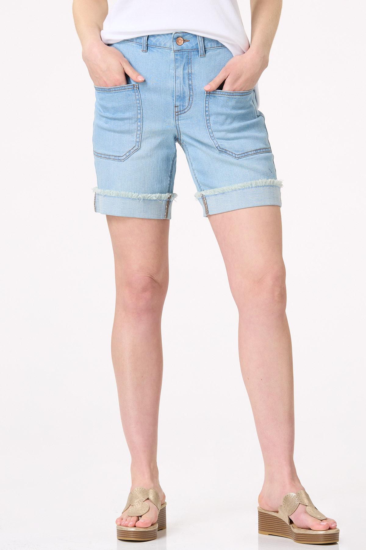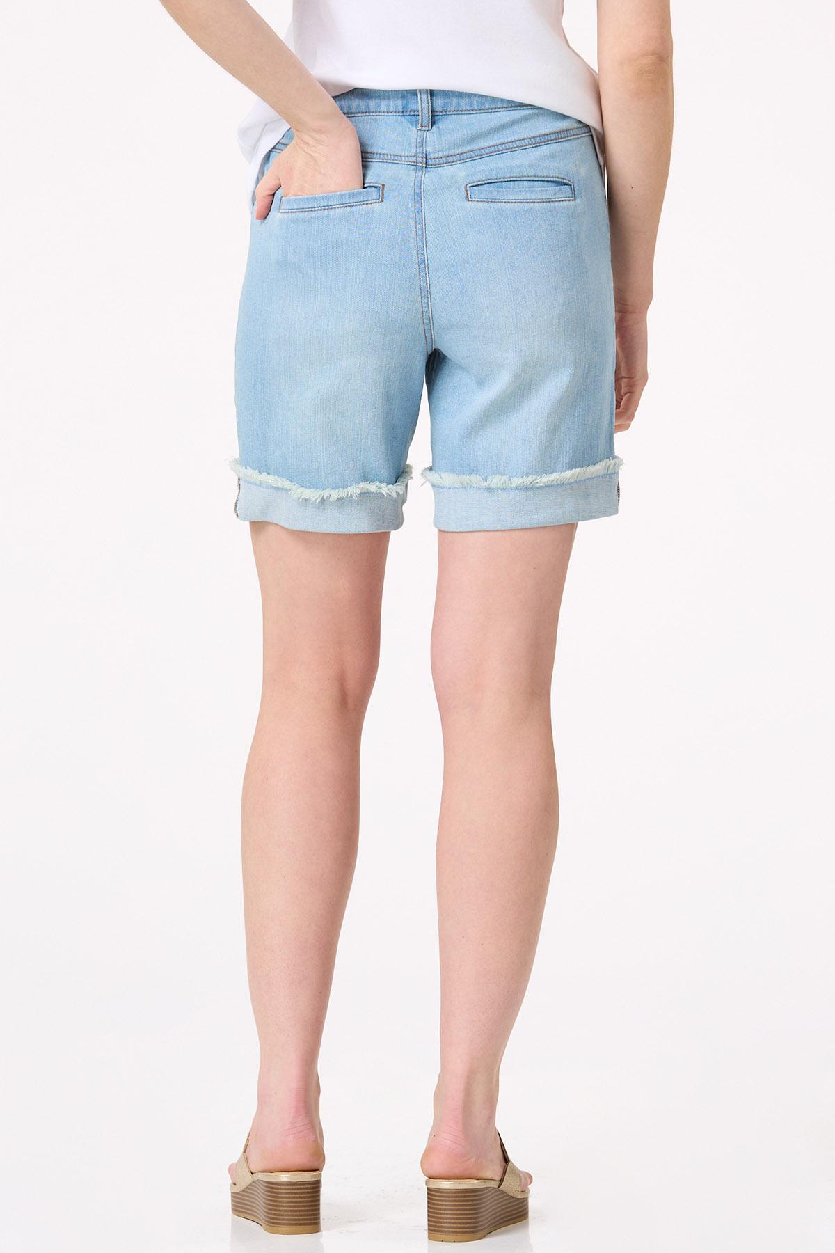 Summer wouldn’t be the same without them. We’re talking denim shorts and this curve-friendly style is certainly no exception. A button closure, button tab waist, frayed-cuffed hem, faded blue hue and front pockets are the details that make this stretchy style a must-have for all your tees, tanks and even more dressier tops.