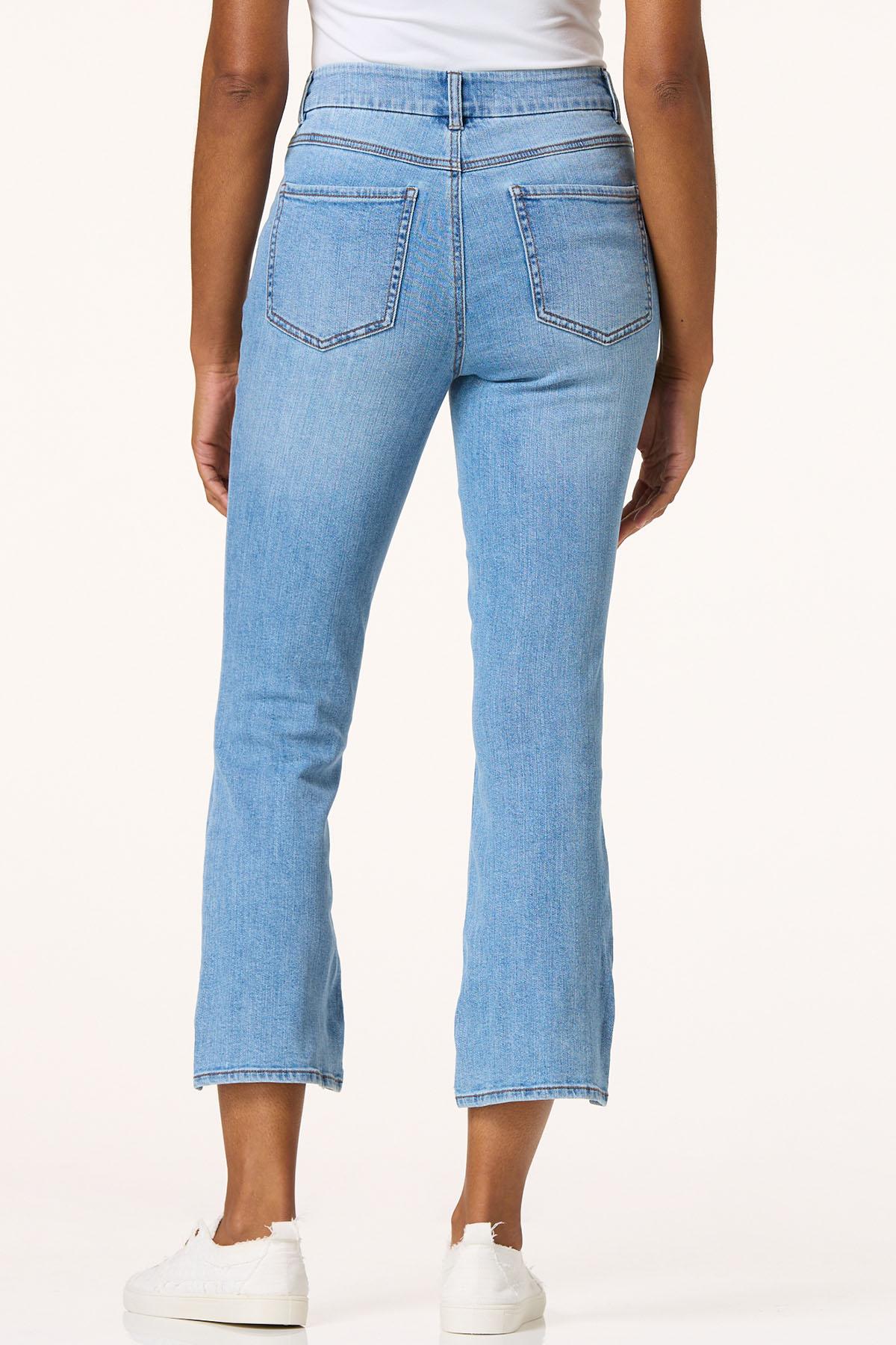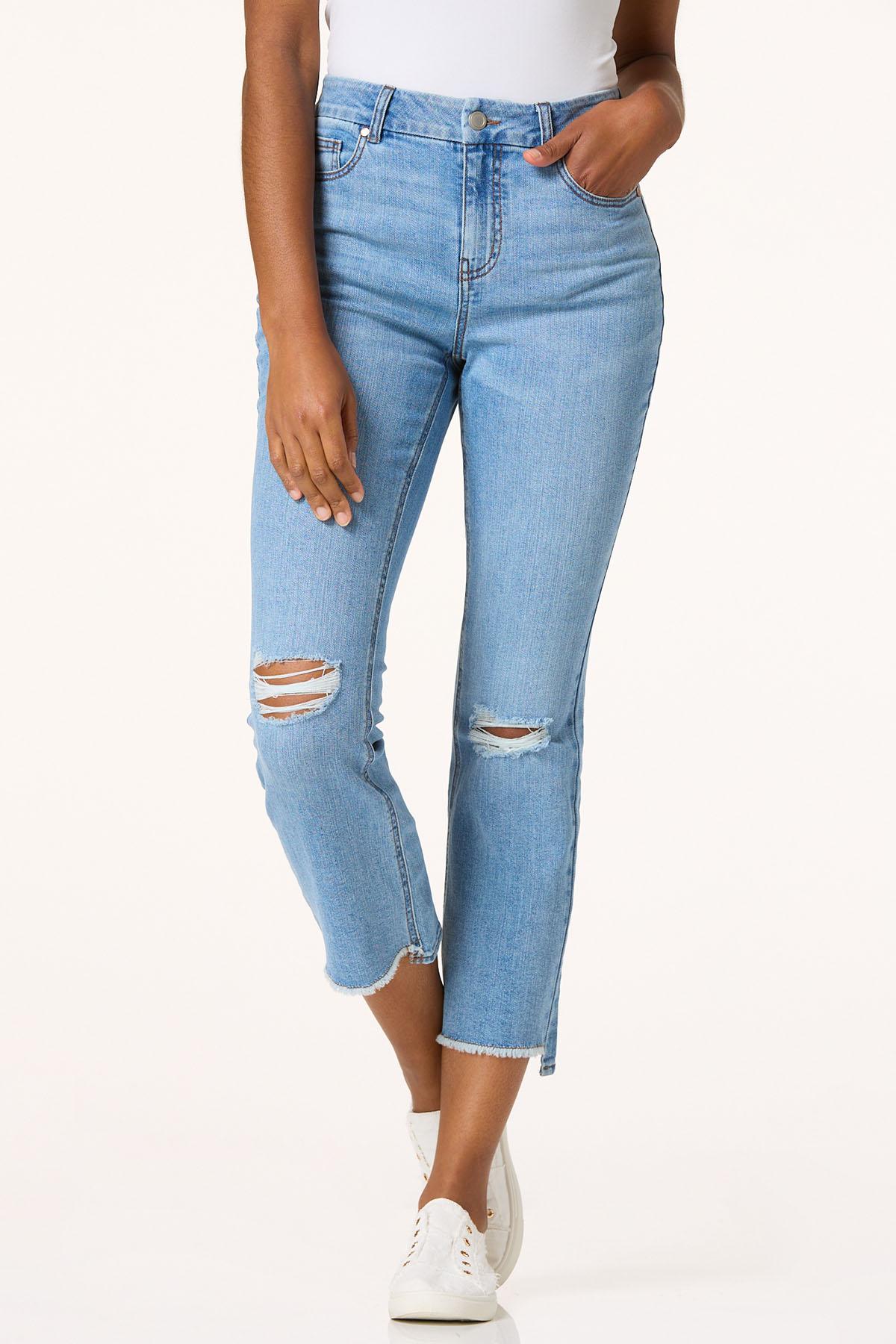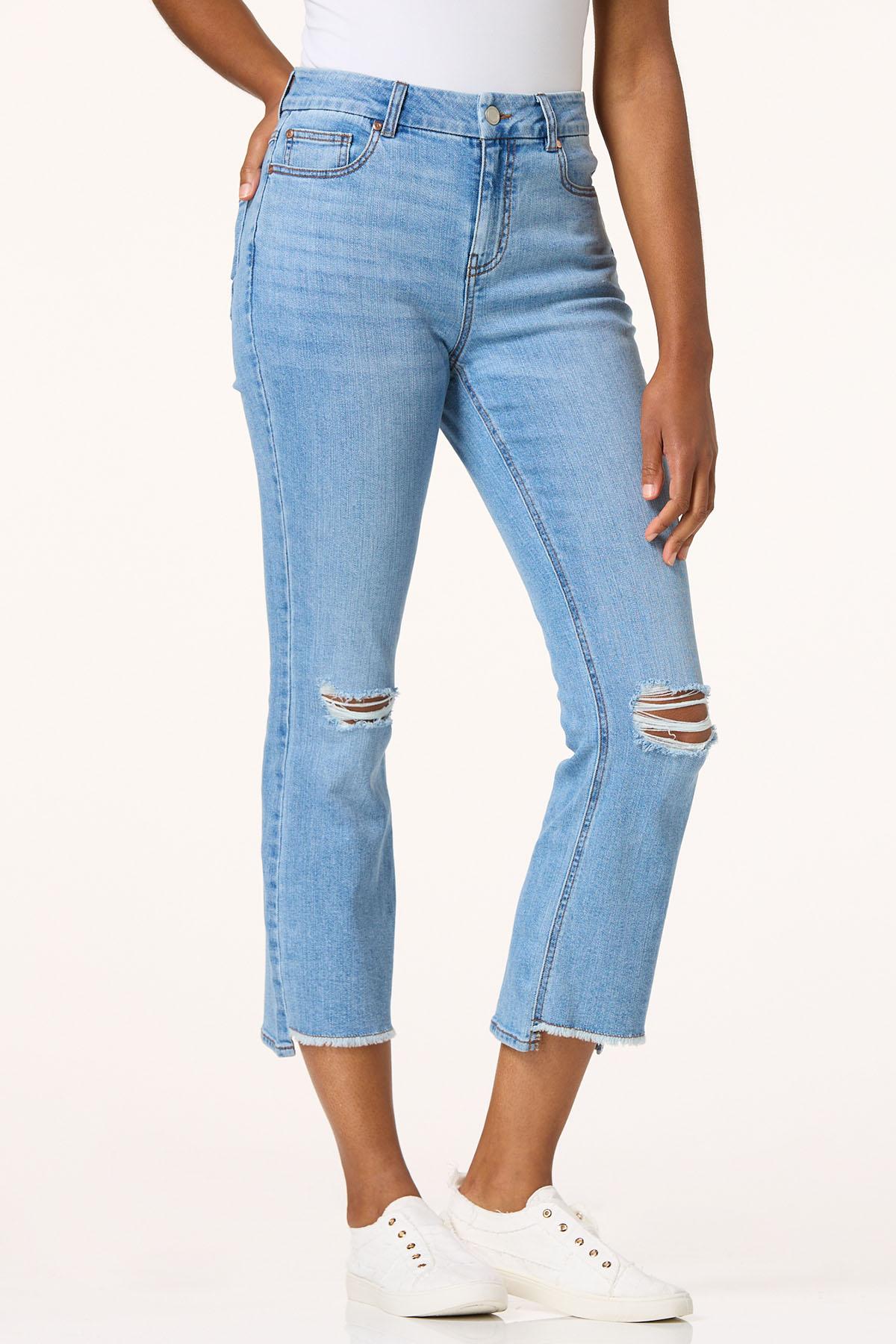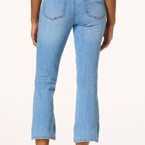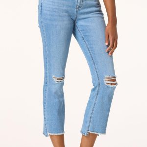 Looking cute comes easy with the laid back feel of this distressed-denim style, featuring a high-rise fit, modern, kick-flare hem and a stretchy fit for both comfort and a flattering finish.
