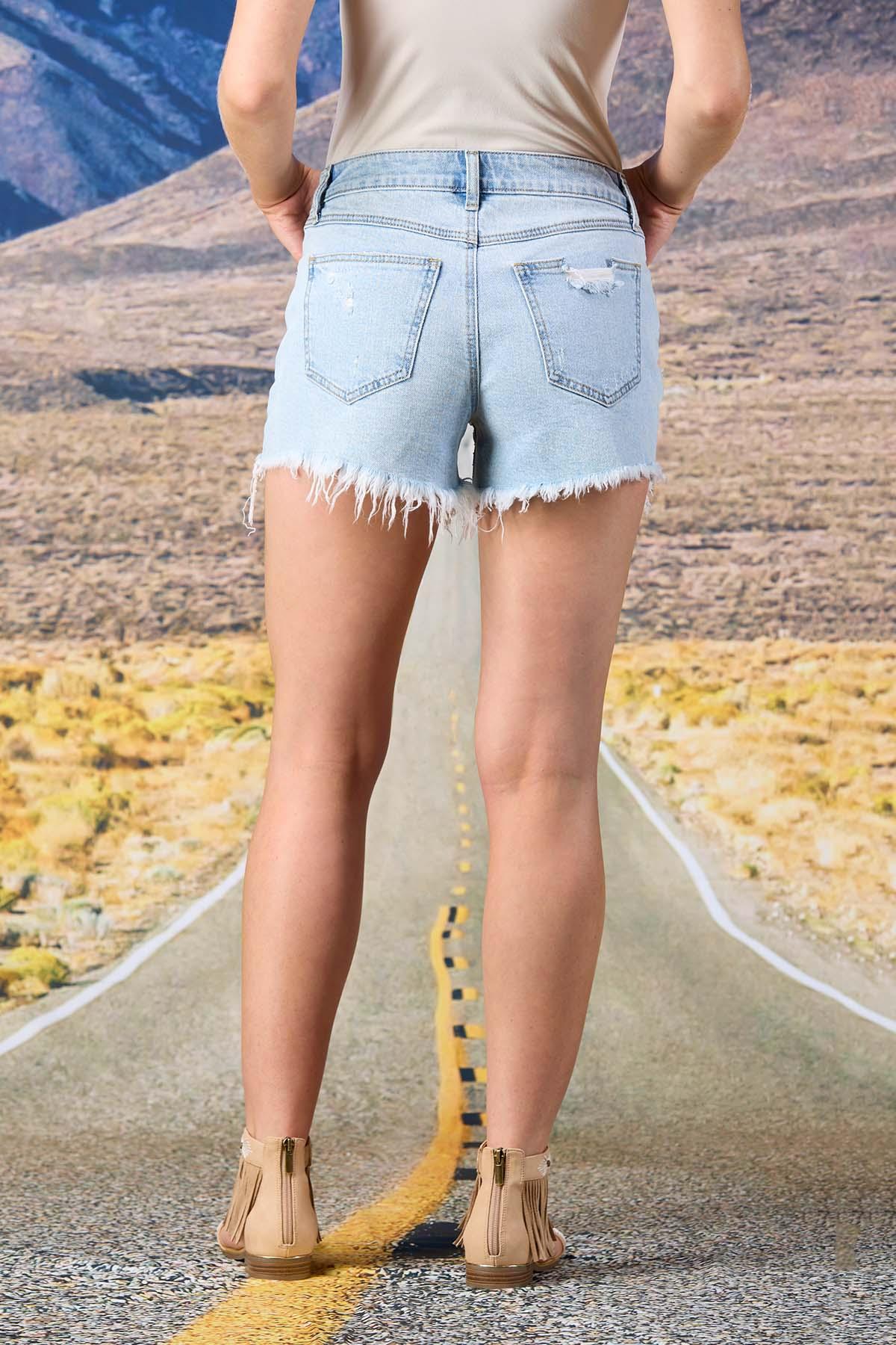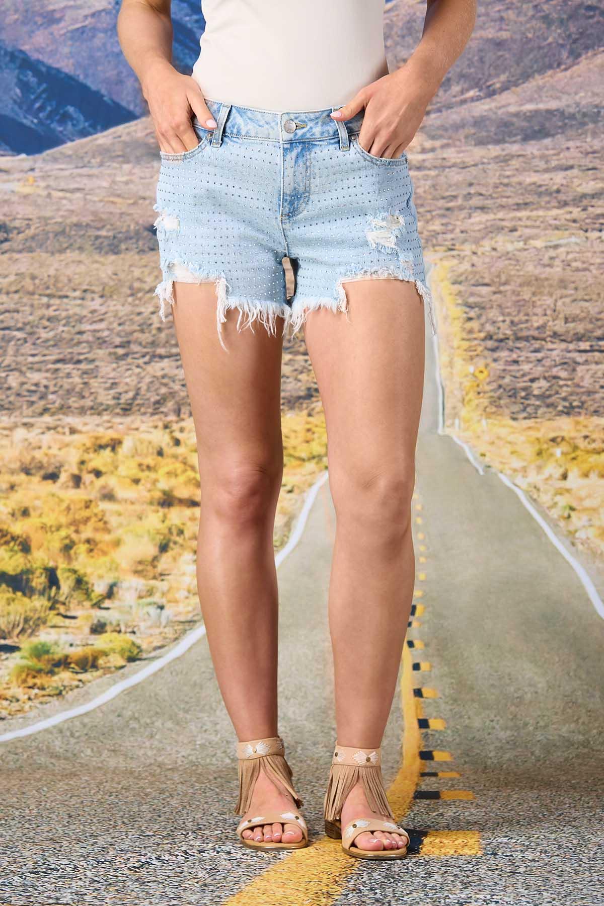 These shorts are so fun and fashionable, perfect for dancing the night away. Light-wash denim fabric features a classic mid-rise waist, a rhinestone-embellished front and distressed details along with a frayed hem.