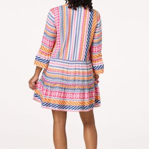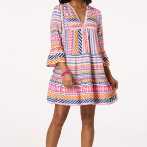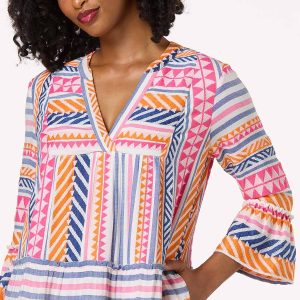 Make your summer wardrobe be a memorable one with this swoon-worthy dress. A surplice, v-neckline, ruffled trim and buttery-soft feel are just the beginning. When you add the worldly-Aztec print, vibrant color palette and lined design, you get a picture-perfect finish that everyone will be crushing on.