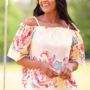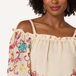 A beautiful day is guaranteed in store when you have this charming look to wear. Adjustable straps meet a ruffled neckline, while cold shoulder sleeves, a soft-gauze texture and floral embroidery come together for a look you’ll love for those moments in the sun.