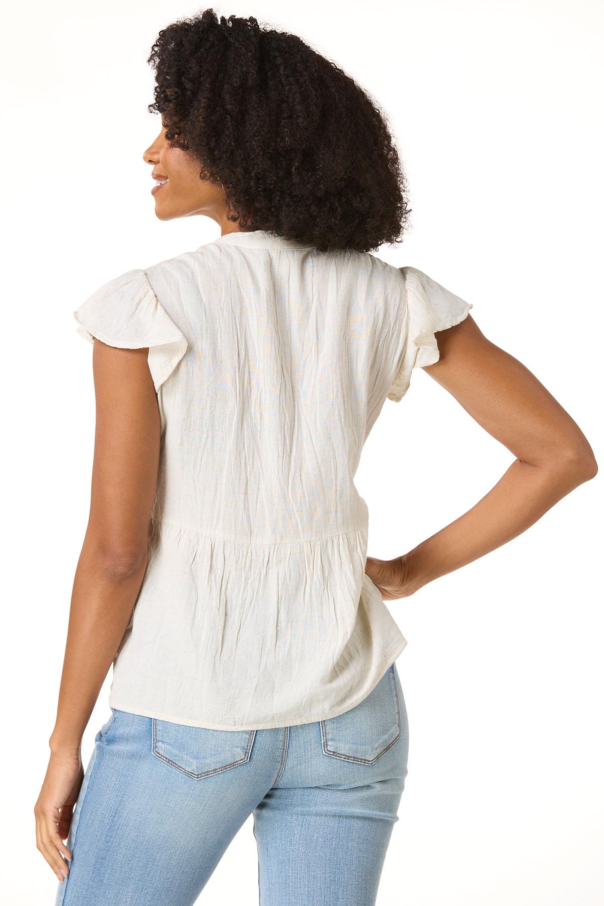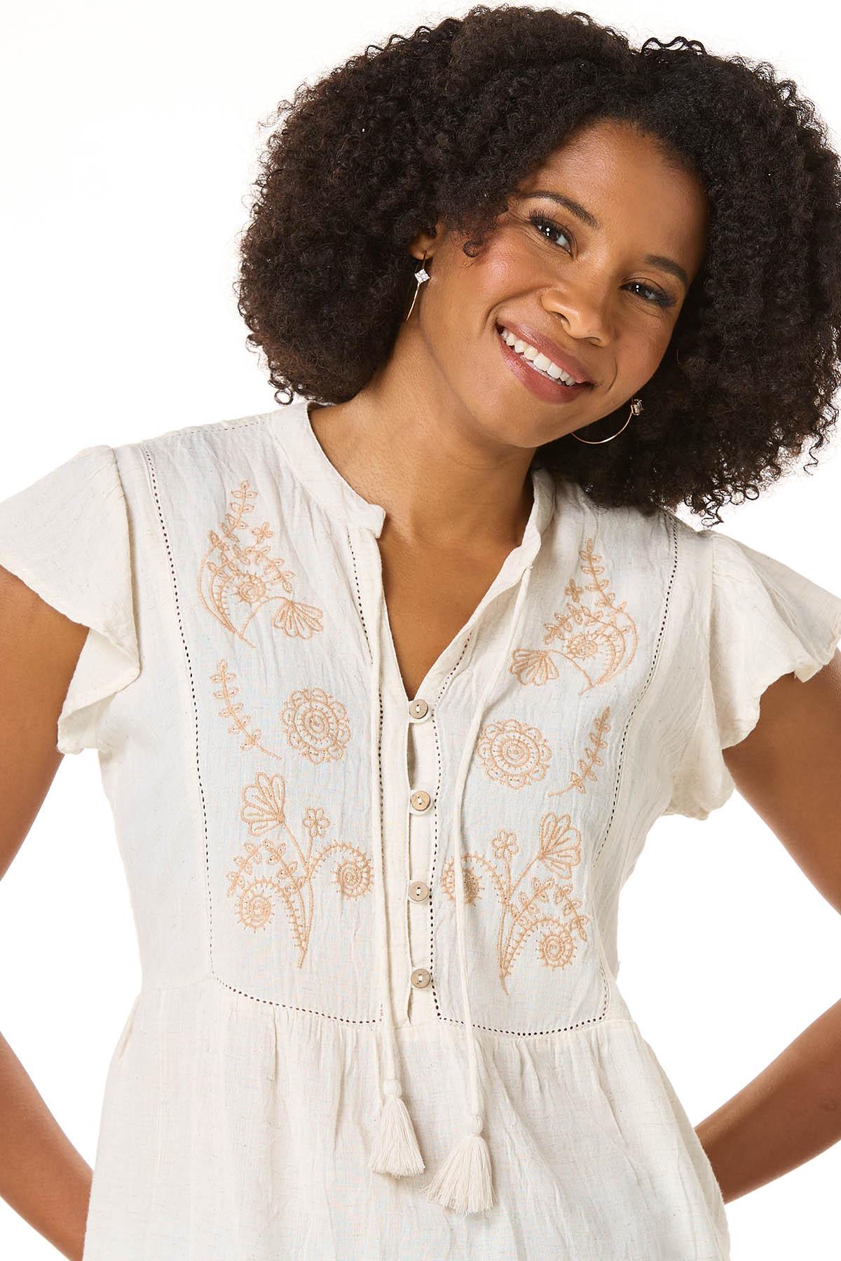 Breezy and romantic, this lightweight linen-blend poet top features delicate embroidery, a tassel-tie neckline, and short ruffle sleeves. The perfect style for warm, carefree days.