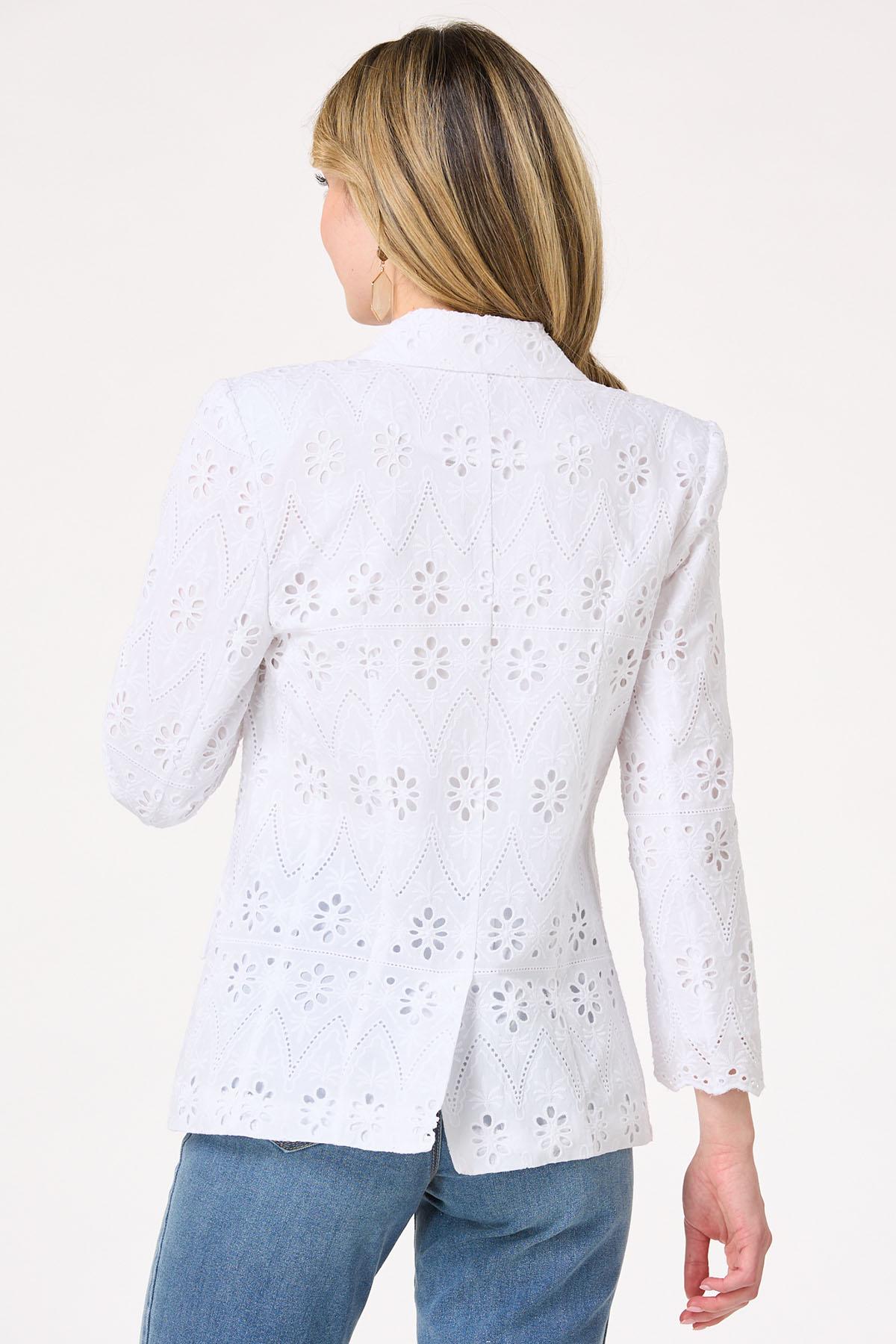 Show off chic-sophistication with this beautiful blazer. Part of our Cato Collection, this piece will have you swooning with an allover eyelet design, bright-white hue, pleated back and front pocket detail. A classic silhouette topped with a darling design – what’s not to love about this limited edition look.