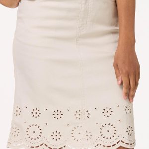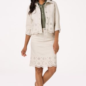 How adorable you’ll look when you show up wearing this beyond-blue denim style. The other half to our matching denim jacket, ths skirt features a button closure, tan hue, stretchy fit and scalloped-eyelet hem.