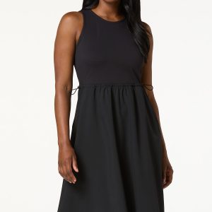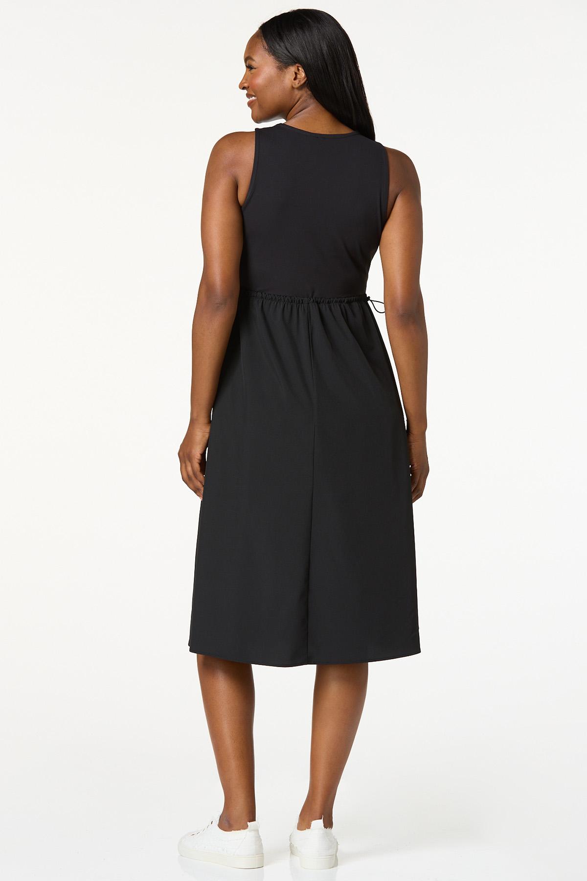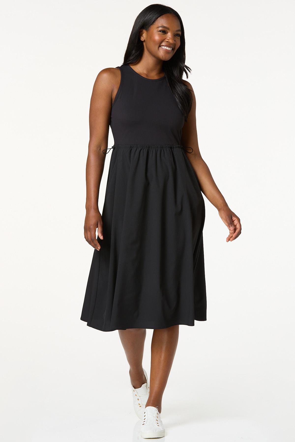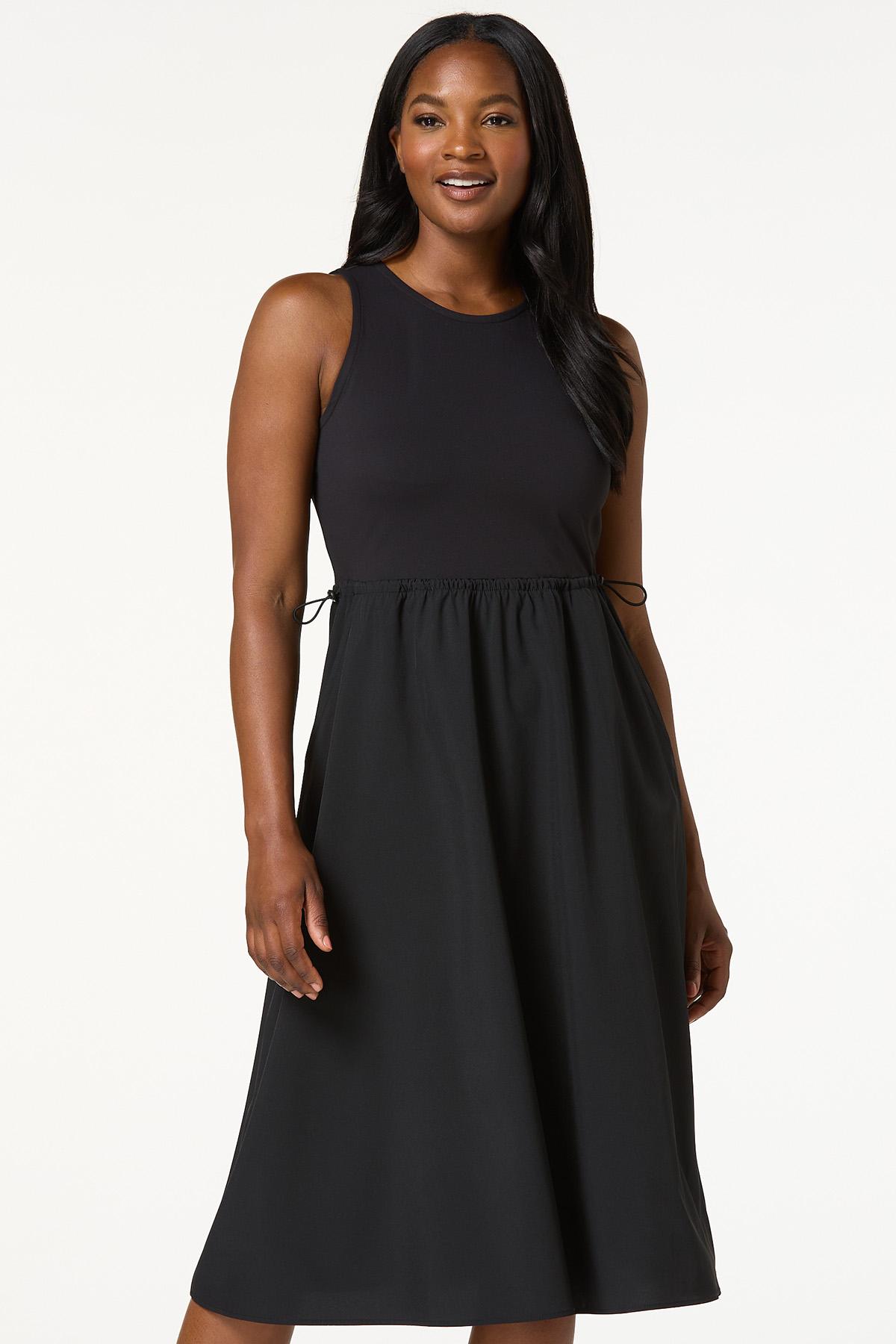 An athleisure style that’s equal parts comfortable and stylish. The top half is made with stretchy-soft knit fabric with a crew neckline and a sleeveless style with a cinched drawstring-pull waist, side pockets and a skirt made of super lightweight-woven fabric. So light, comfortable and perfect for when you’re on the move.