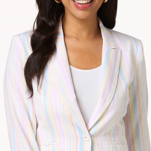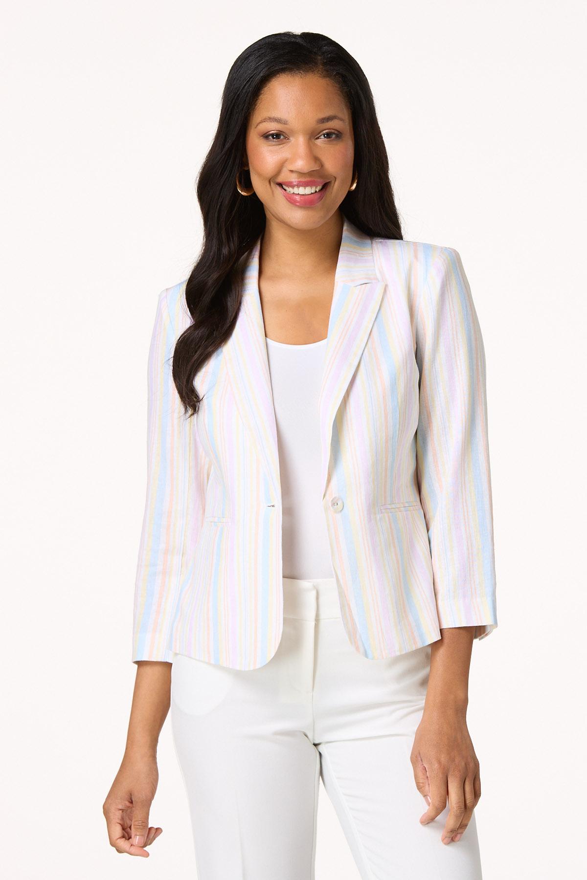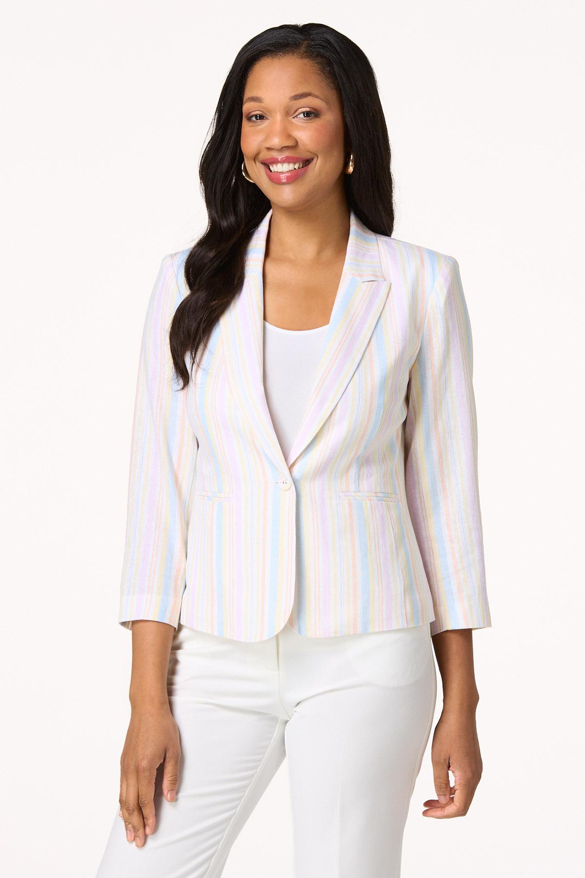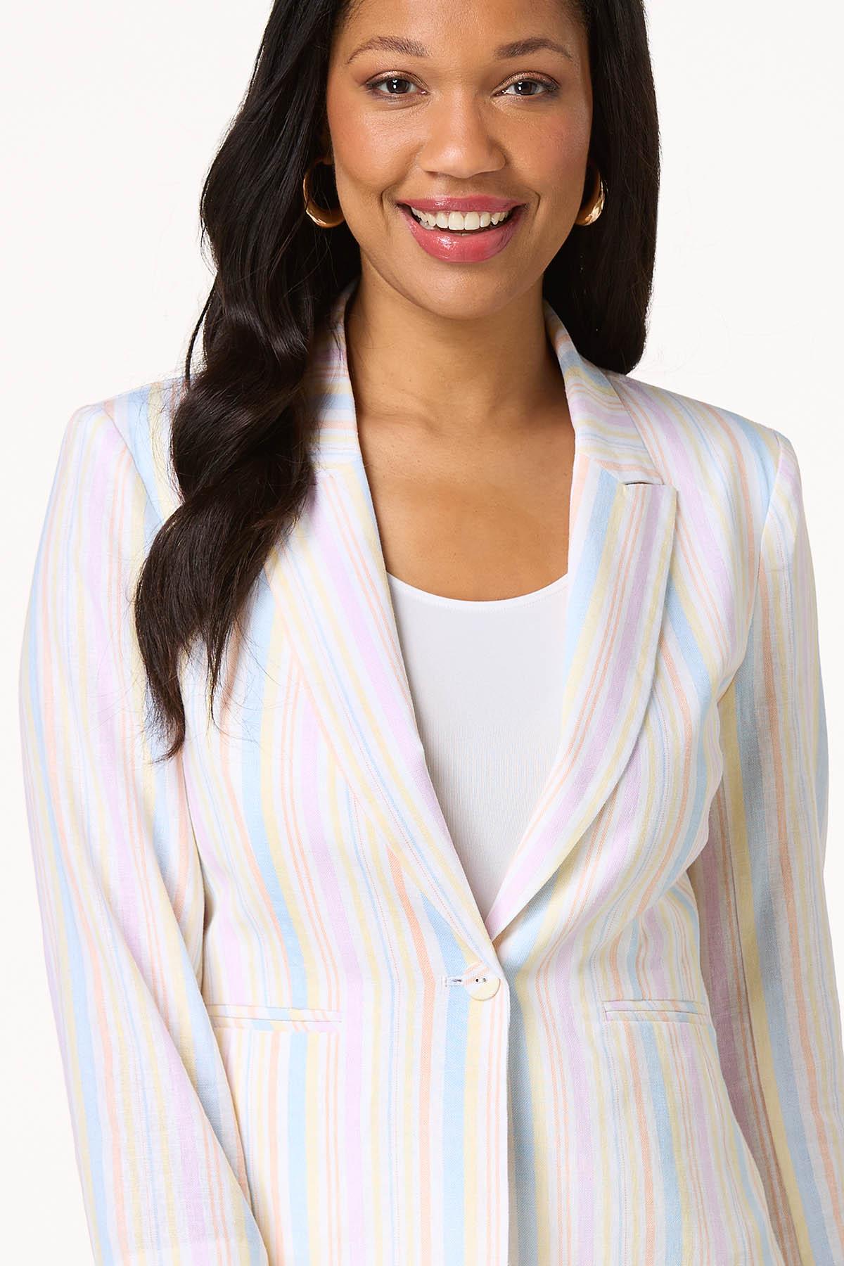 You’re definitely going to want to work this layering piece into your wardrobe. A lightweight, linen-blend brings a cool feel to the stripe print, double-breasted collar and muted color palette of this chic, warm-weather blazer.