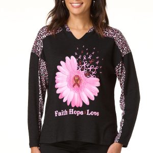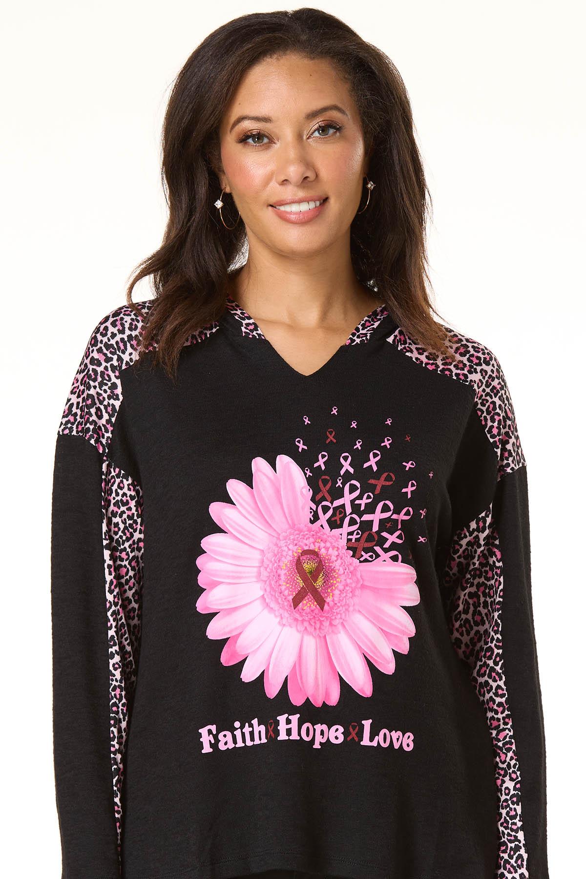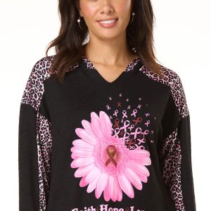 It’s positive vibes all day long with this pullover style, featuring a hacci knit, hooded neckline, leopard panel sleeves, symbolic pink ribbons and a “faith, hope, love” message for an uplifting finish.