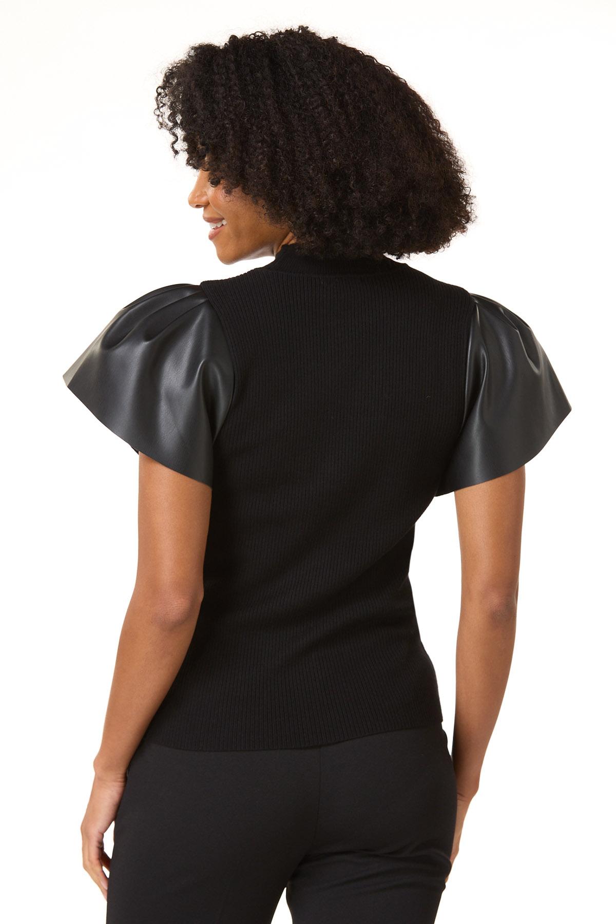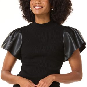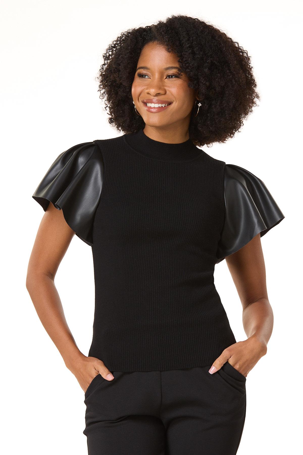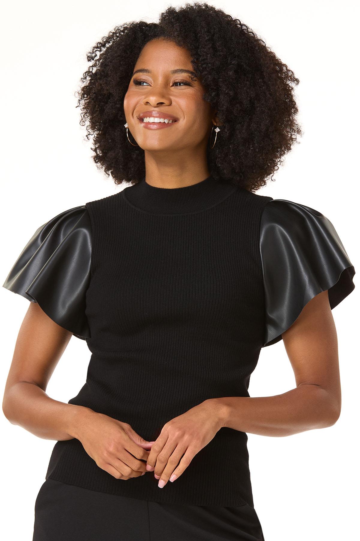 Cue the compliments with this chic, contemporary look, featuring a so-soft ribbed texture, classic shade and flutter sleeves in a faux leather fabric for a cool, contrasting finish.