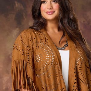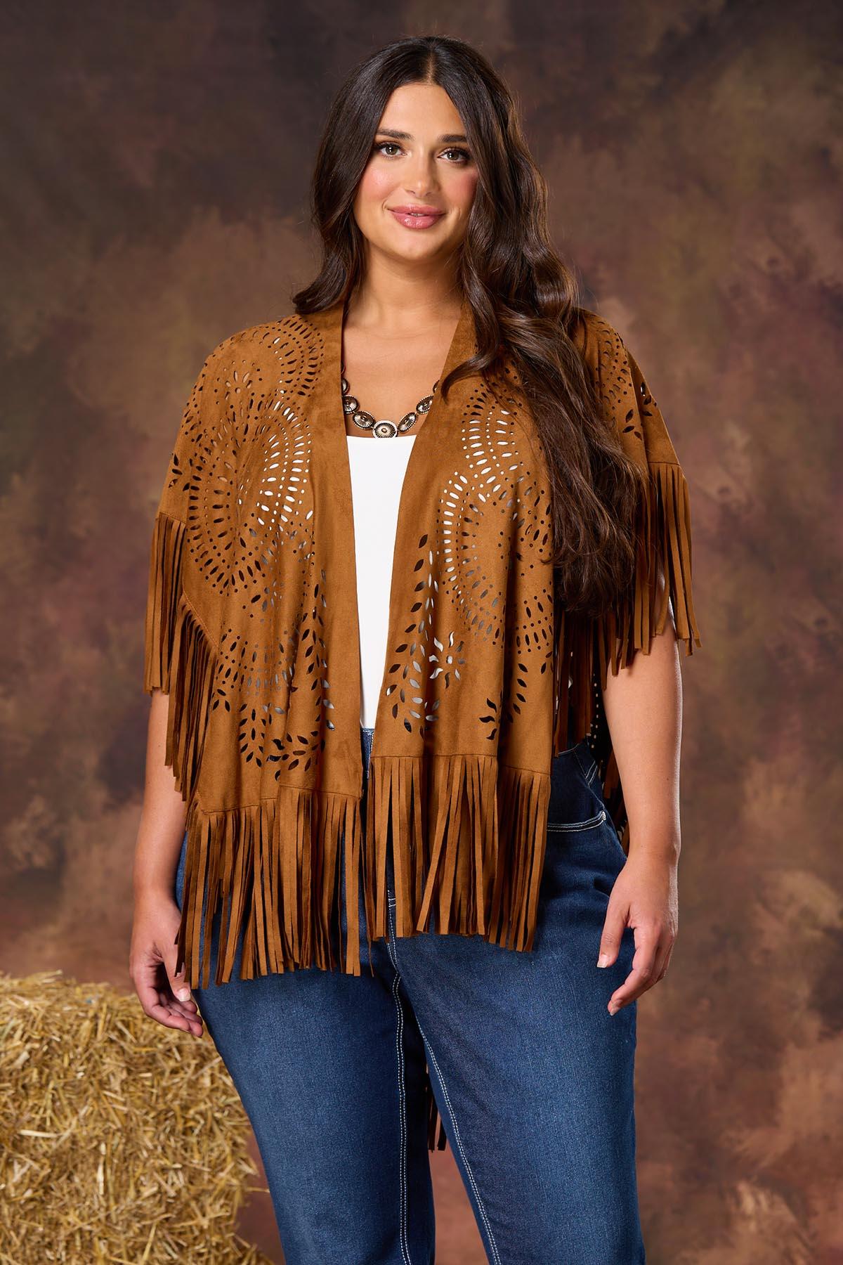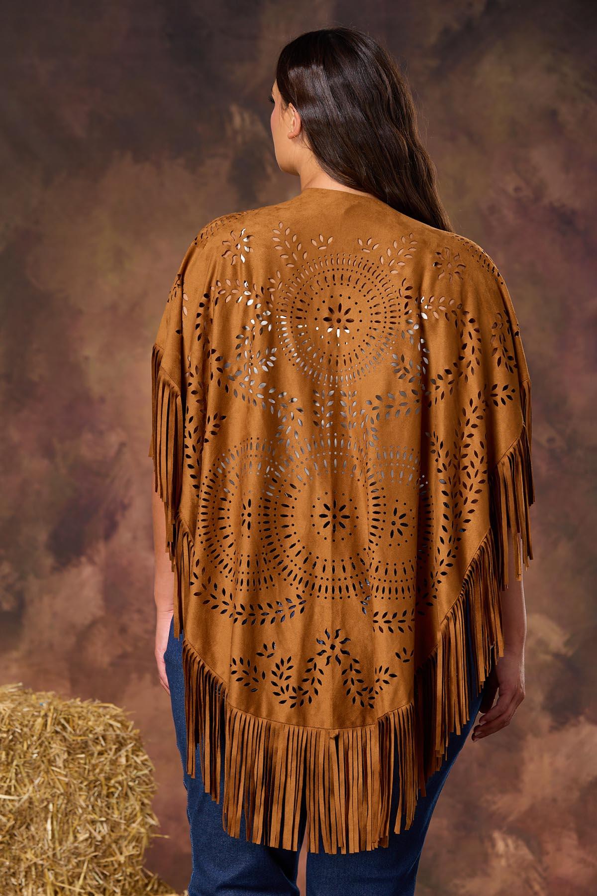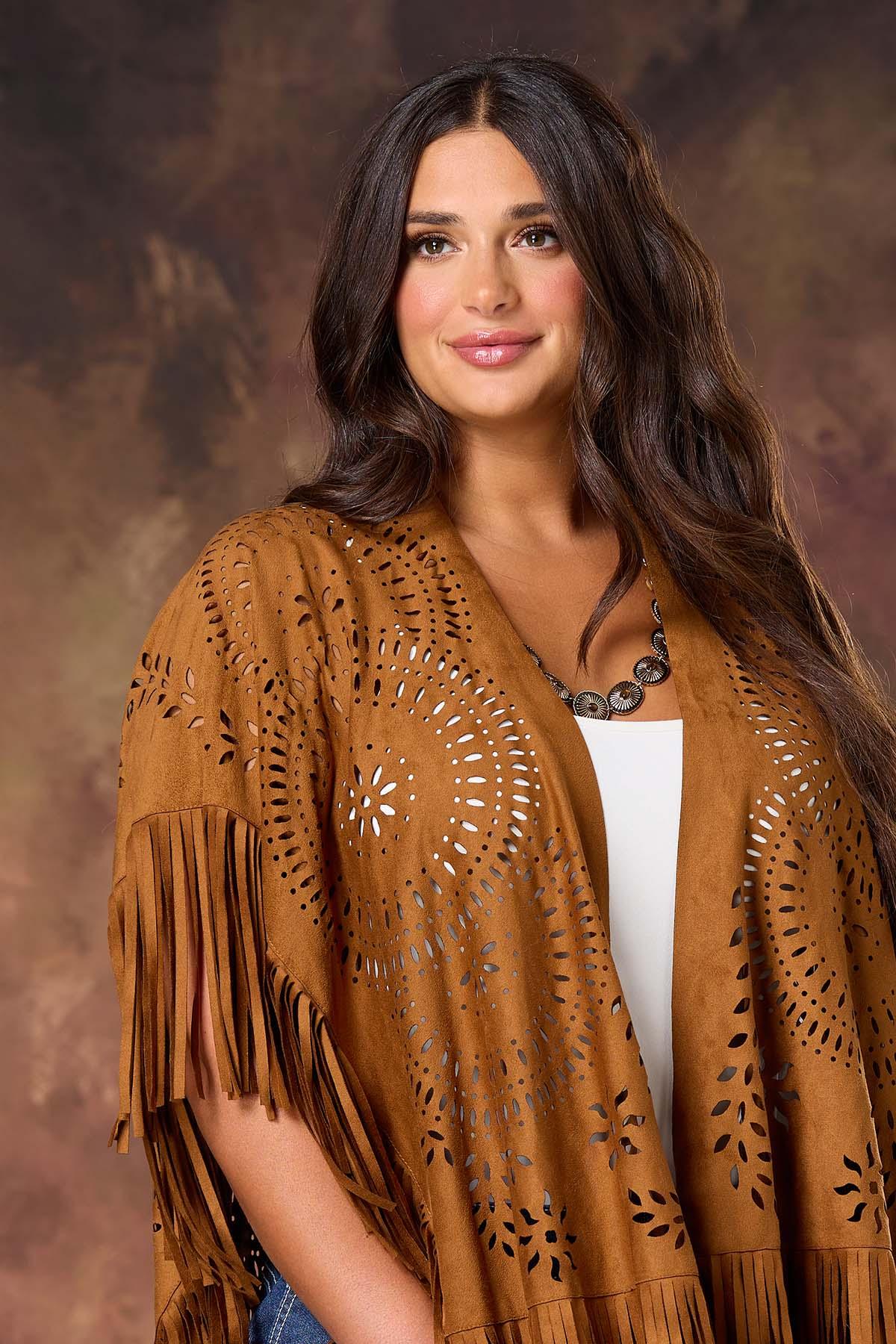 Fringe meets finesse in this faux suede laser-cut poncho. Soft, swingy, and made to move – it’s your go-to for wild nights and western vibes. Let’s rodeo!