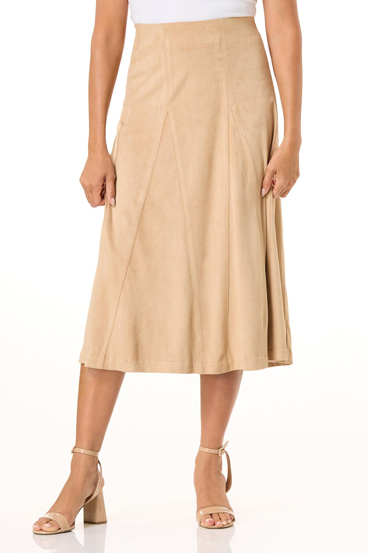 Soft meets structure in this faux suede godet skirt, designed in a neutral tan hue with a flattering pull-on waist. The flared silhouette moves with ease, bringing elegance to your everyday.