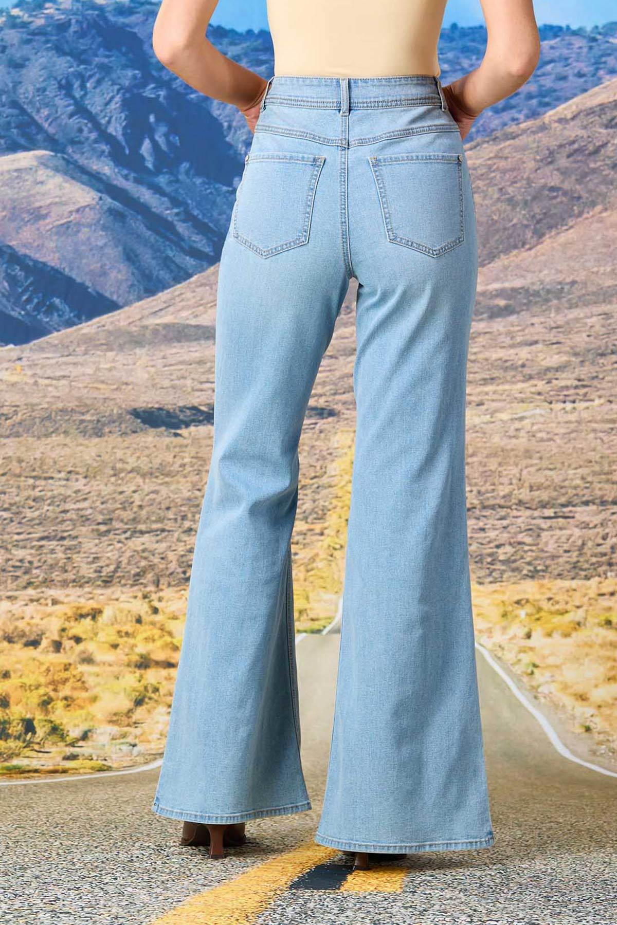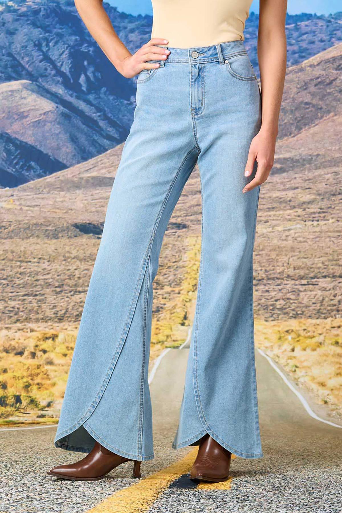 Step up your denim game with this fun-flared style, featuring a tulip hem, light wash blue and a comfortable stretch that’s not only comfortable, but just-so flattering, too.