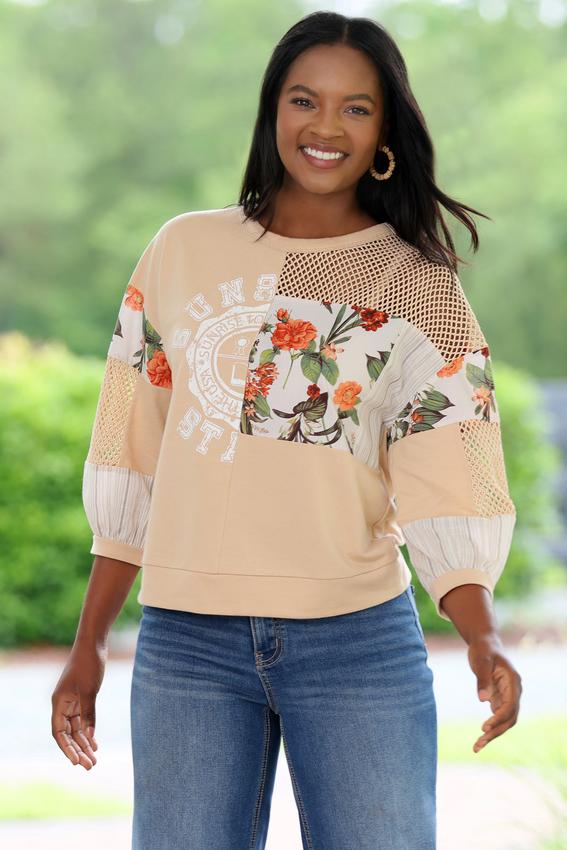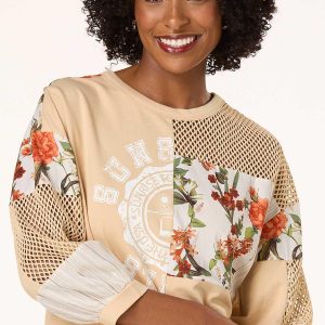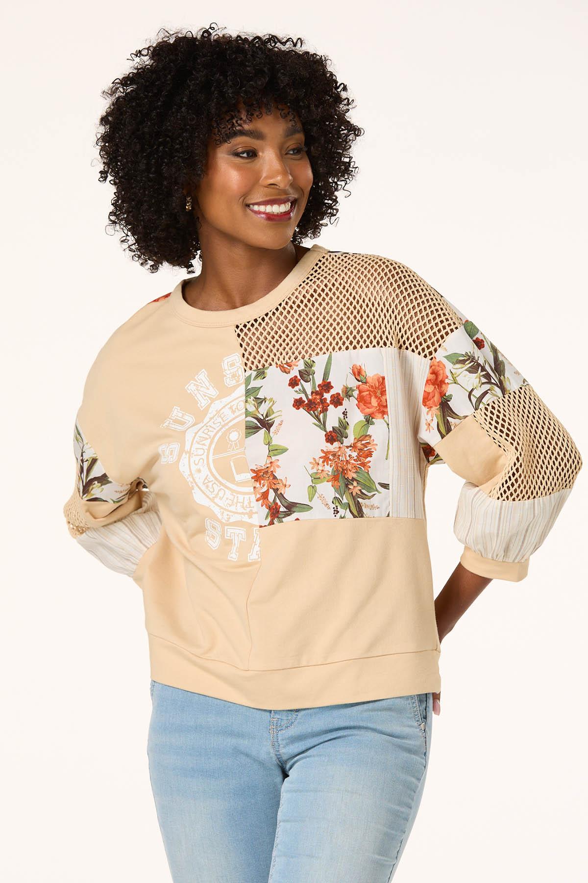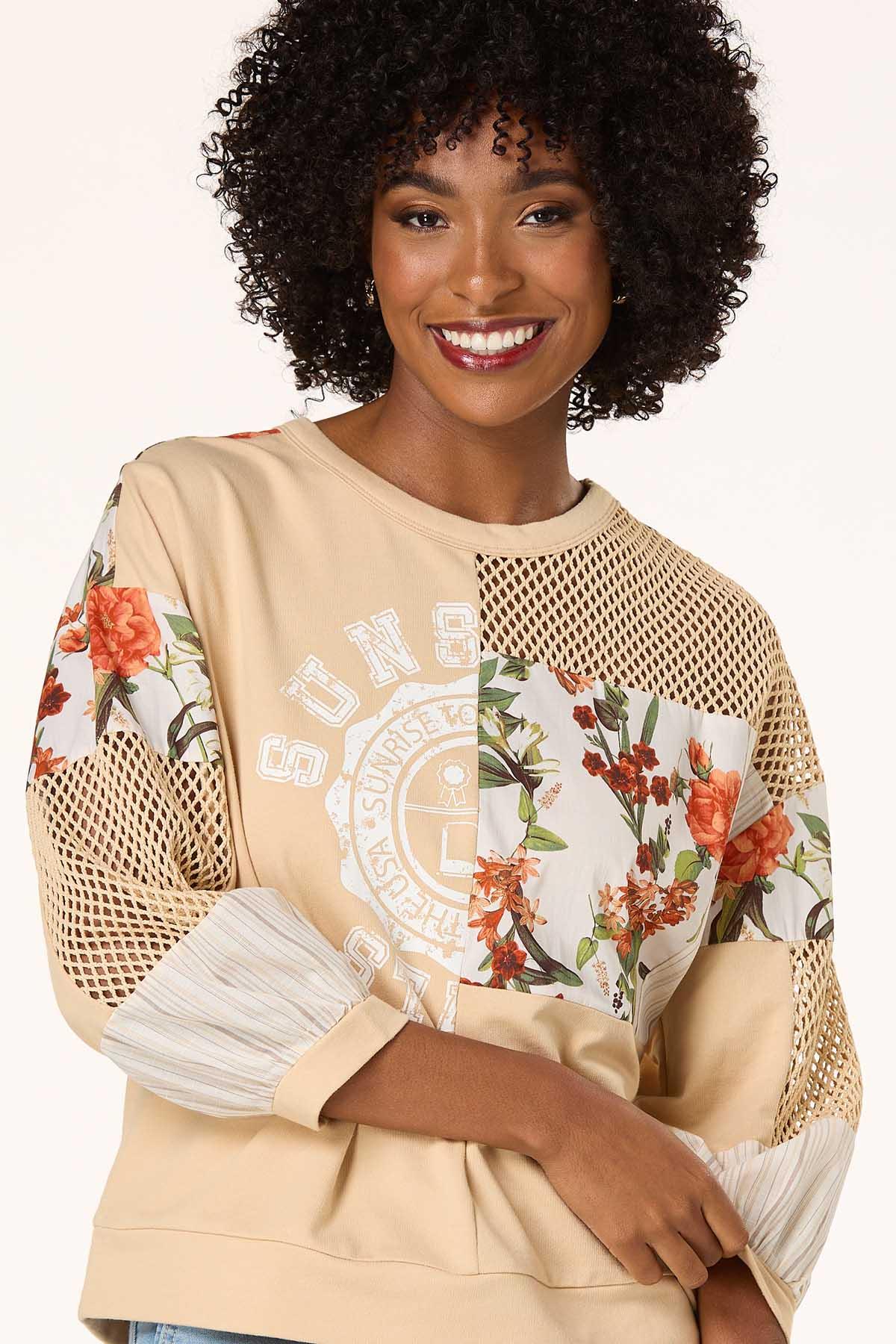 How sweet it is to be in loved by new, especially when it’s a cute and cozy style like this. A scoop neckline, mesh panels, floral patchwork and a stripe print come together creating this limited edition style that relaxed and ready when you are.