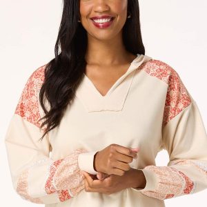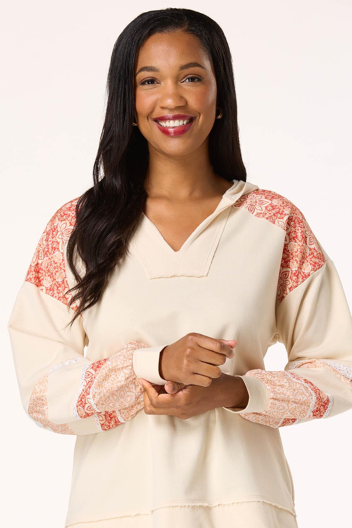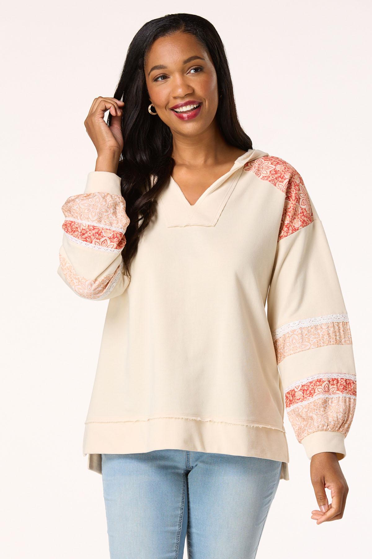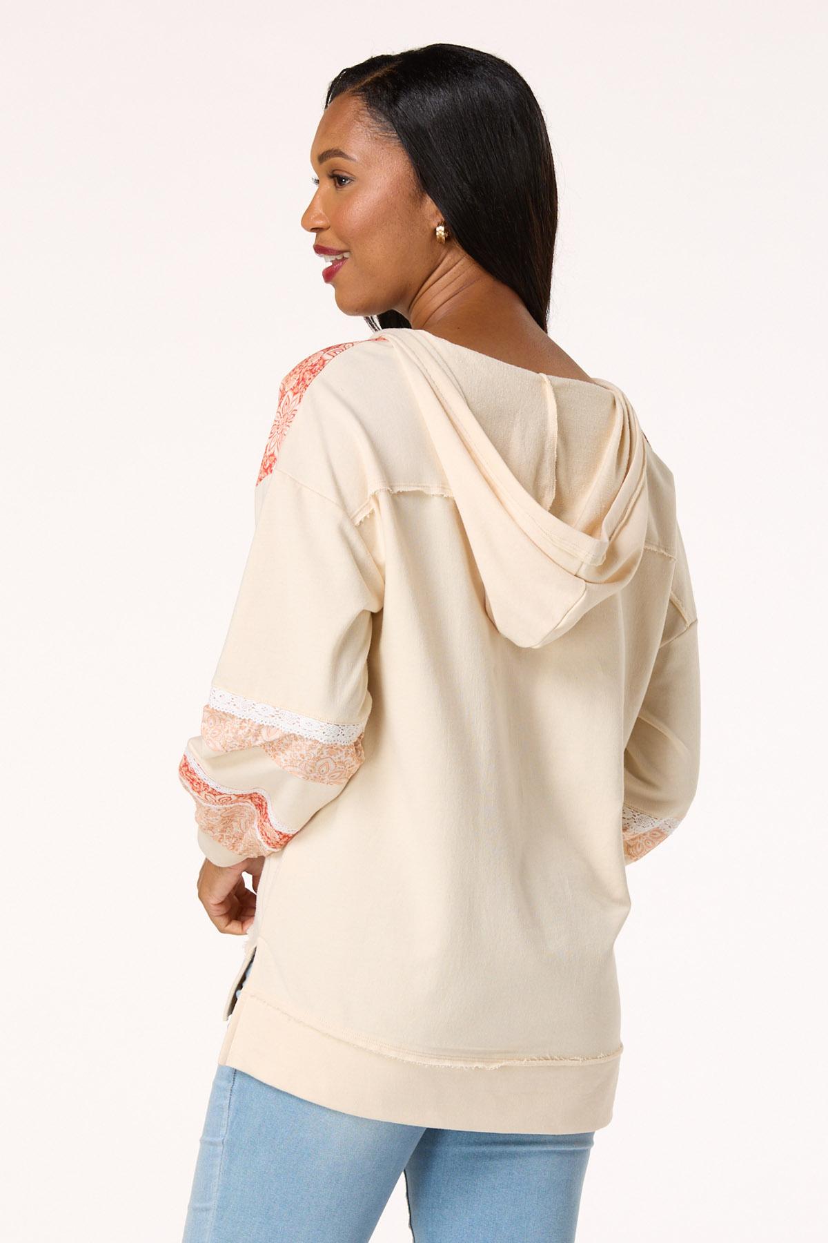 Get cozy and look adorable while you’re at it with this comfy hoodie, featuring a hooded, v-neckline, raw edge trim, floral panels and lace trim. A beige and orange color palette are topped by a relaxed fit and high-low hem for a look you’ll want to live in time and time again.
