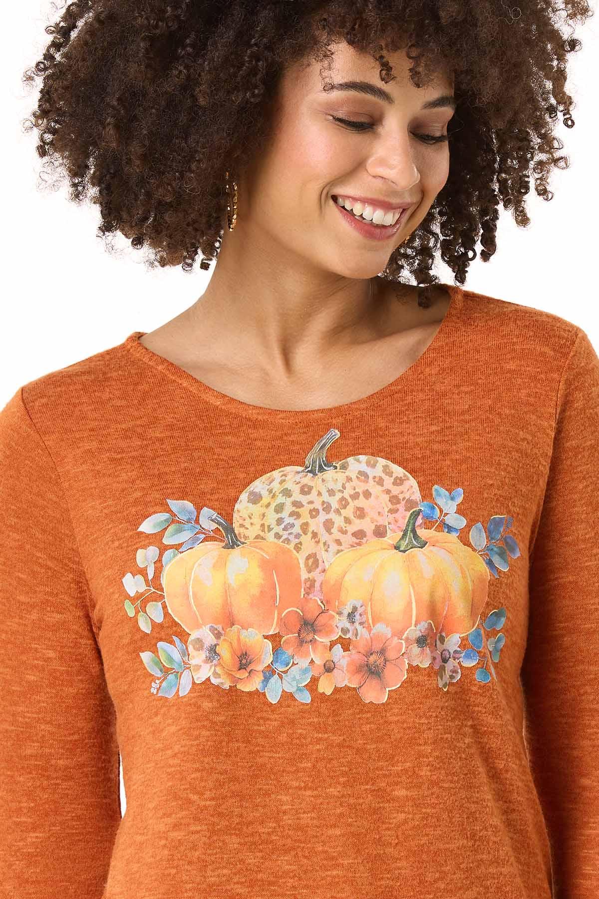 With autumn afternoons just around the corner, you’ll blend right in with this beloved hacci-knit style. Featuring a scoop neckline, relaxed fit, and a charming pumpkin and watercolor-floral graphic, it’s so soft and cozy – perfect for every fall moment you show up for.