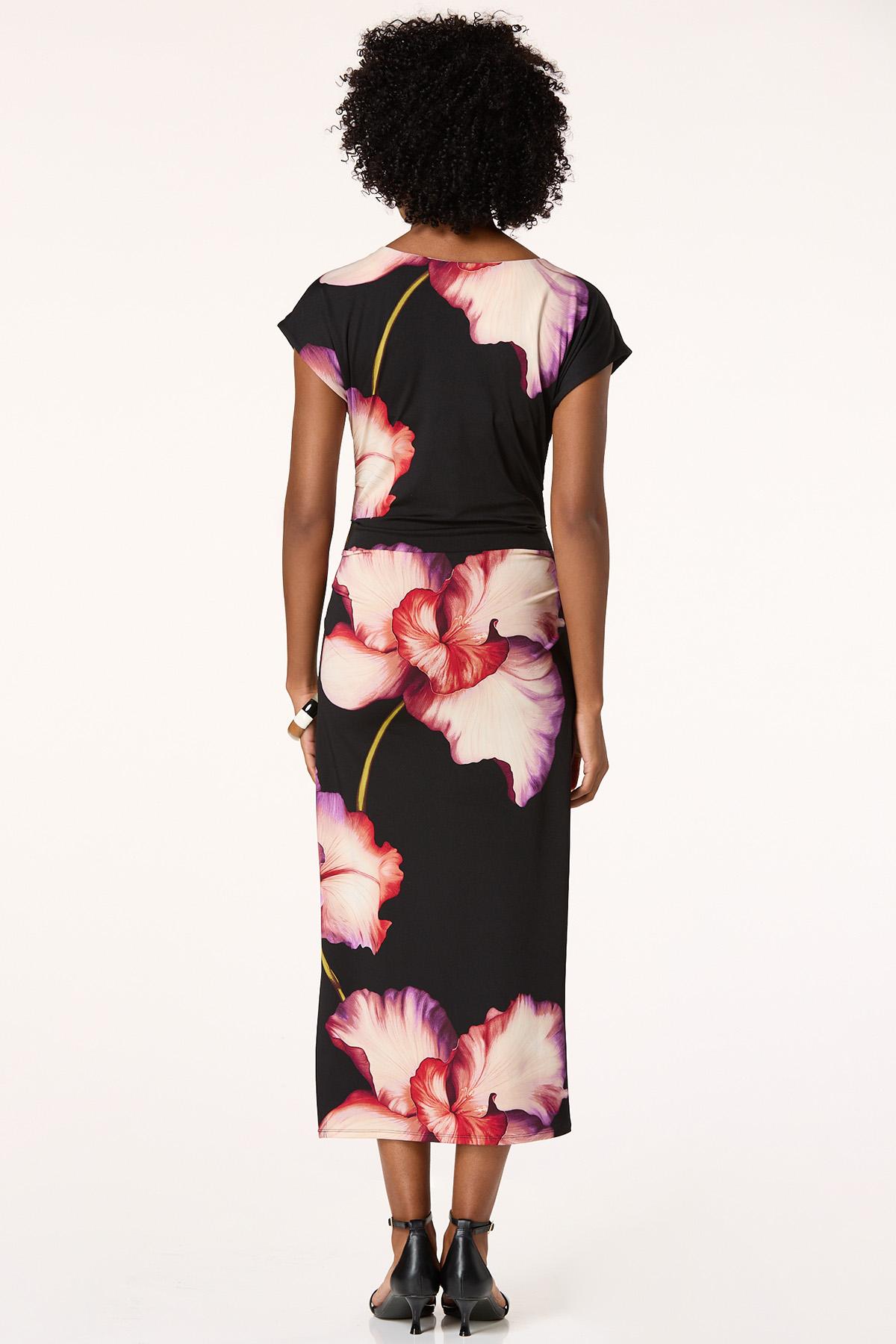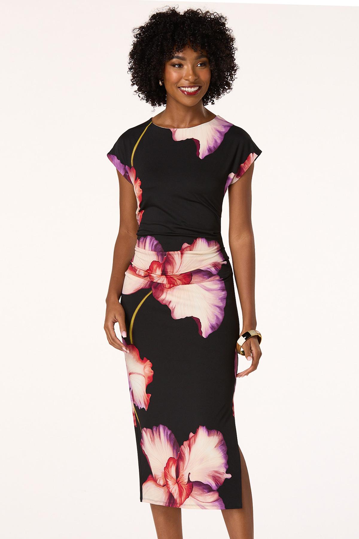 Let your wardrobe blossom with this stunning style. A scoop neckline meets a sleek-stretchy fabric adorned with a romantic floral print and cinched sides for both a comfortable and flattering finish.