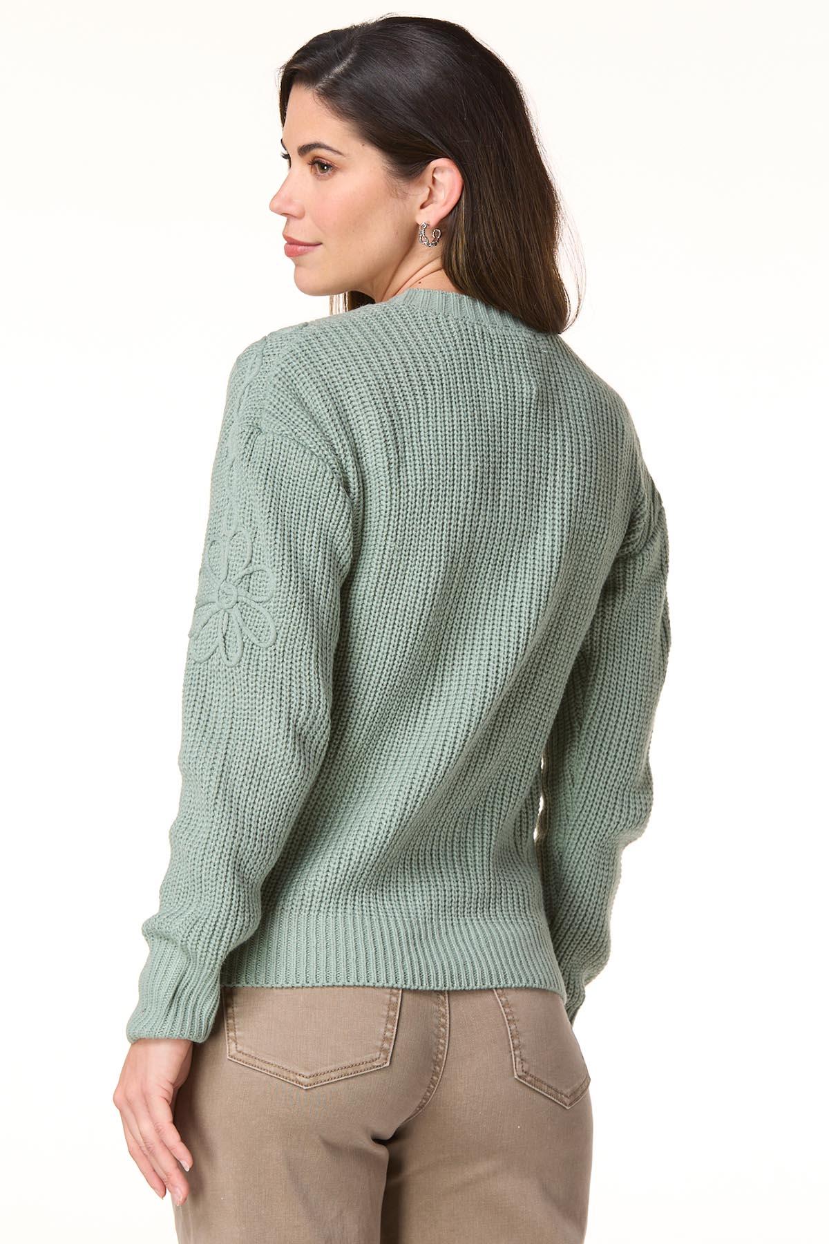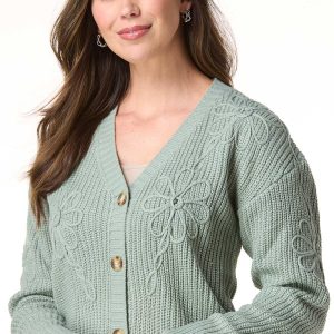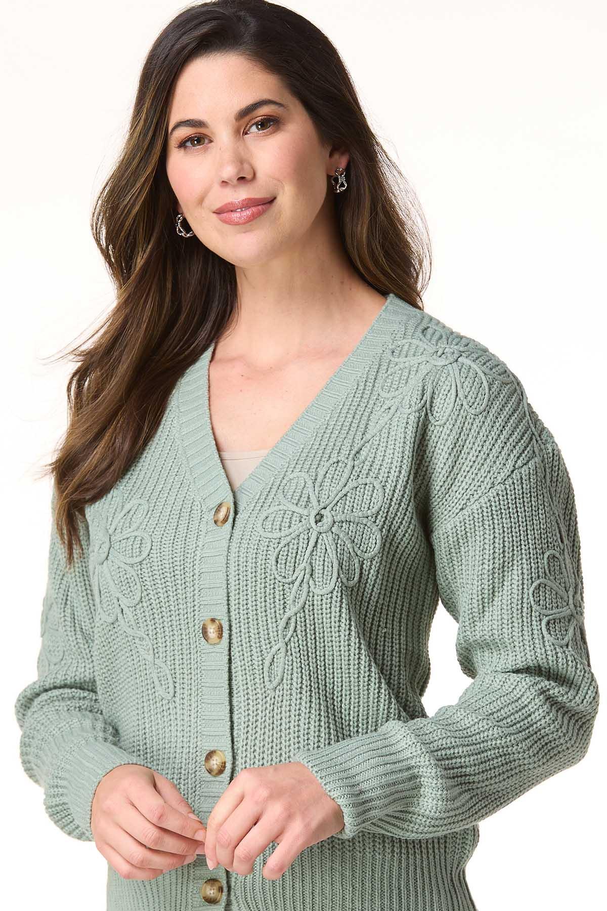 Soft, sweet, and easy going … this button-down cardigan in a calming sage green features floral soutache detailing for a touch of charm. Perfect for layering when you want comfort with a feminine twist.