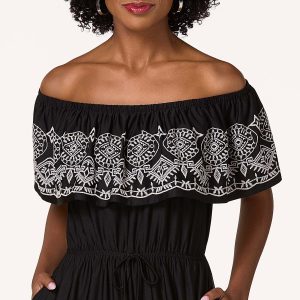 This dressy style is so cute, comfortable and stylish with a contrasting-color combo. Lightweight-stretchy knit fabric features a black hue with an off-the-shoulder neckline, a flounced neck trim with a white-geo embroidered print, a cinched waist with a drawstring-tie waist, side pockets and a wide-leg fit with flounced-embroidered hem details.