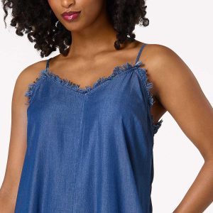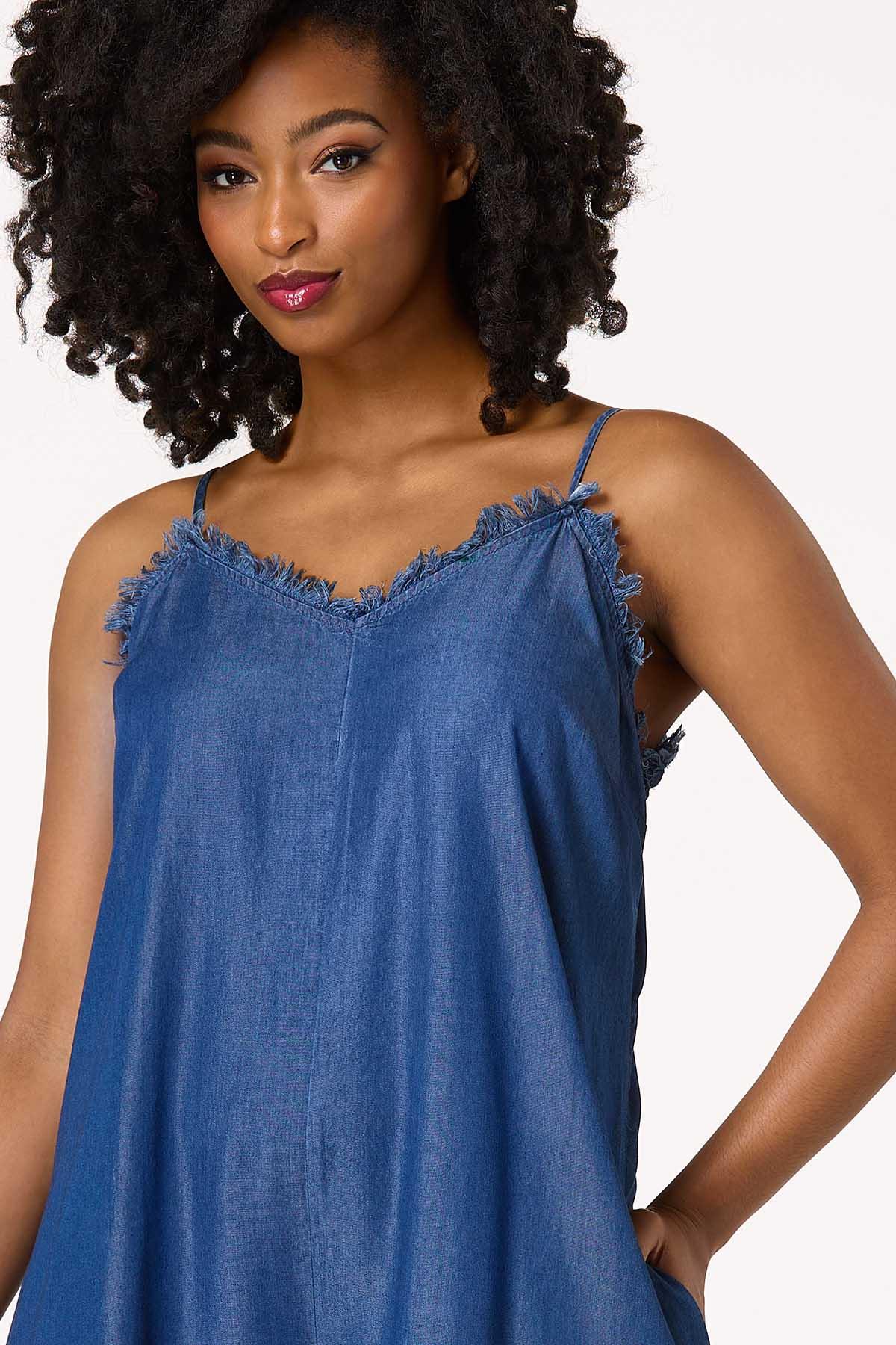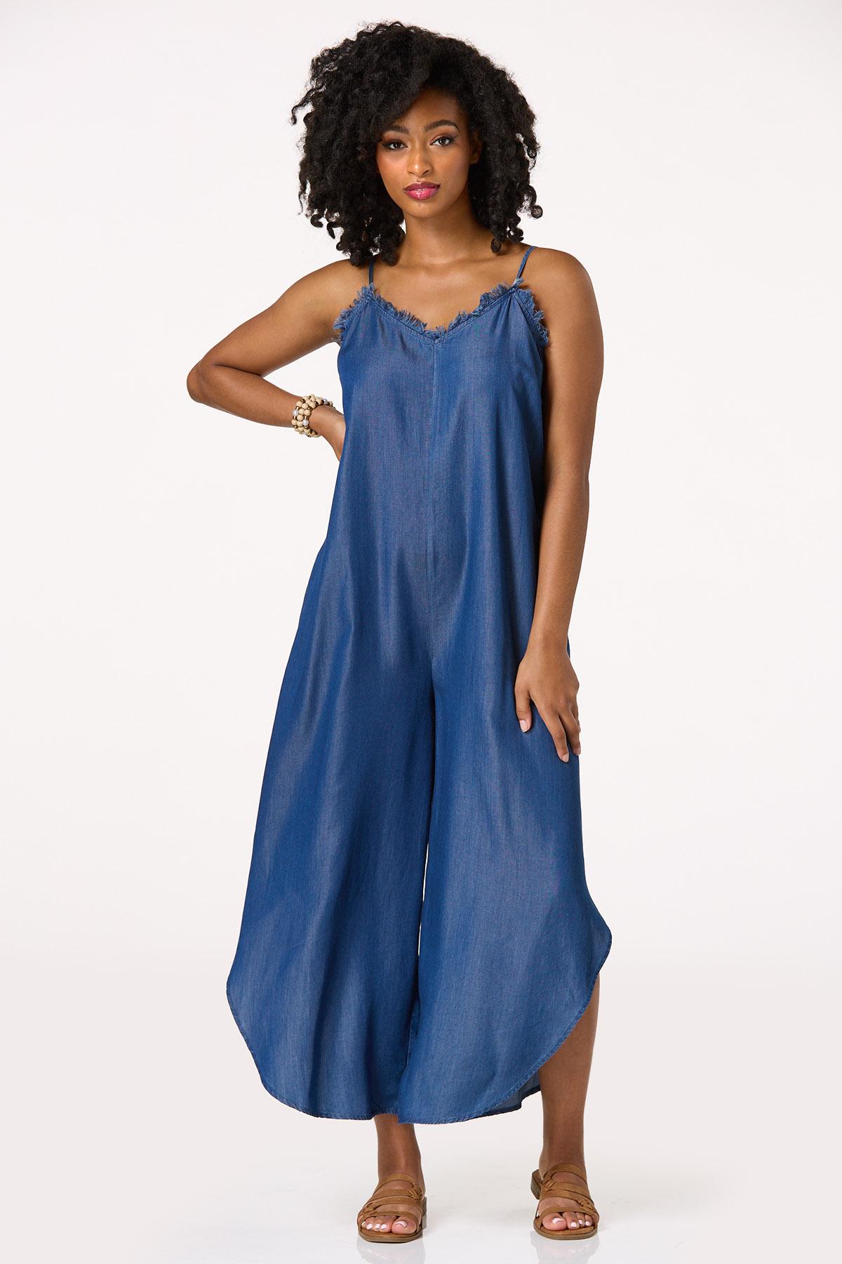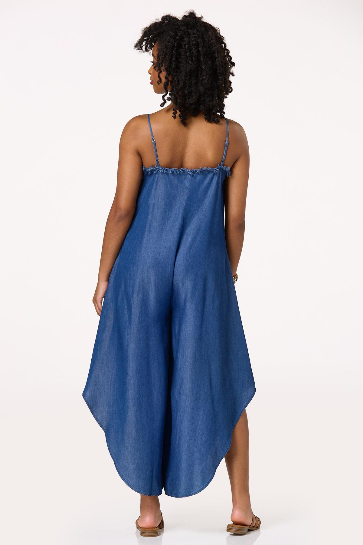 How cute you’ll look when you take on the day wearing this effortless, one-piece style. A frayed v-neckline, lightweight fabric and denim blue hue top off an asymmetrical, wide leg hem for a fun, free-spirited vibe that can be worn as is or with a belt for a chic, cinched finish.