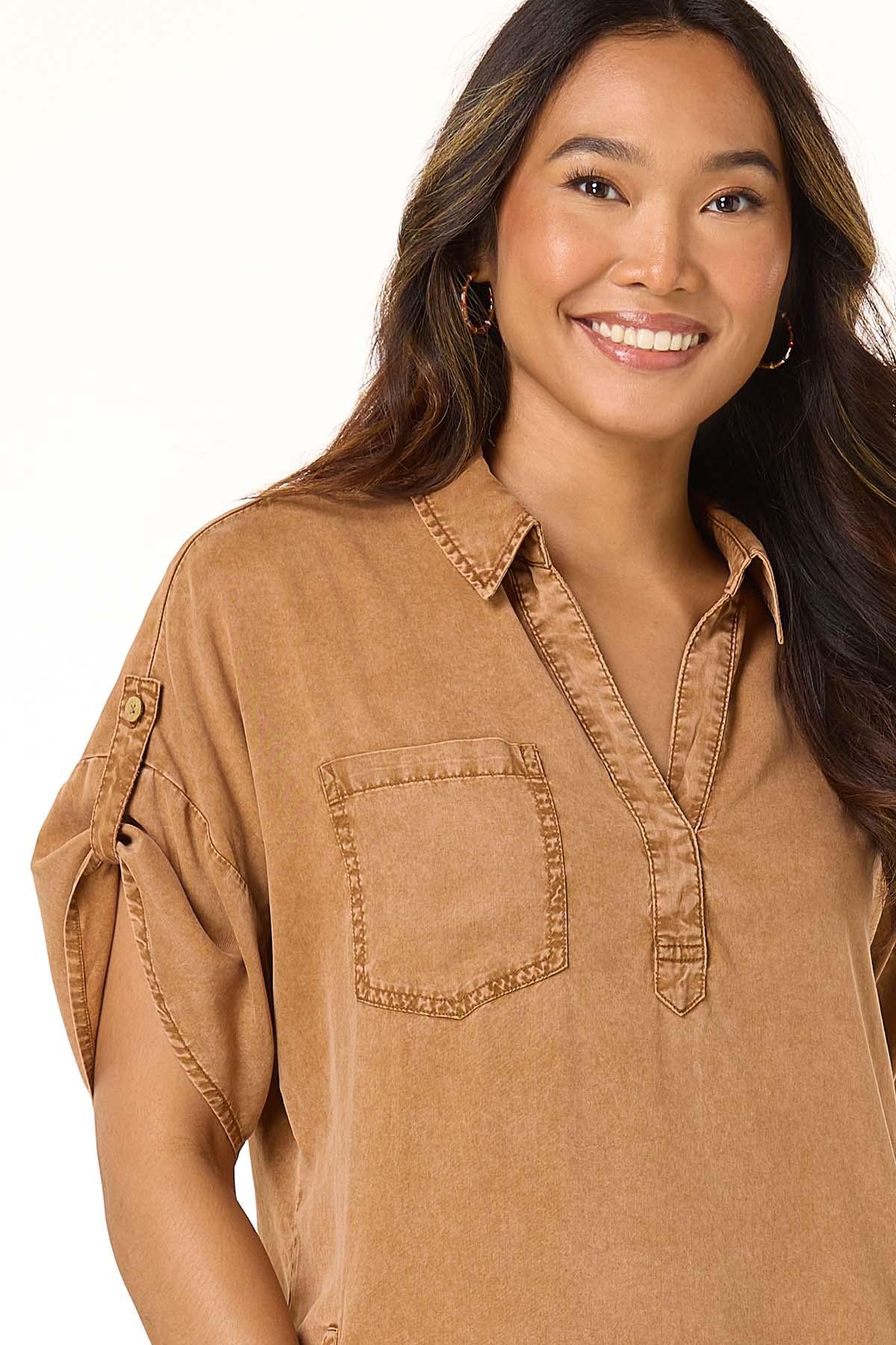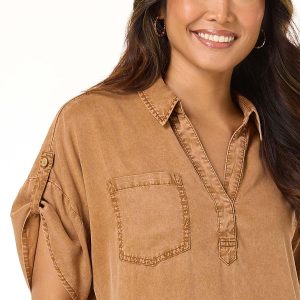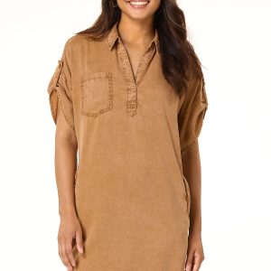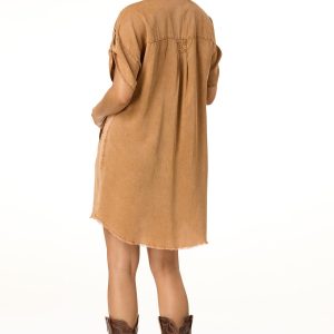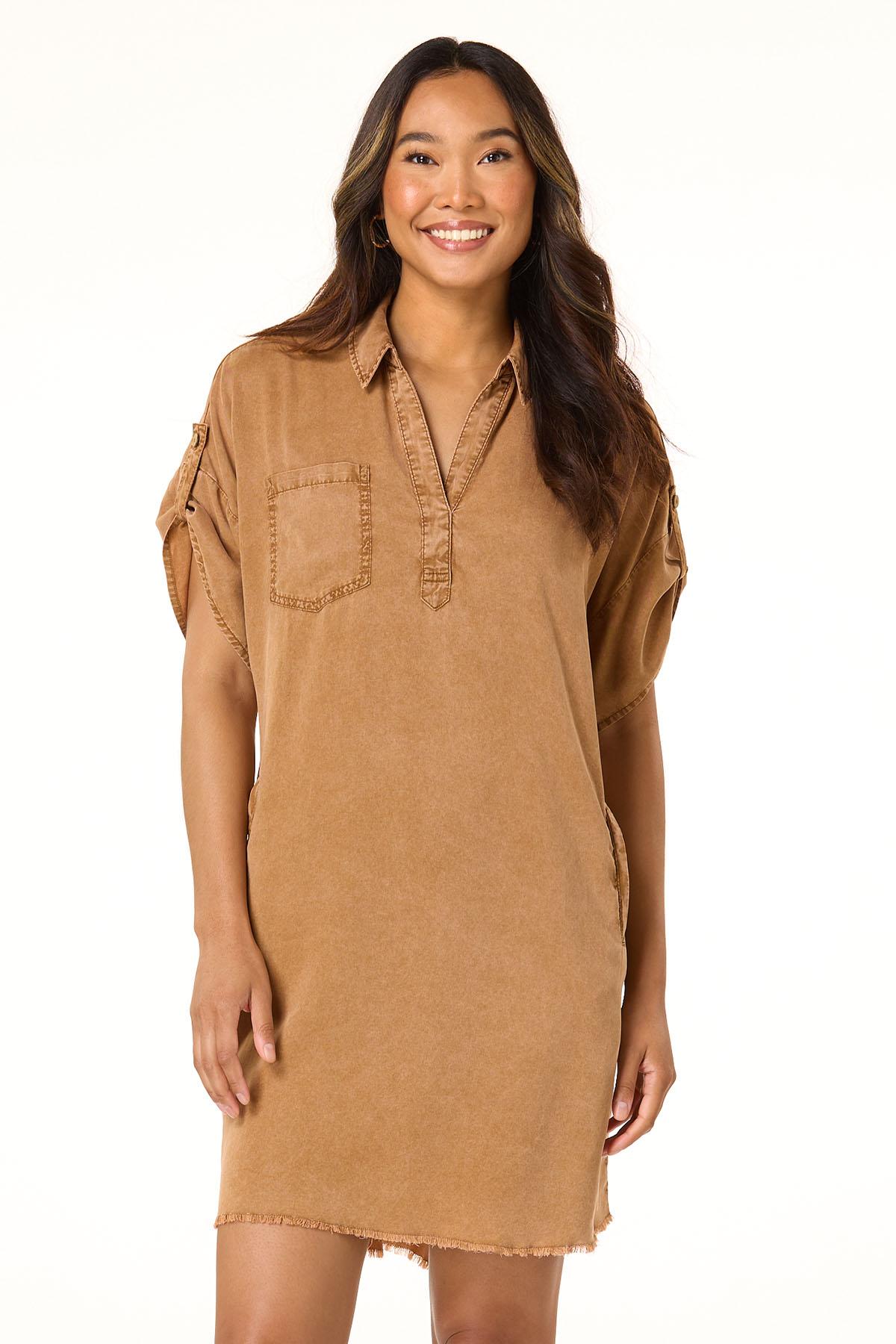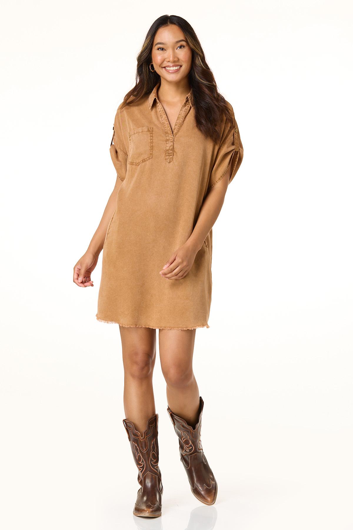 Breezy meets casual charm in this short sleeve chambray dress, featuring a frayed high-low hem and an earthy neutral hue that makes brown tones glow. Finished with side seam pockets for laid-back days, or for everyday ease.