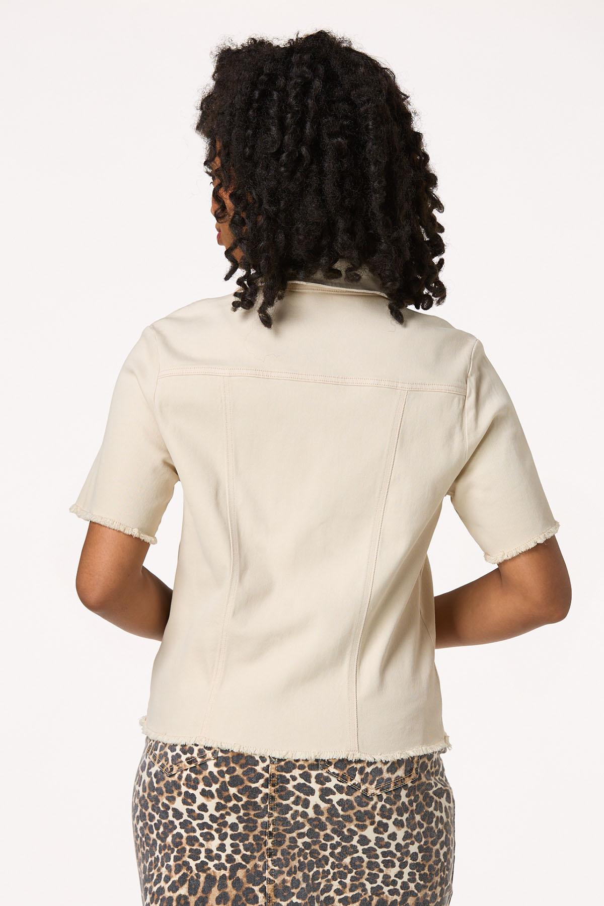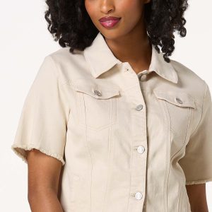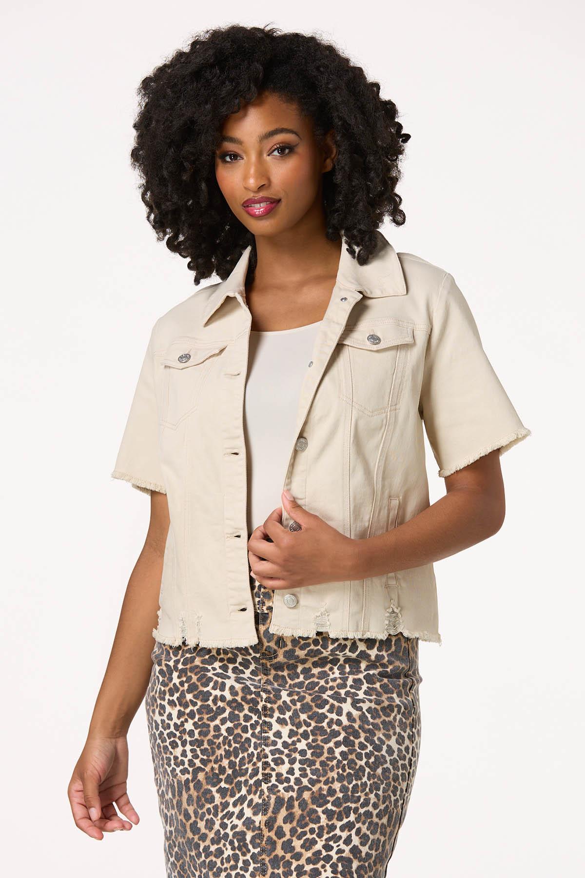 A casual and lightweight style perfect for chilly spring and summer nights. Classic denim fabric features a solid beige hue with a button-down front, a collared neckline, short sleeves, front breast and seam pockets and frayed-distressed details for a casual and so cute denim jacket.