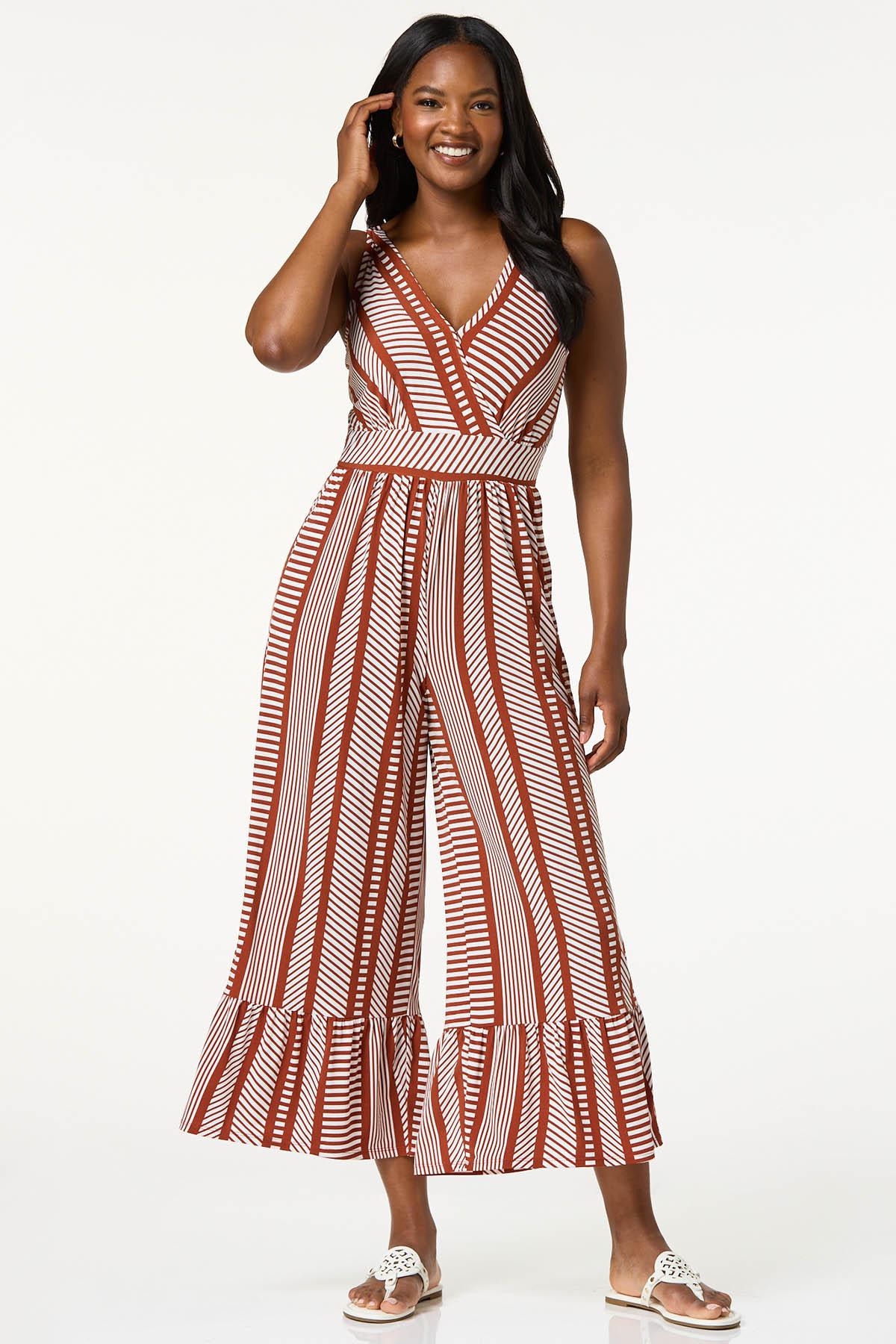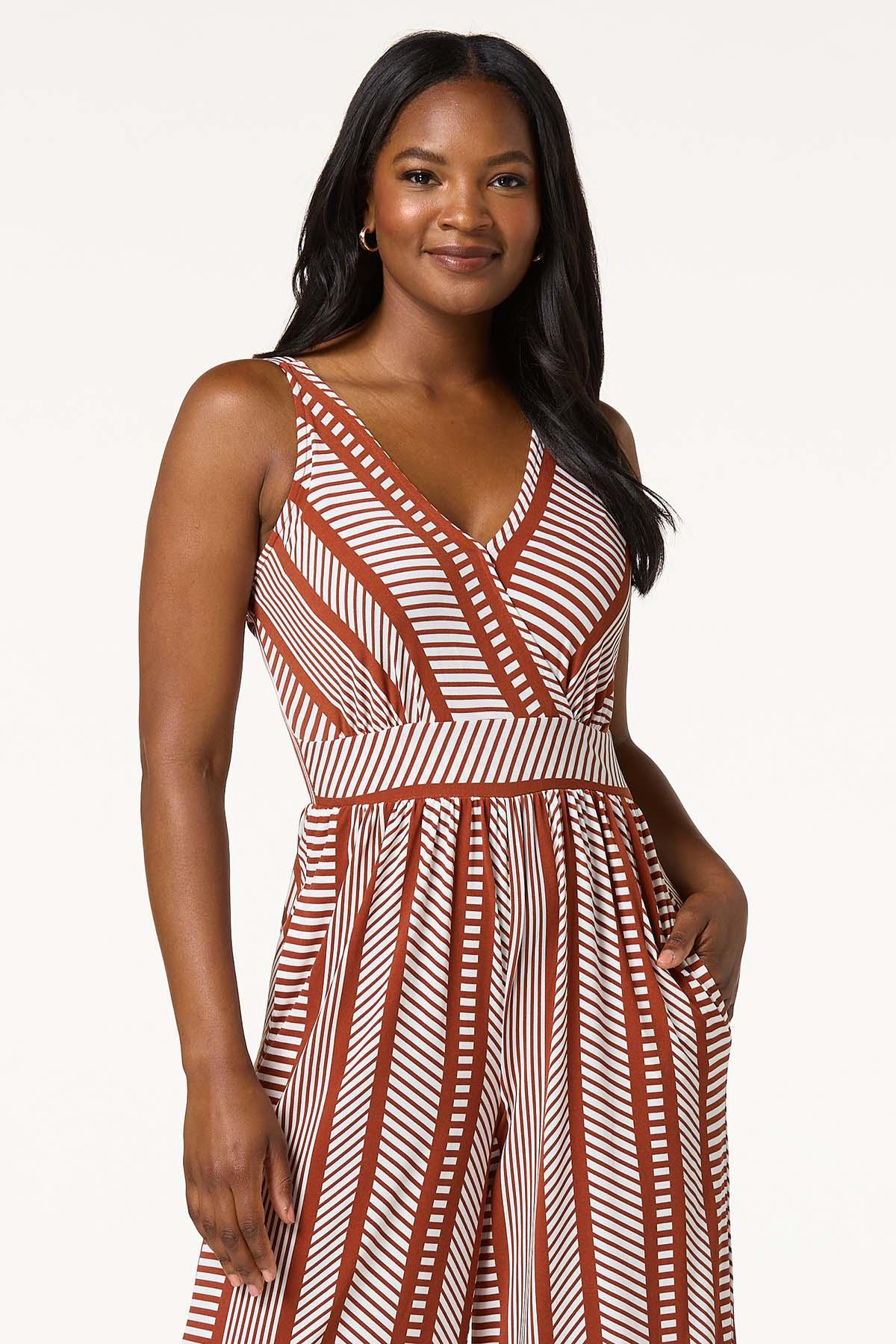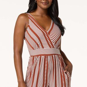 Feel fun, flirty and ready for the sun with this one. A surplice, v-neckline, sleek-stretchy knit and fun flounced hem top off a geo print and ginger brown and white hue. Effortless, adorable and perfect for those photo-taking moments.