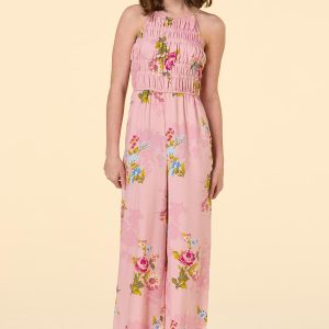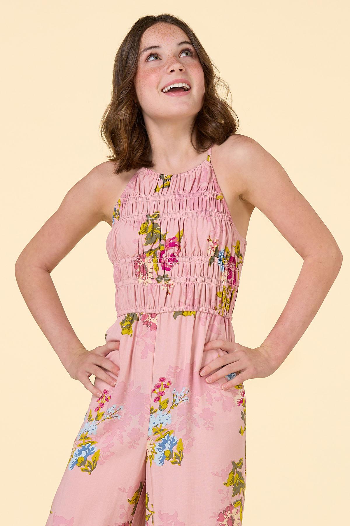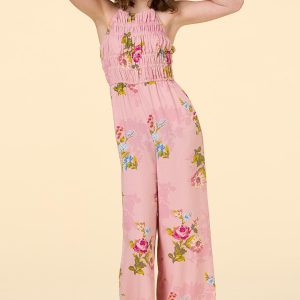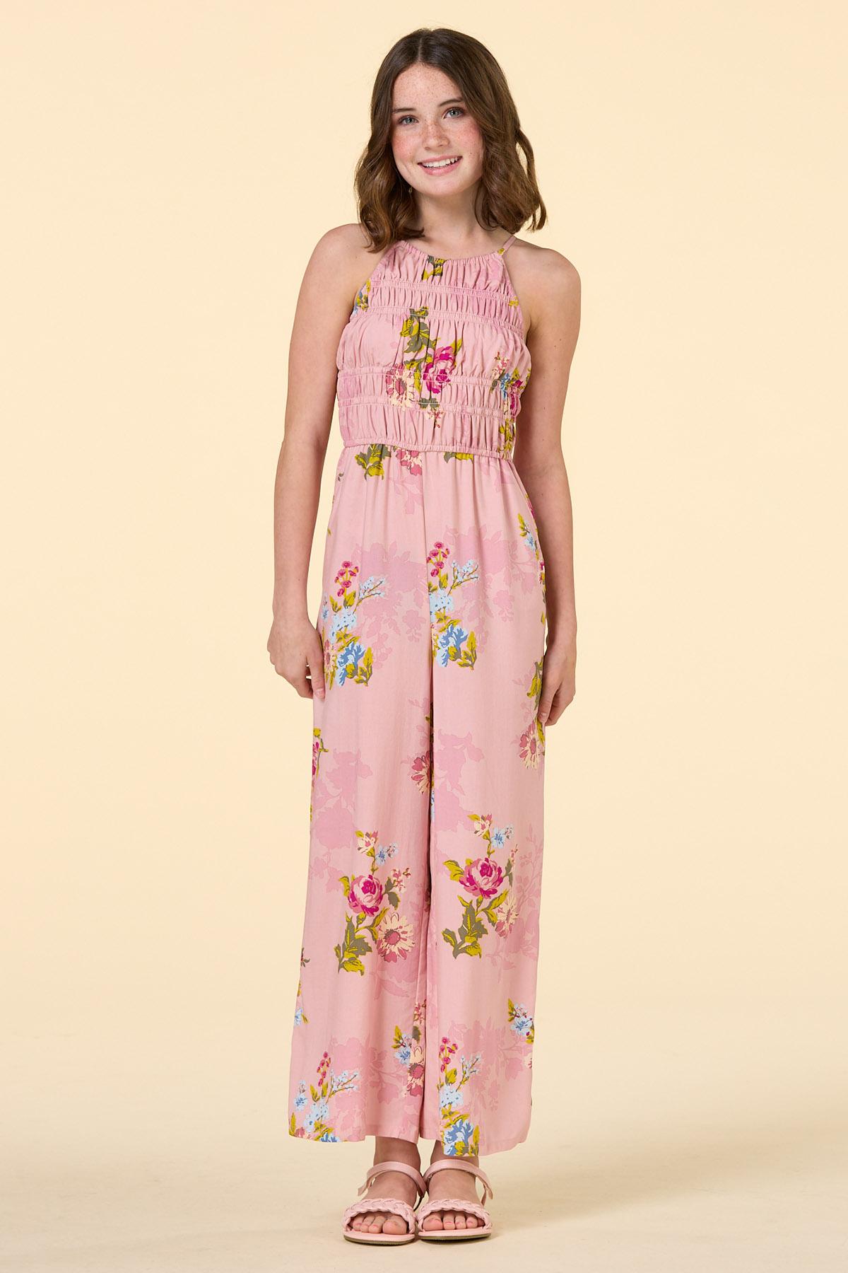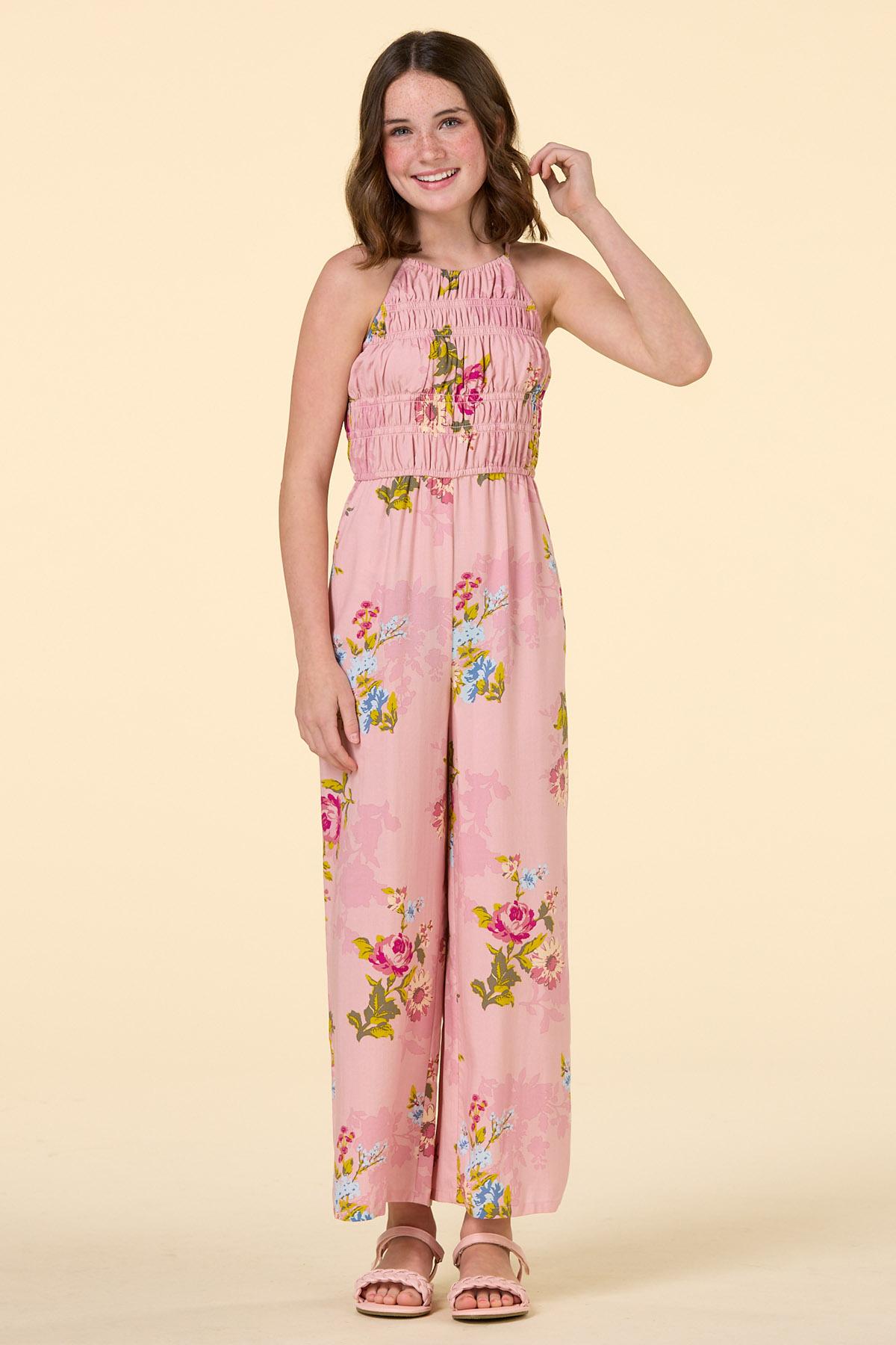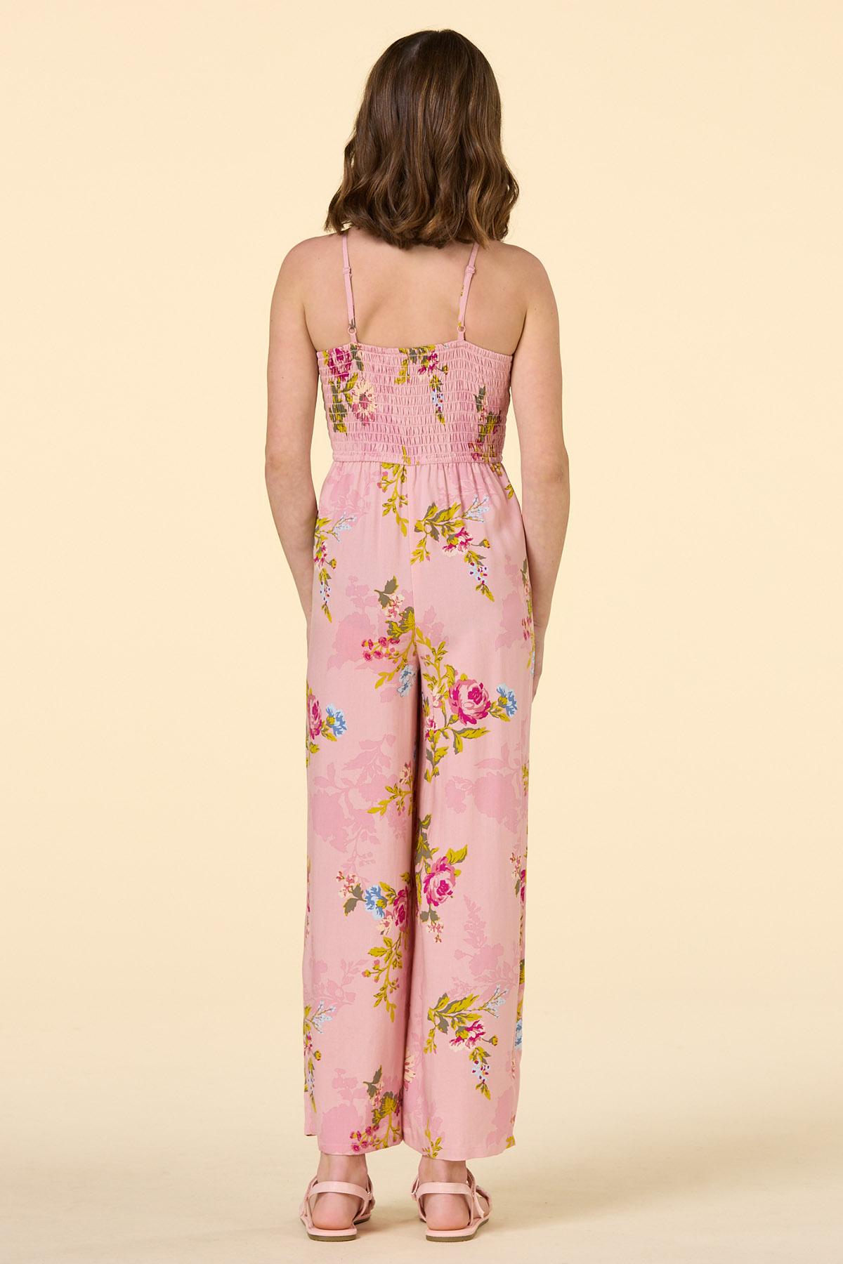 This blush pink jumpsuit features a dreamy floral bloom print and adjustable shoulder straps for a perfect fit. A one-piece wonder that takes you from family gatherings to sidewalk strolls in style.