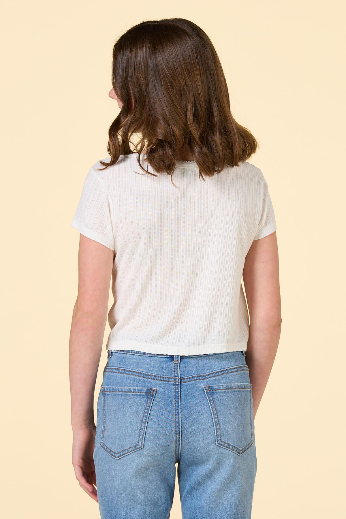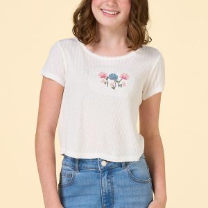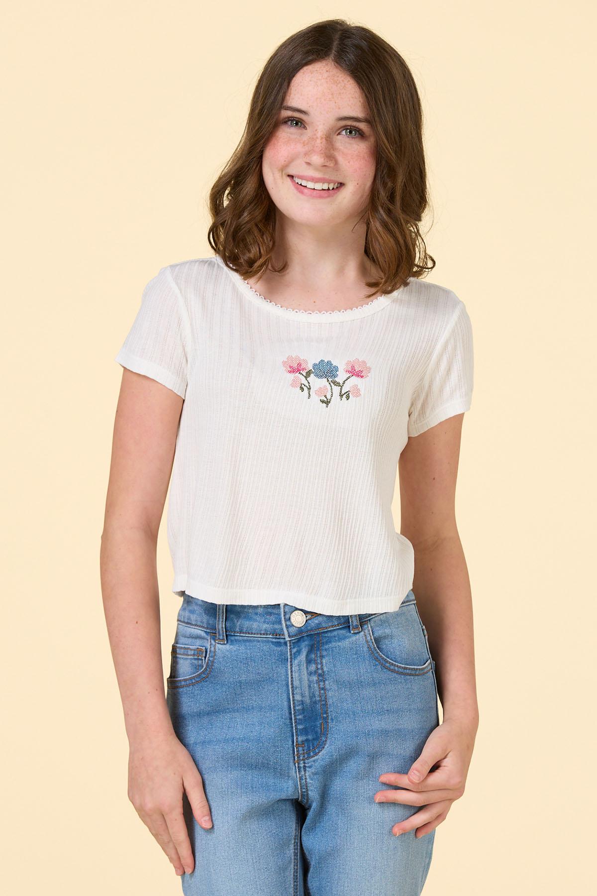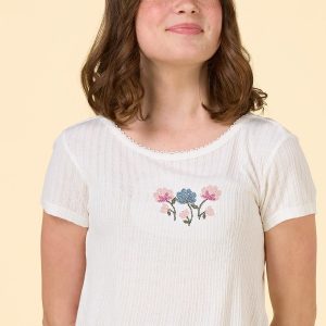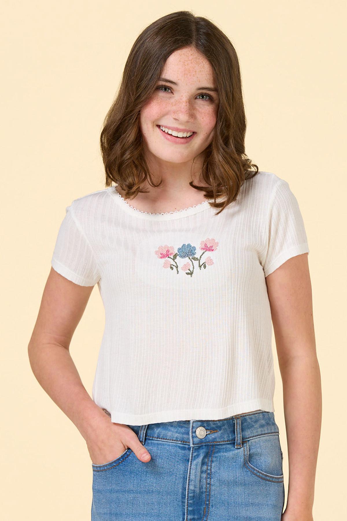 Denim days were made for this sweet style, featuring a pointelle knit, ivory hue and a pretty-floral print in a charming-embroidered design. Soft, stretchy, comfy and cute, too – this casual look is about to make your ‘fit a summertime favorite.