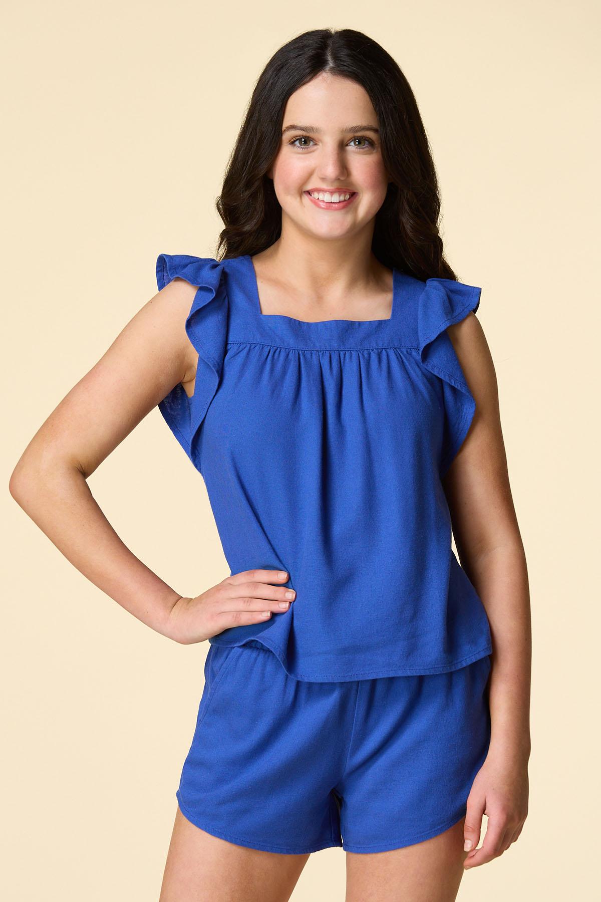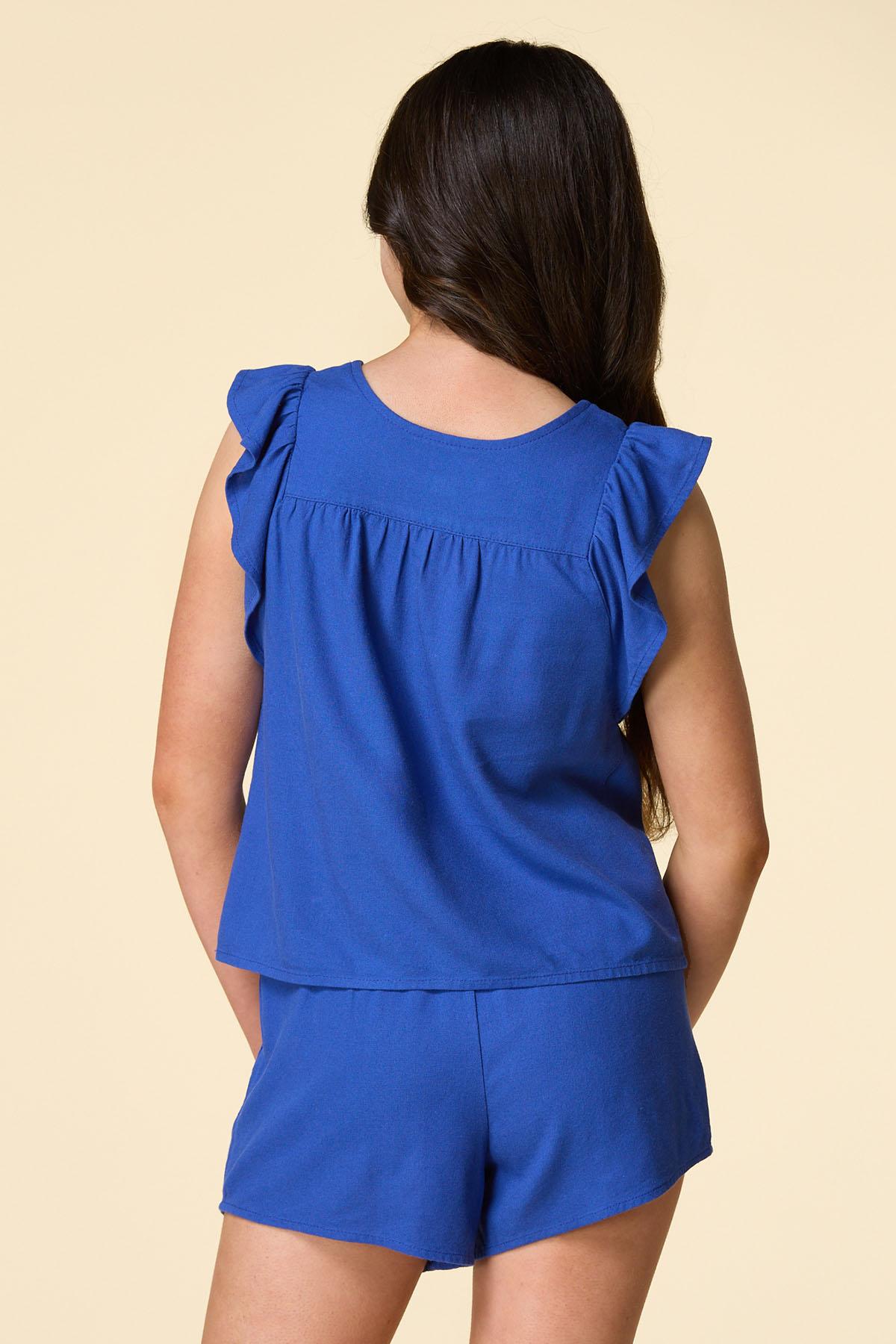 Simple and sweet are exactly what you get when you decide to add this crush to cart style to your closet. A pretty-shade of blue, flutter sleeves and linen blend top off an easy-breezy fit, making it the cherry on top to our matching linen shorts.