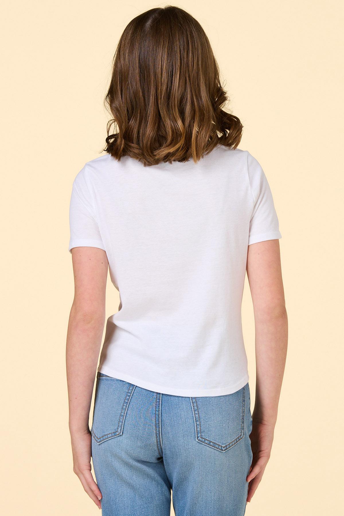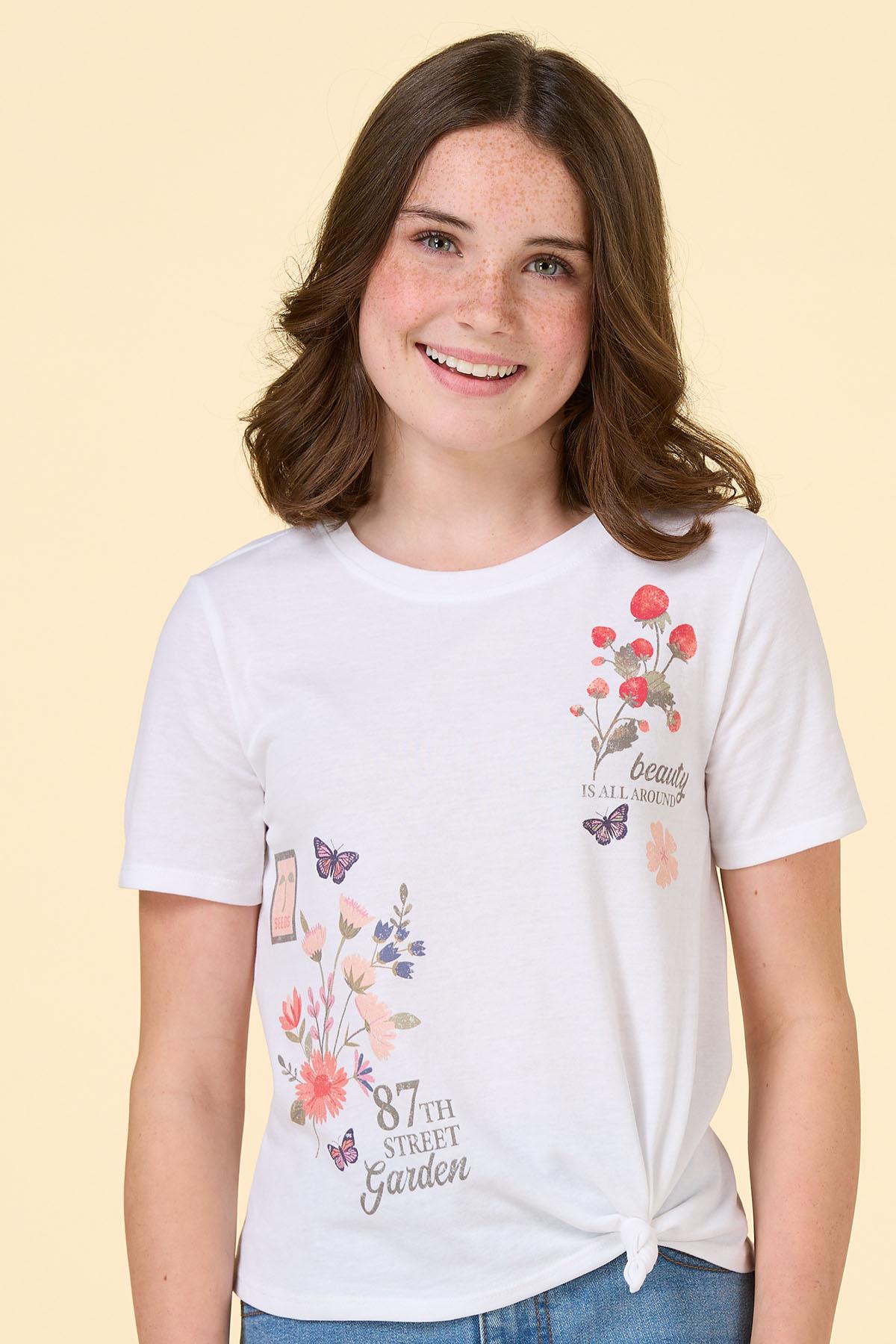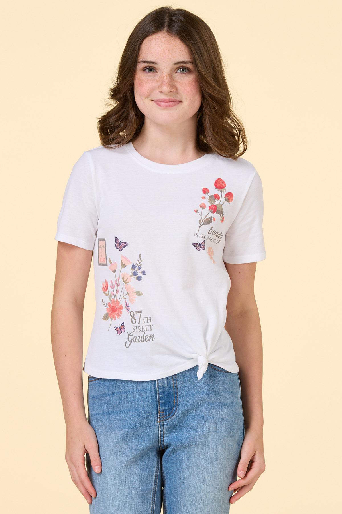 Summertime is looking to be extra sweet when you show up in this cute-tee, featuring a scoop neckline, buttery-soft feel, relaxed fit, tie hem and a whimsical floral graphic for a simple and sweet finish.