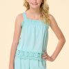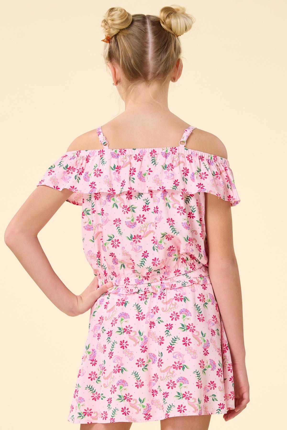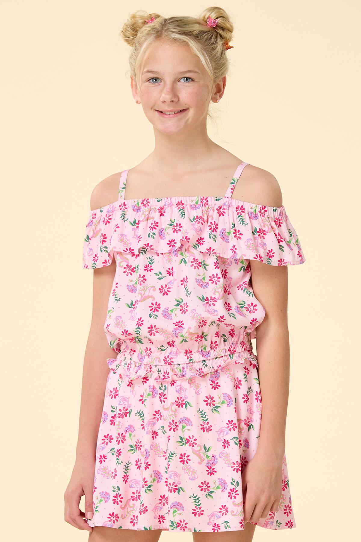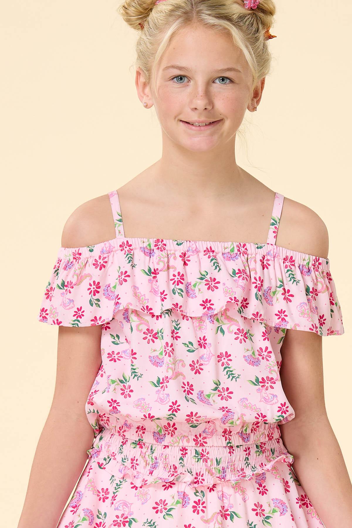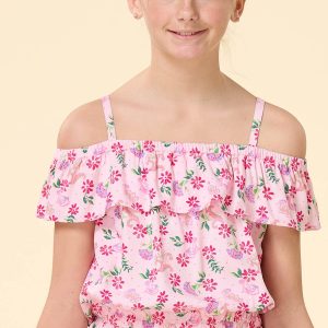 How fun to show up for the sun in this super-cute top! Lightweight-soft fabric features a light pink hue with a multicolor floral print, a square neckline with adjustable thin straps and a ruffled off-the-shoulder trim and an elastic band hem for a comfortable springtime style. Wear with our matching Girls Pink Floral Ruffle Skort for a full-body outfit that’s double the fun and double the style.