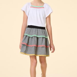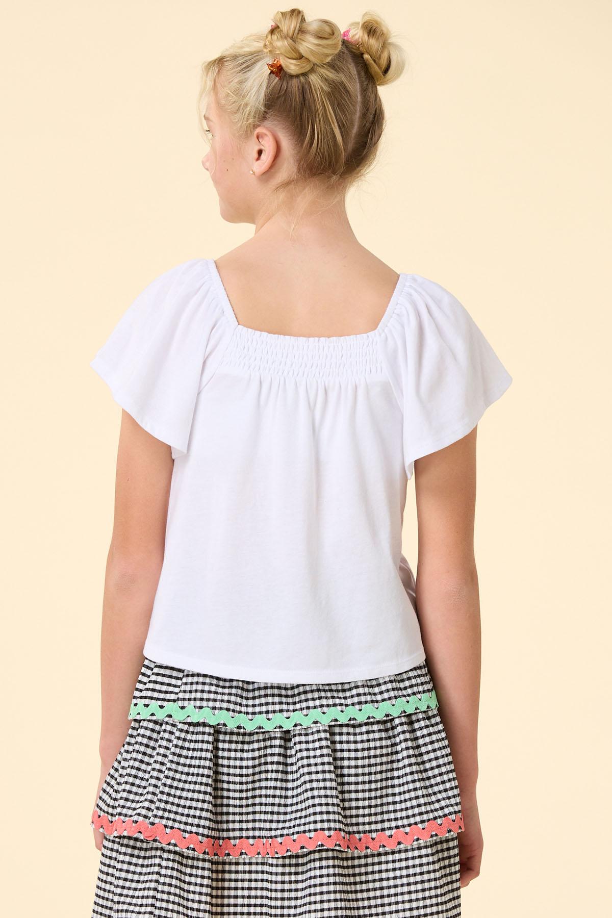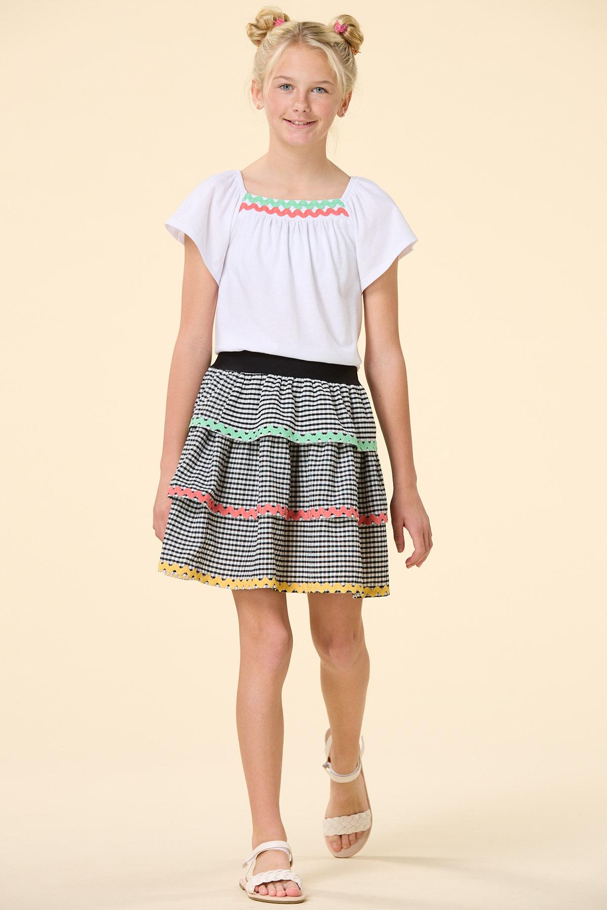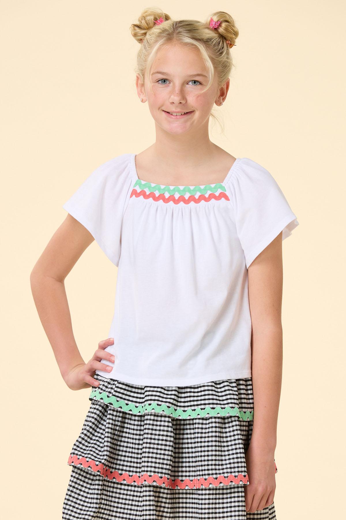Doll up your day with the sweet look of this soft knit style, featuring a bright white hue, flutter sleeves and ric rac trim in a pretty pink and green hue. Our coordinating skirt in a gingham print is the perfect pick and will have all your friends loving your ‘fit.