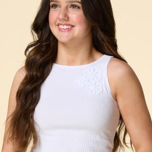 Looking cute comes easy with this sleeveless style, featuring a soft-ribbed knit, scoop neckline, floral applique detail and ruched sides for a flattering and comfortable fit.